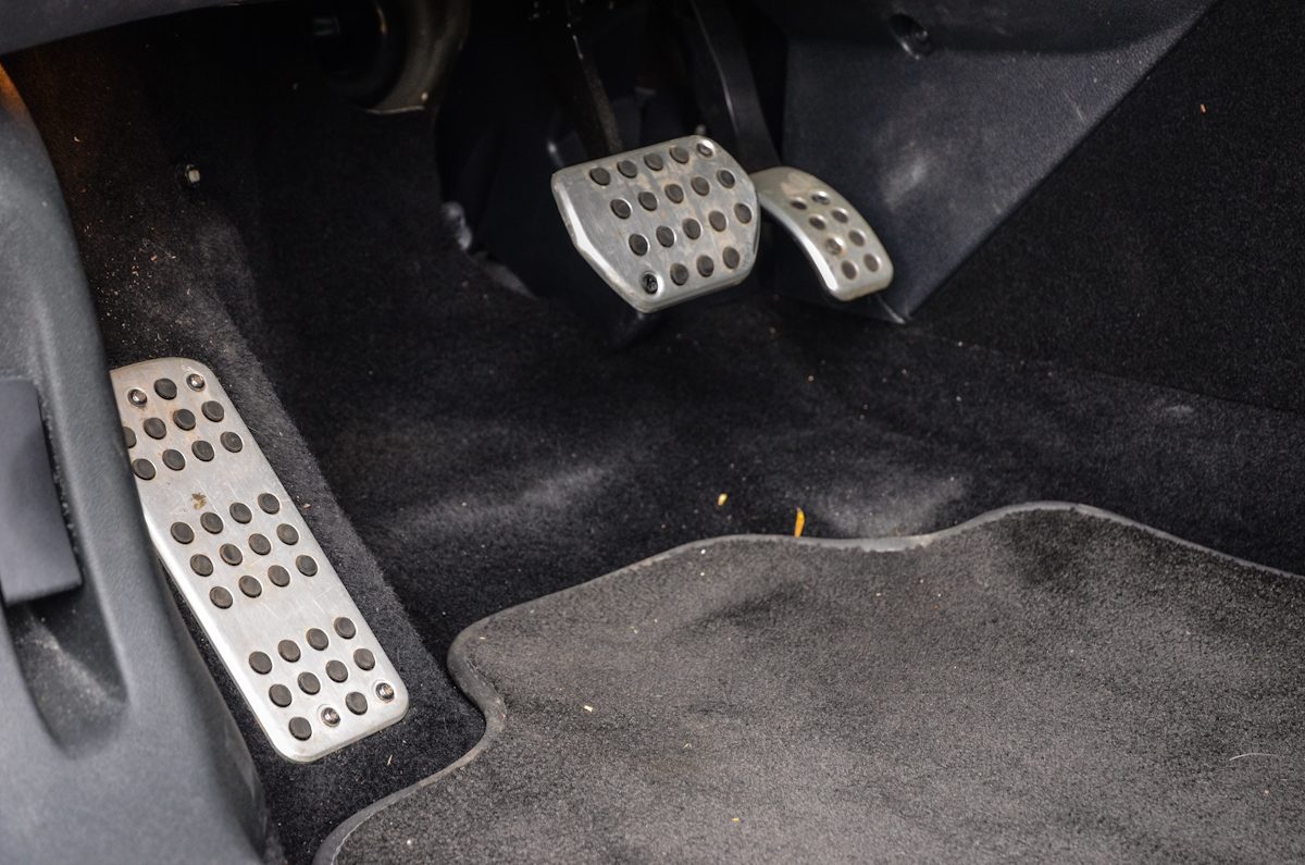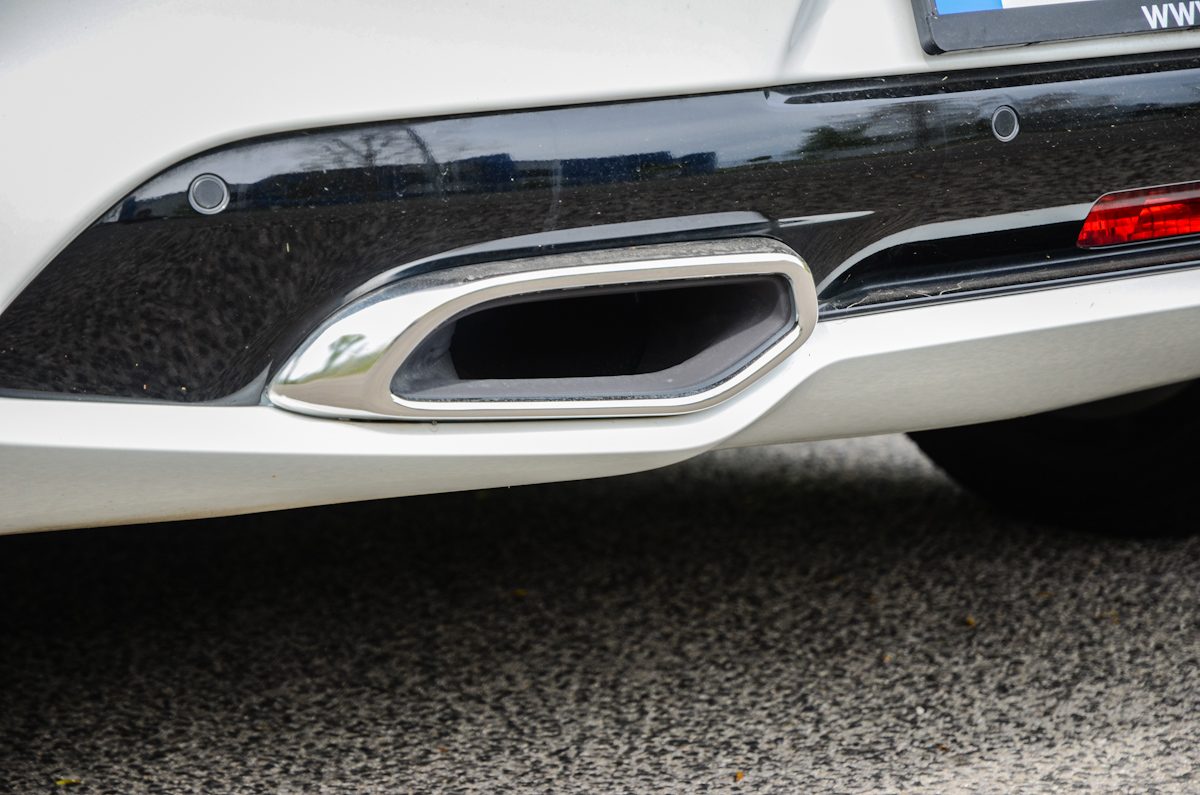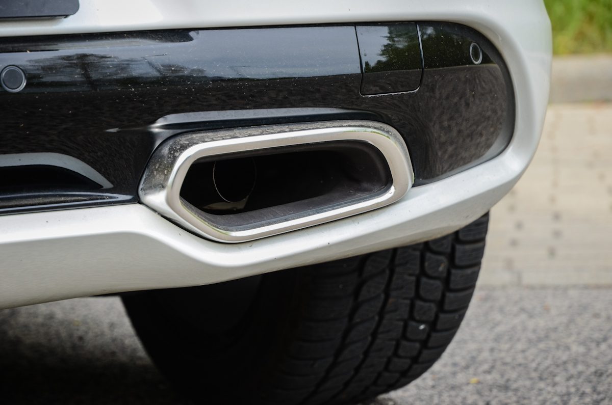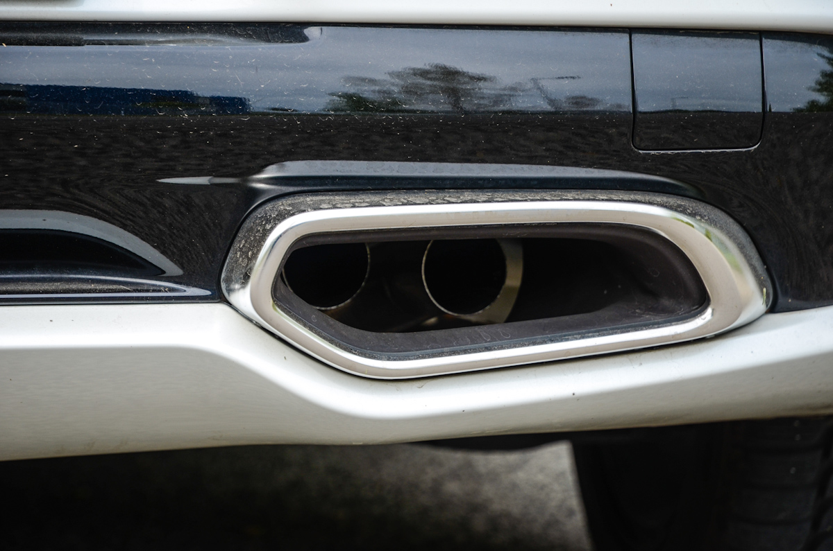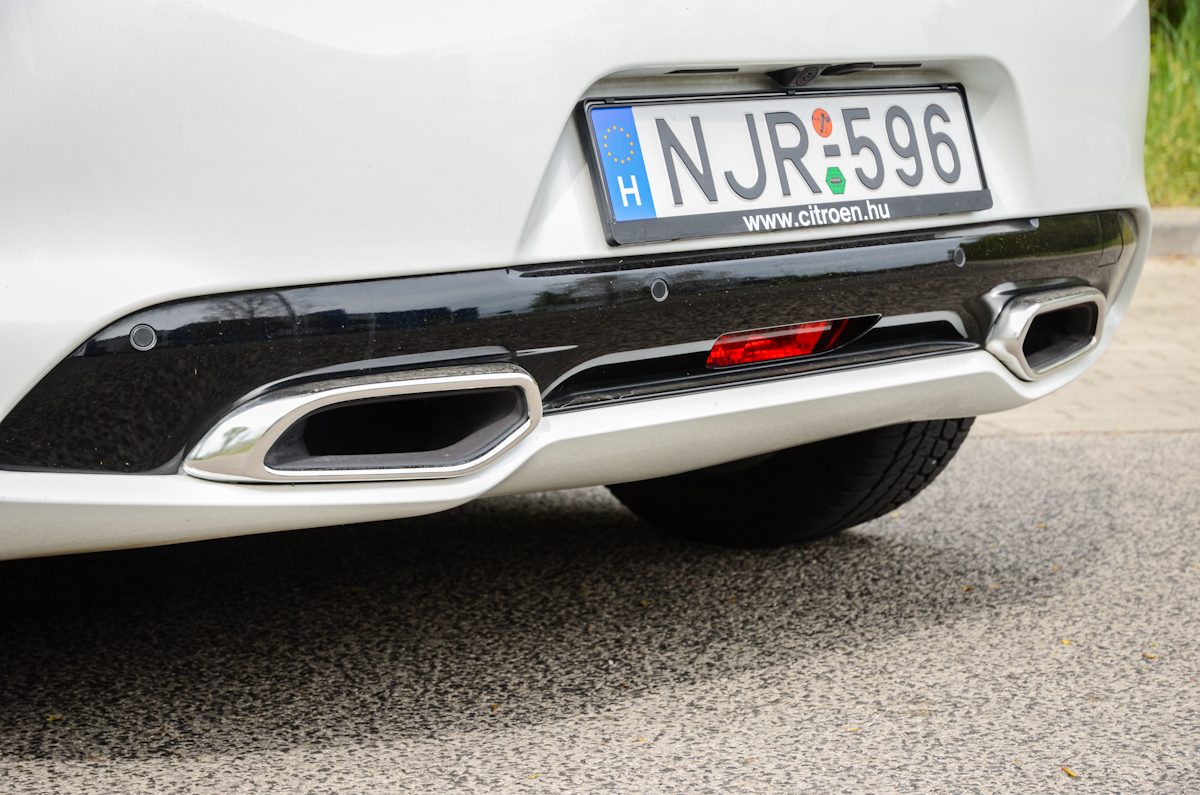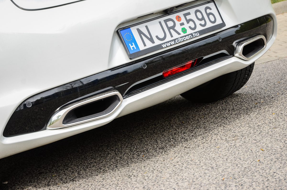 Erőt sugárzó a széles hátsó és a két, méretes trapéz-szerű kipufogó. Utóbbi csak dísz, mögötte egy-egy kör keresztmetszetű csőből áramlik ki az égéstermék