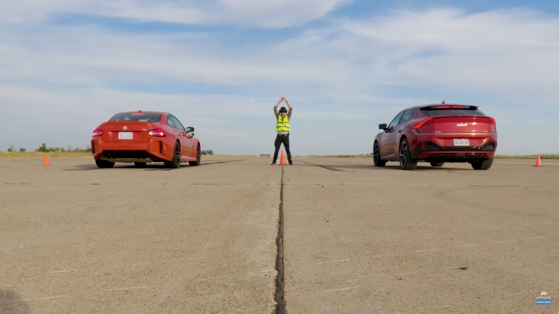 Sem az M2-es BMW, sem a Kia EV6 GT nem nevezhető olcsó autónak: előbbi alapára bő 28 millió forint, míg utóbbi 31,5 millió forinttól indul, kivéve, ha elektromos meghajtása miatt sikerül valamilyen kedvezményt igénybe venni. De ha már valakinek rendelkezésére áll körülbelül 30 millió forint, két teljesen különböző irányba indulhat el az autóválasztás során: egy családi, elektromos SUV-ot szeretne, vagy egy kompakt német sportkupét? Elsőre nyilván a BMW hangozhat a jobb sportautónak, de az alábbi gyorsulási megmérettetés megmutatja, hogy sokkal szorosabb a verseny a két autó között, mint gondolnánk.