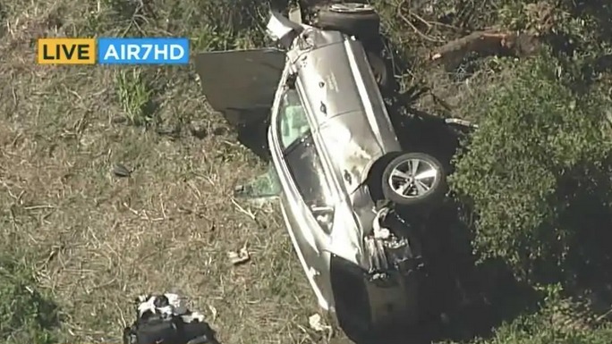 Felborult autójával a golflegenda, Tiger Woods. A sportolót a tűzoltók szabadították ki az autóból, ami a bal oldalán állt meg.