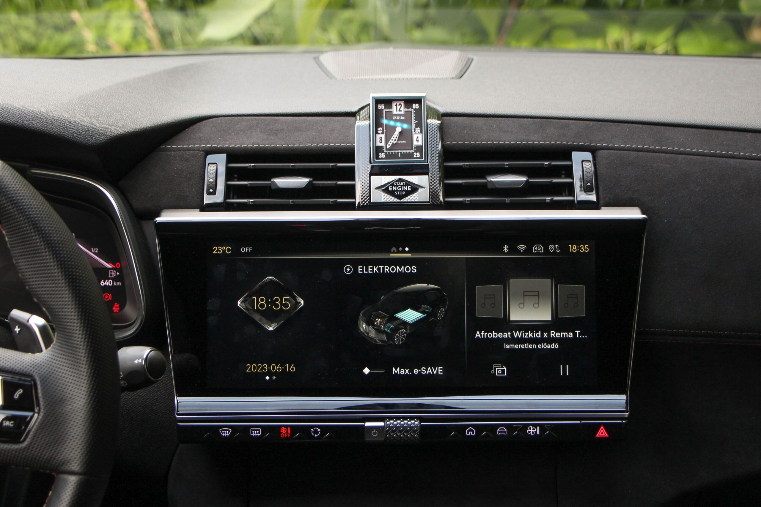 Bent már nem olyan nagy a változás, aki már ült DS-ben, mindent magától értetődőnek fog találni, aki viszont még nem ült a francia luxusmárka termékeiben, egy kicsit talán túlbonyolítottak fogja találni. Ám ez hamar elmúlik, amint hozzászokik az extravagáns megoldásokhoz, például a kardánalagútra helyezett ablakemelő gombokhoz, vagy épp az indítógomb pozíciójához, ami a középkonzol tetején kapott helyet a felnyíló, illetve lecsukódó analóg óra alatt. Utóbbit továbbra is ki kell emelnem, nekem még mindig nagyon tetszik, egyáltalán nem érzem túltoltnak
