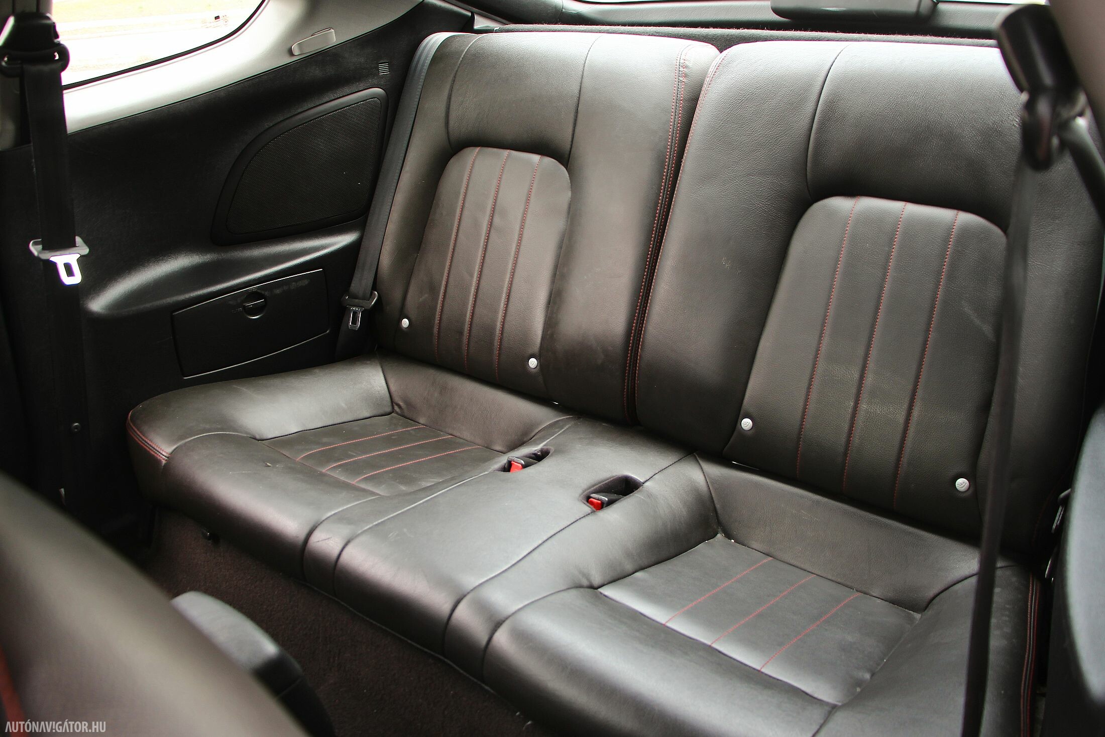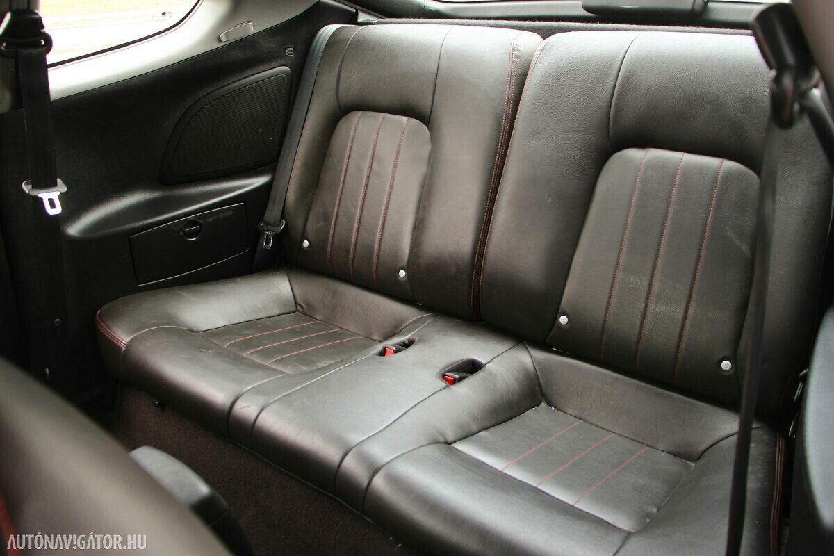 A dögös, keret nélküli ajtókon át az utastérbe jutva rendkívül kényelmes, sportos bőrülések várnak, bár ezeken is látszik már a kor, de nincs rajtuk szakadás. Hátul maximum gyerekek férnek el, az átlagos magasságú felnőtteknek már a plafont súrolja a feje búbjuk. A kormánykerék is fényesre kopott már, ettől eltekintve nincs semmi kivetnivaló rajta, esetleg annyi, hogy vékonyabb küllőkkel sportosabbnak tűnne. Ám ez inkább túrakupé, mint igazi sportautó, hamarosan erre is kitérek. További kopás az ajtóburkolatokon tűnik fel, viszont minden tökéletesen működik. Az ülésfűtés szépen lassan, nem túl hirtelen fűt fel, a műszerfal jobb szélén pohártartó nyílik, a légkondi teszi a dolgát, illetve a középkonzolon a három vérpezsdítő mérőműszer is hangulatos díszítőelem. Az egyetlen negatívum, amit megemlíthetek, az a hátsó ülések fogantyújának a hiánya, amelyekkel a háttámlákat lehetne dönteni, hogy az alaphelyzetben 420 literes csomagtér mérete növelhető legyen. Ezeket szemmel láthatóan kitörtek a helyükről. A mechanizmus így is hozzáférhető, de inkább nem erőszakoskodtam vele.