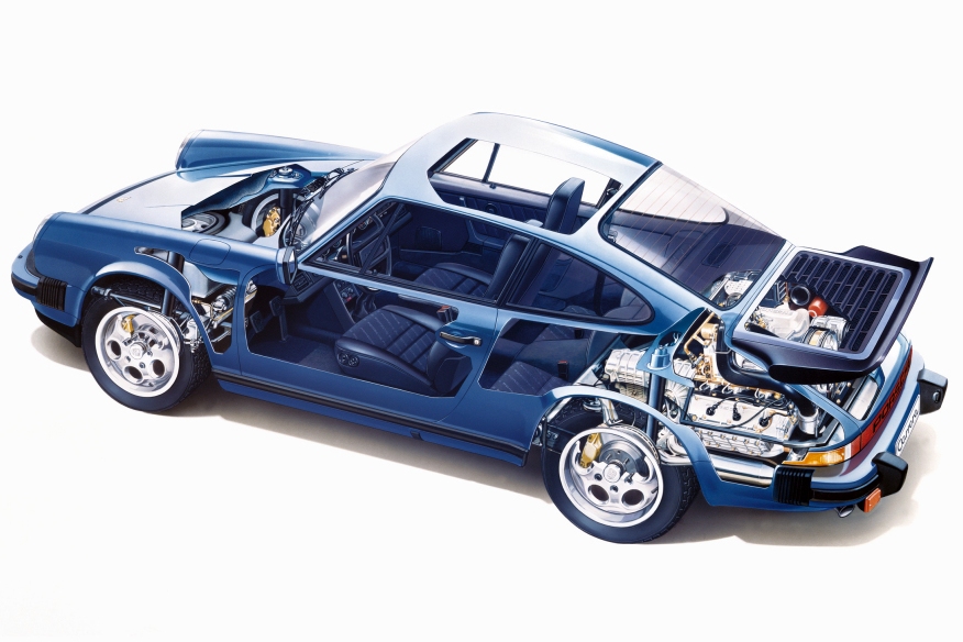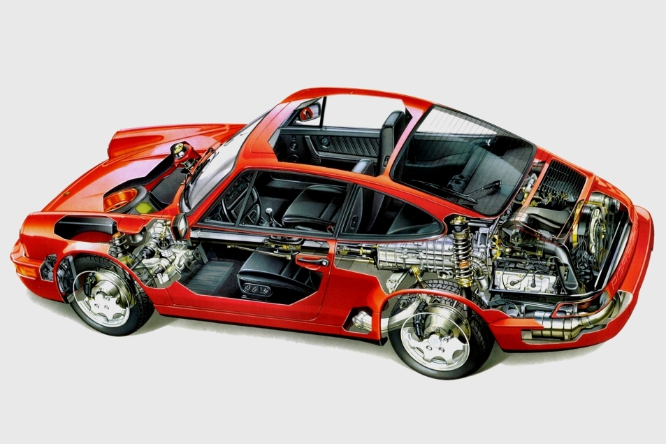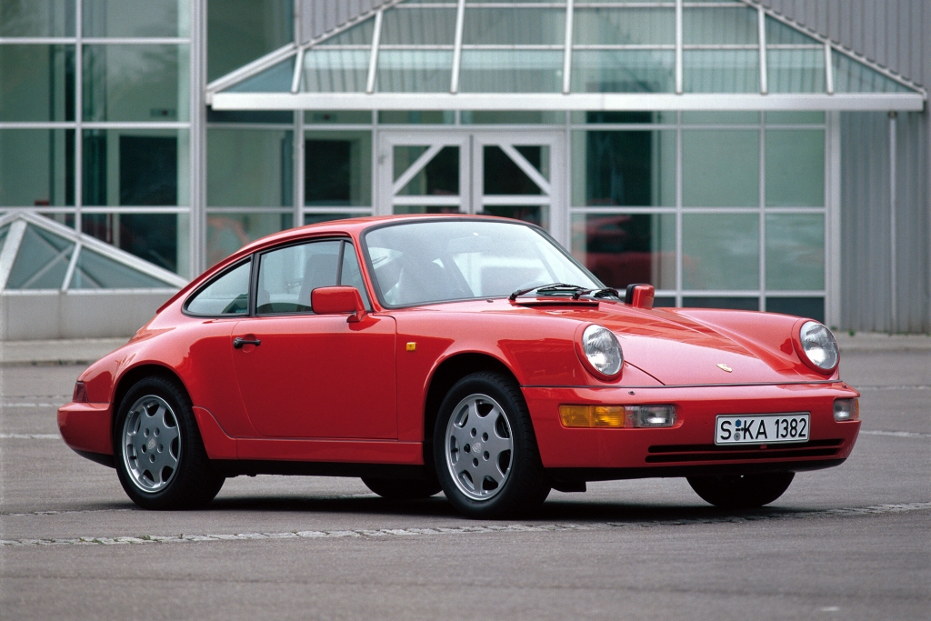 Balra a legkésőbbi évjáratú, még eredeti 911-es, a VW Bogár stílusában még torziós rugókkal. Utódja a 964 kódú 911 Carrera ABS-t kapott és csavarrugókat. Ahogy a harmadik képen látszik, összkerékhajtással is lehetett már rendelni