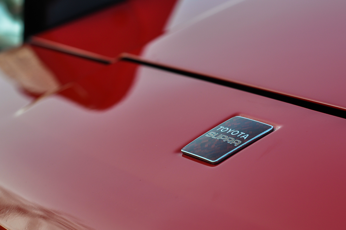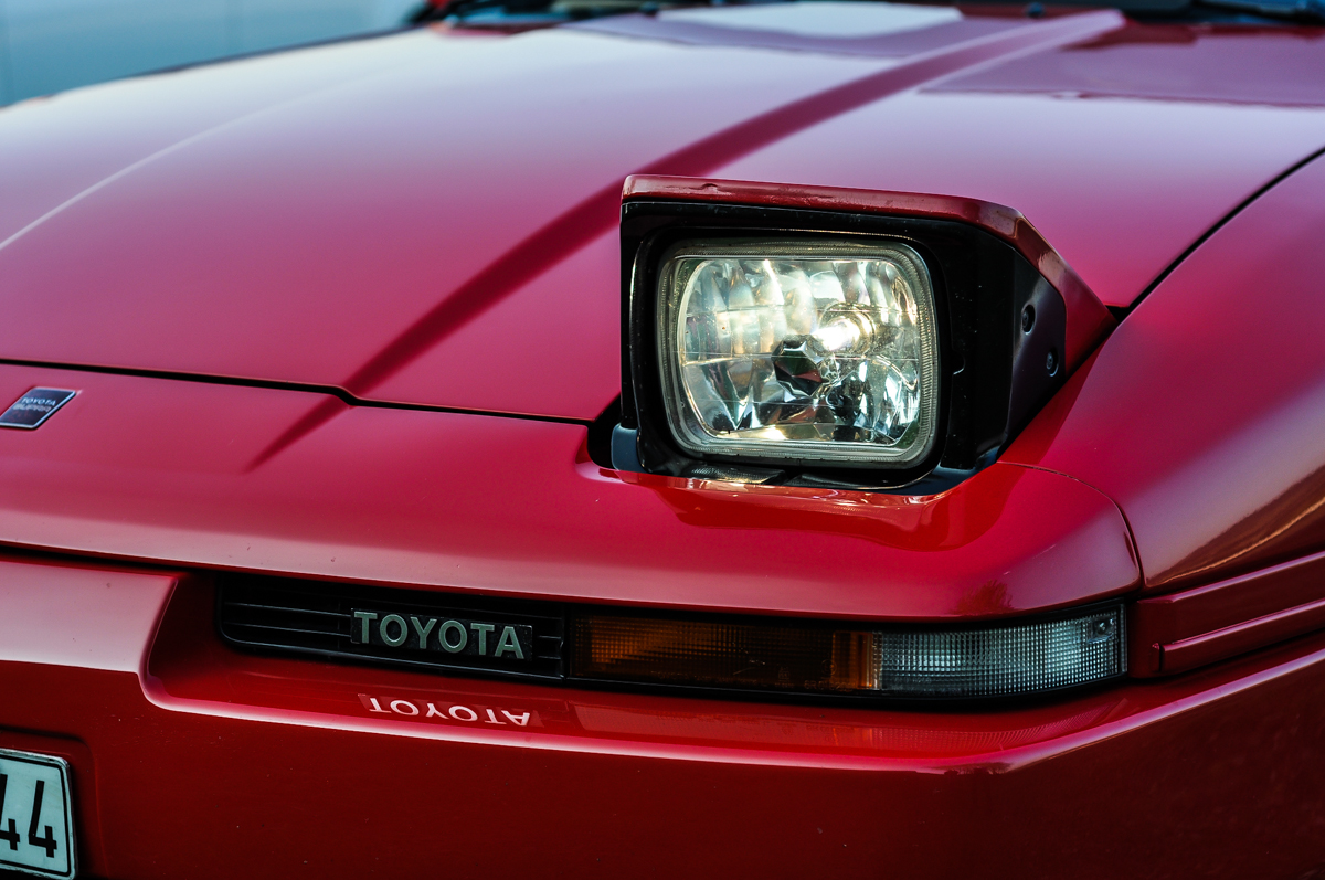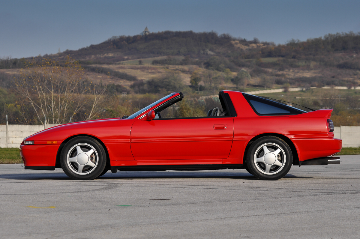 Vörös színben, felnyitott fényszórókkal és levett targatetővel a legmenőbb a Supra MK3. Szemből mutatja legjobban szélességét