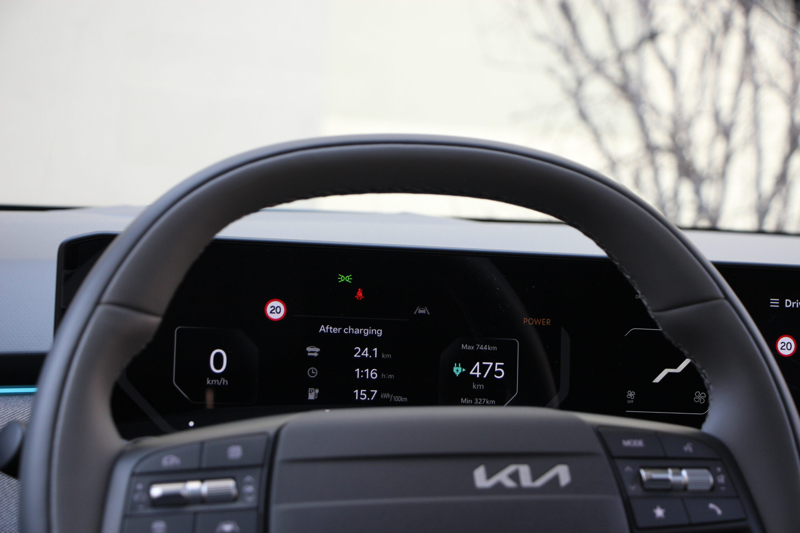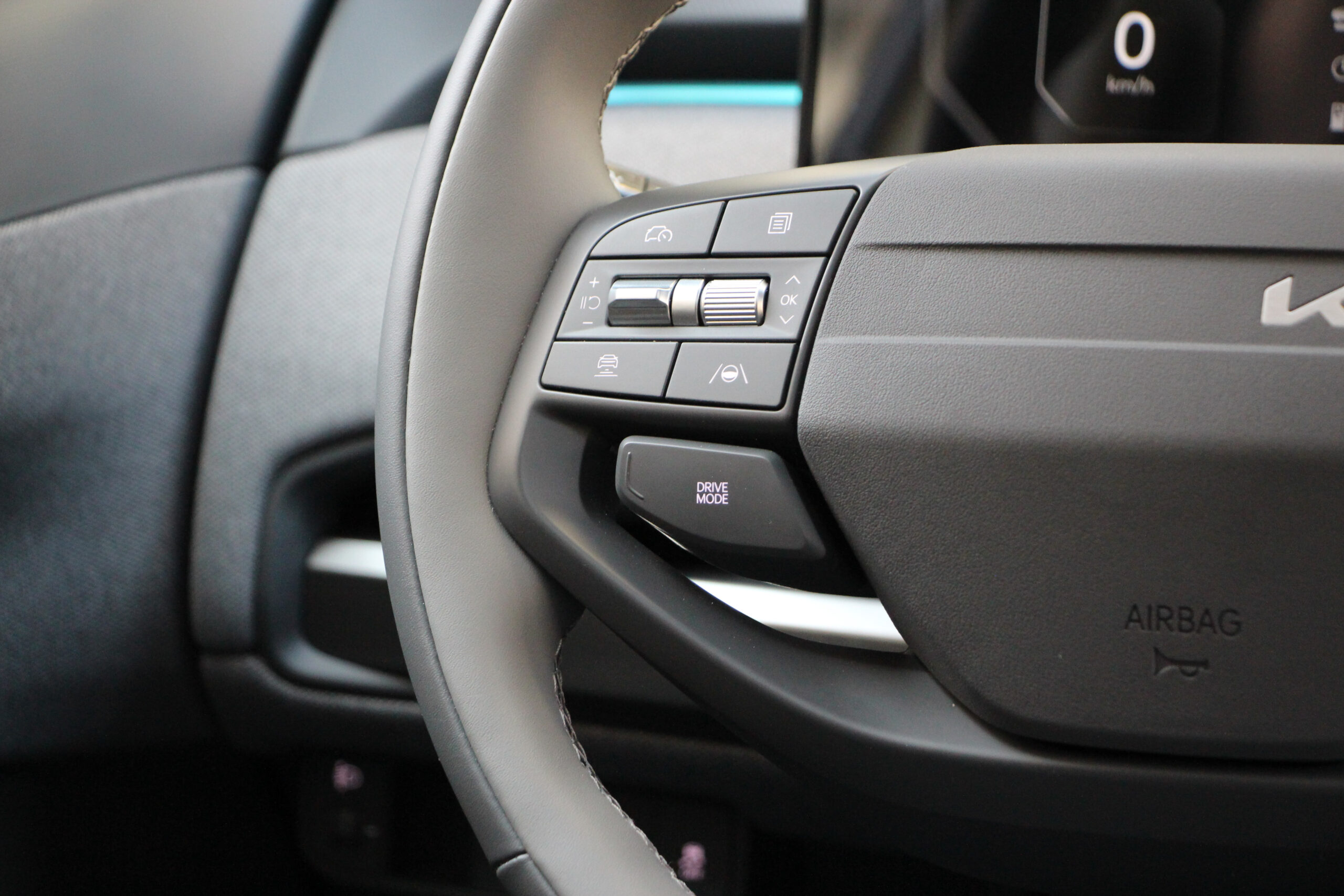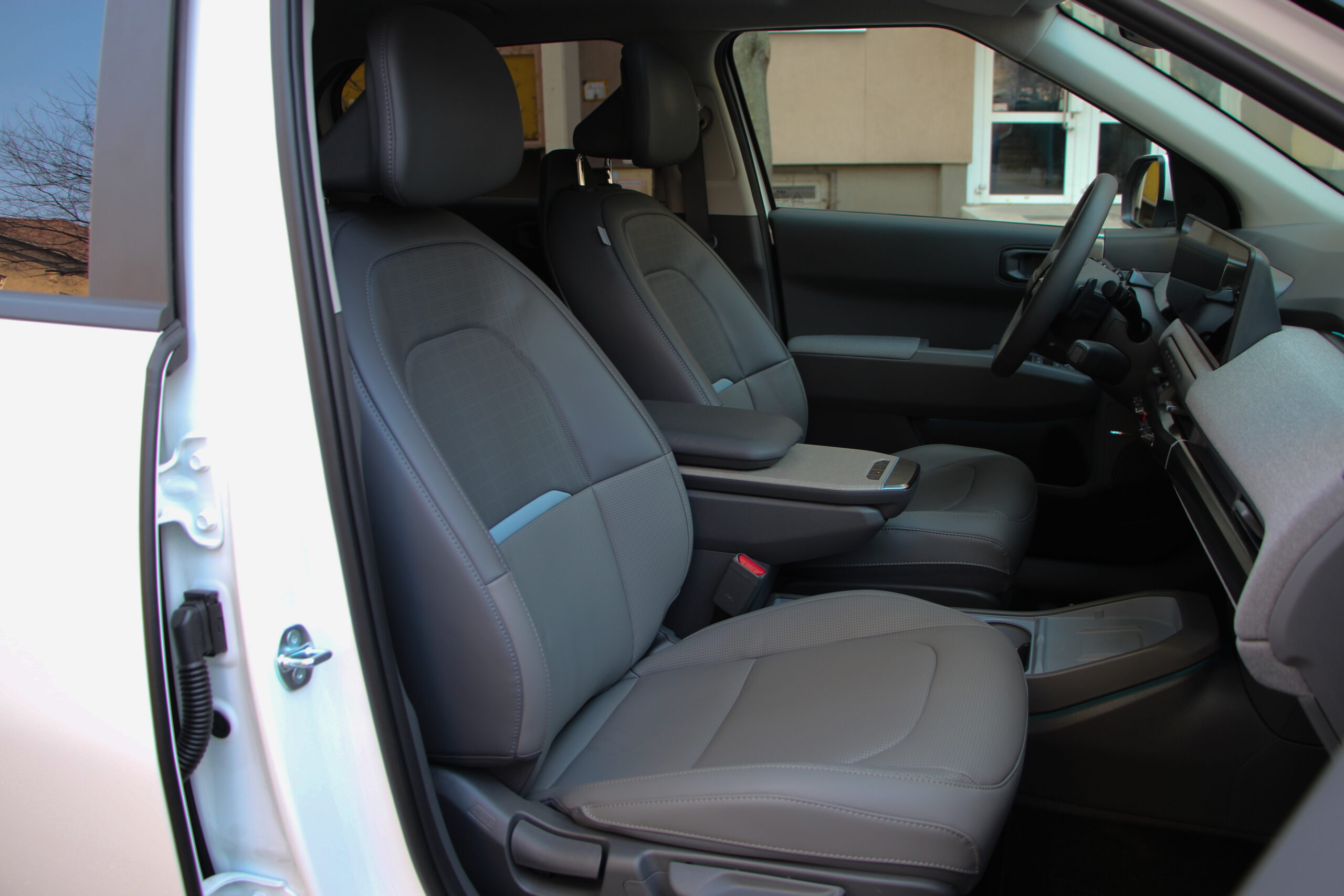 Bent is akad némi különbség a GT Line és az Earth Plus felszereltségű modellek között. Mondjuk ez főleg a kormánykereket és az üléseket jelenti. A GT Line-ban háromküllős, míg a másikban teljesen más kialakítású, és még a kormányra helyezett üzemmódválasztók is máshol helyezkednek el. Számomra külön öröm, hogy kapott tényleges ki-be kapcsológombot az autó, mert egyre inkább terjed az elektromos szekerek körében a beülsz és egyből menetkész megoldás, ami engem kimondottan idegesít. Bár nem tudom racionálisan megmagyarázni, miért. A lényeg, hogy az EV3-ast be kell indítani és le kell állítani, mint egy rendes autó, bár a gombot talán túlságosan is az irányváltó bajuszkapcsoló tövébe rejtették.