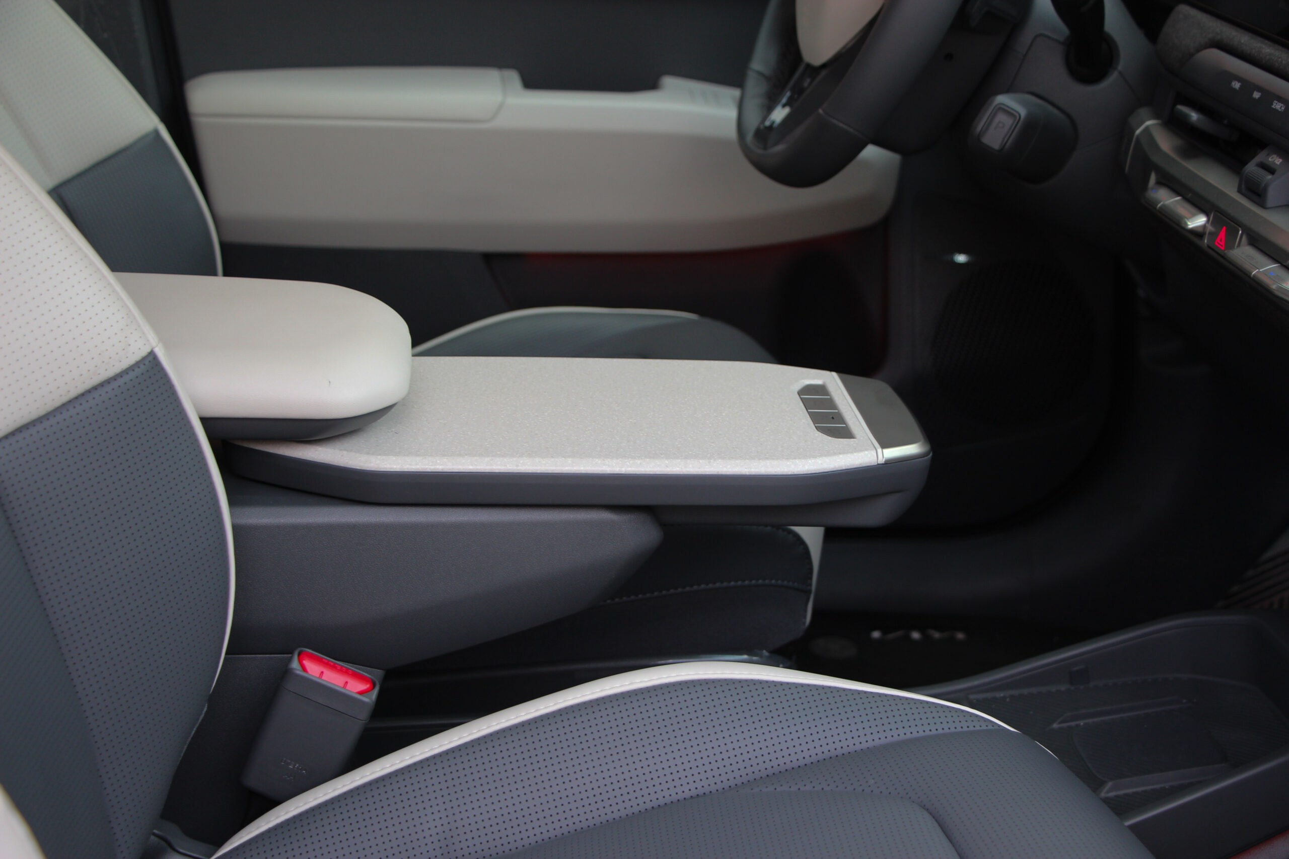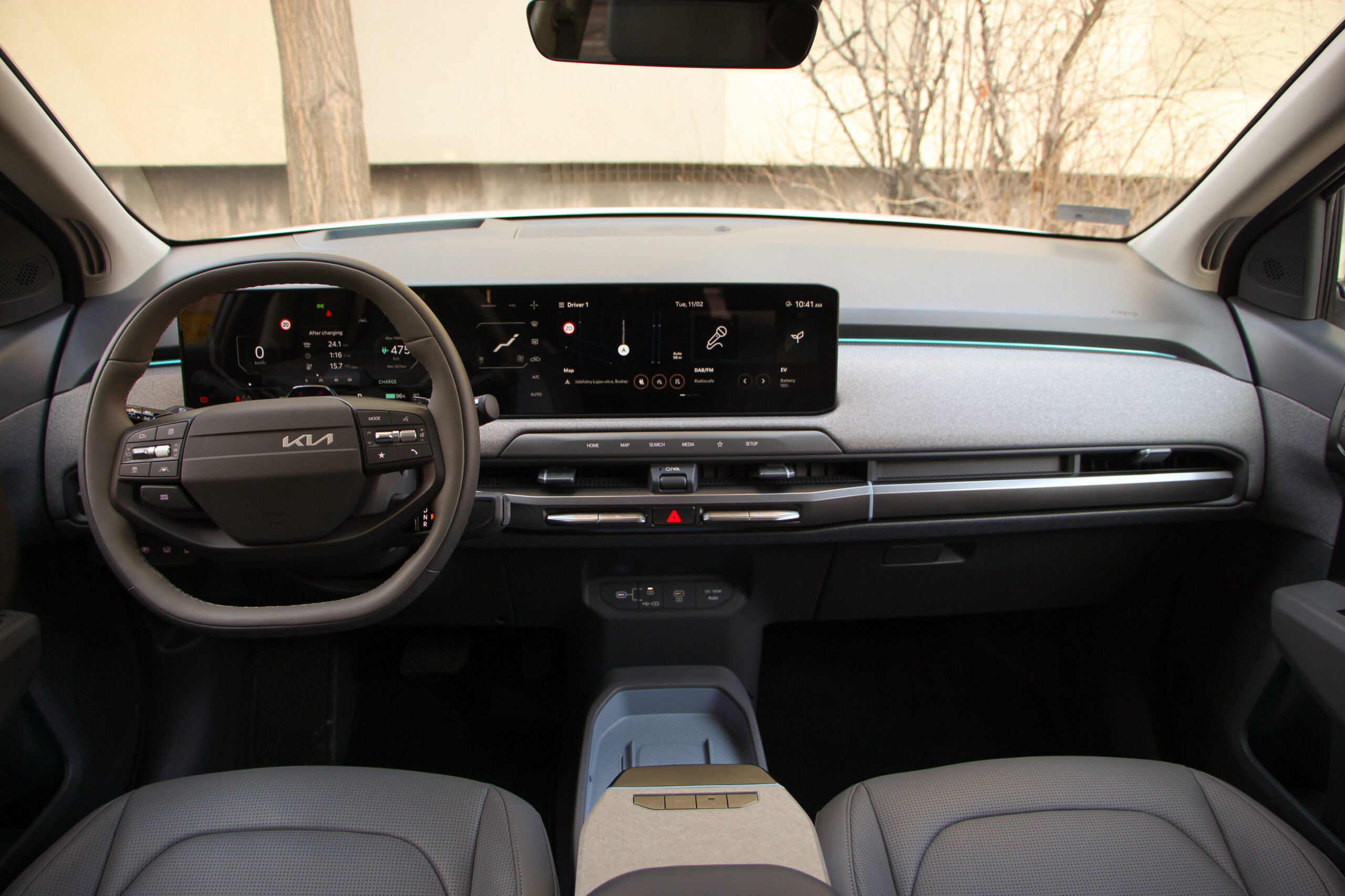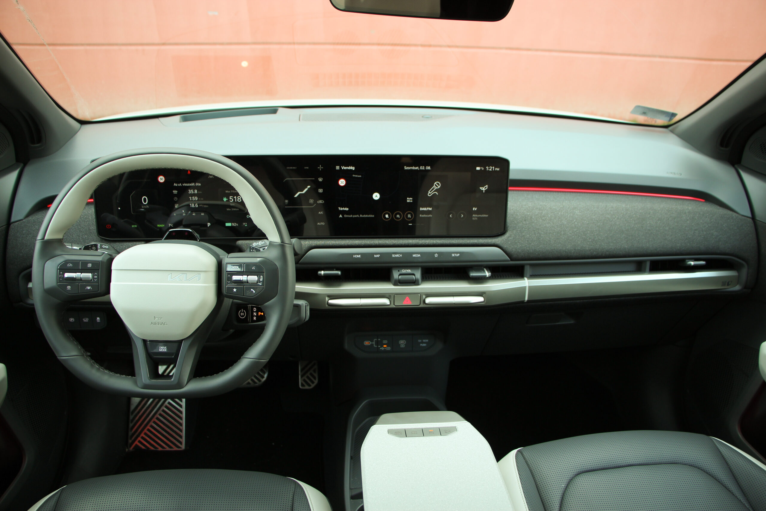 A műszerfal többi része megegyezik, ötletes a változtatható hosszúságú asztalka, am a kartámaszból húzható ki, viszont a kardánalagút helyén tátongó hatalmas rakodóhely nem zárható el a kíváncsi szemek elől. Szintén tetszik, hogy akad néhány fizikai gomb, ezekkel sokkal könnyebb kezelni a klímát, de az infotainment kezelése sem bonyolult a nagy „egybekijelzőn”. Ami itt is fantáziátlan, de ebben tettestárs az autóipar nagy része, a Kia is csak követi a divatot. Viszont szép a grafikája és a hármas osztás is logikus szerintem, csak egyetlen bakiját tapasztaltam. A vezető előtti műszercsoport és az infotainment kijelző között látható klíma menüt pont kitakarja a kormány karimája. A színek egyébként engem a ’90-es évek amerikai autóira emlékeztet, az anyaghasználatban pedig sok az újrahasznosított műanyag. Ez örvendetes és a kategóriából nem lóg ki a minőség, szóval nem kell félni az újrahasznosítósditól.