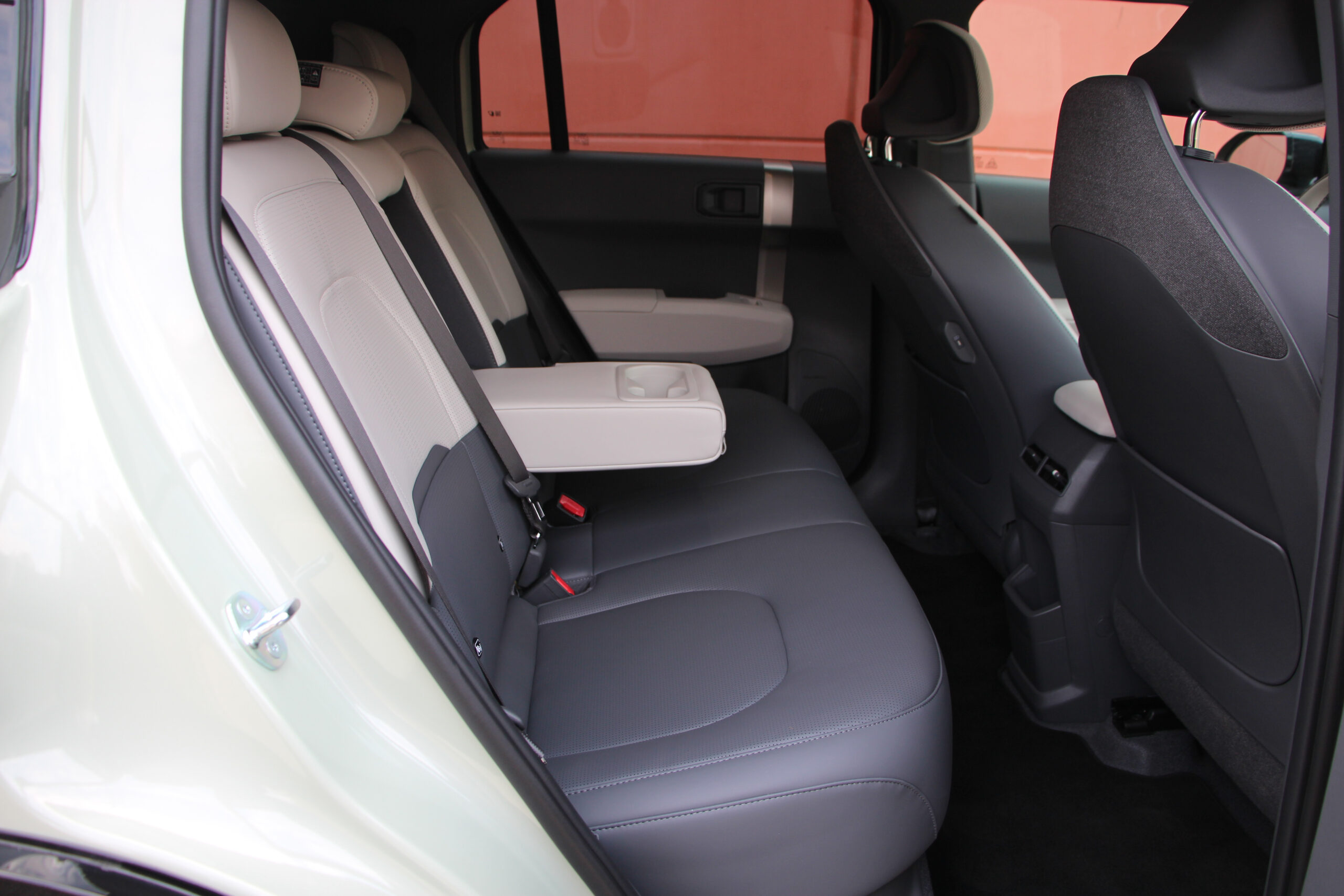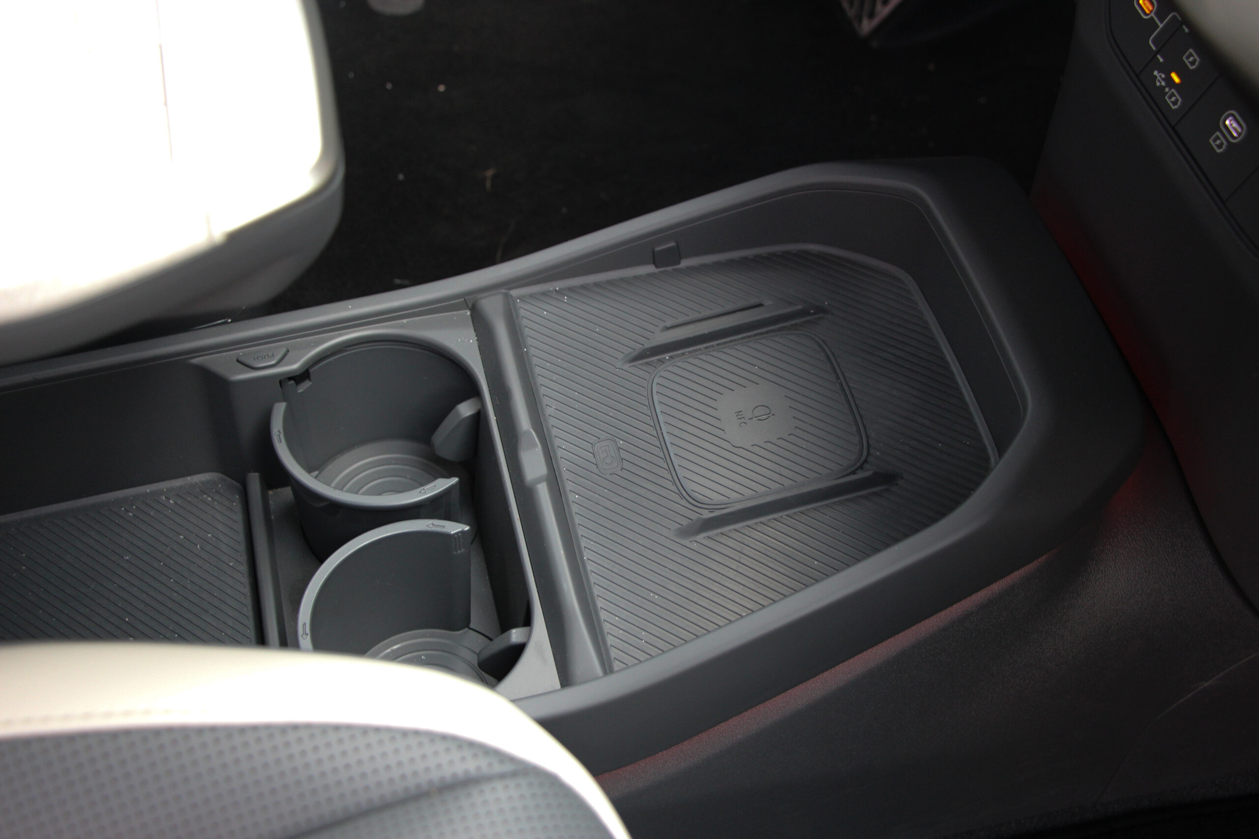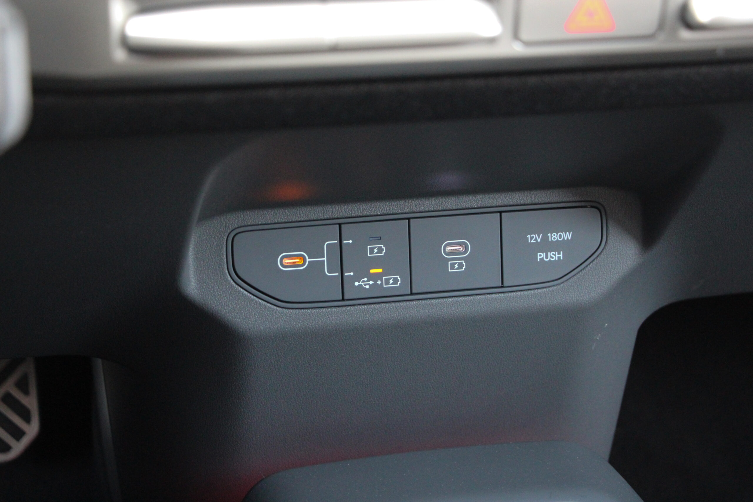 A műszerfal többi része megegyezik, ötletes a változtatható hosszúságú asztalka, am a kartámaszból húzható ki, viszont a kardánalagút helyén tátongó hatalmas rakodóhely nem zárható el a kíváncsi szemek elől. Szintén tetszik, hogy akad néhány fizikai gomb, ezekkel sokkal könnyebb kezelni a klímát, de az infotainment kezelése sem bonyolult a nagy „egybekijelzőn”. Ami itt is fantáziátlan, de ebben tettestárs az autóipar nagy része, a Kia is csak követi a divatot. Viszont szép a grafikája és a hármas osztás is logikus szerintem, csak egyetlen bakiját tapasztaltam. A vezető előtti műszercsoport és az infotainment kijelző között látható klíma menüt pont kitakarja a kormány karimája. A színek egyébként engem a ’90-es évek amerikai autóira emlékeztet, az anyaghasználatban pedig sok az újrahasznosított műanyag. Ez örvendetes és a kategóriából nem lóg ki a minőség, szóval nem kell félni az újrahasznosítósditól.