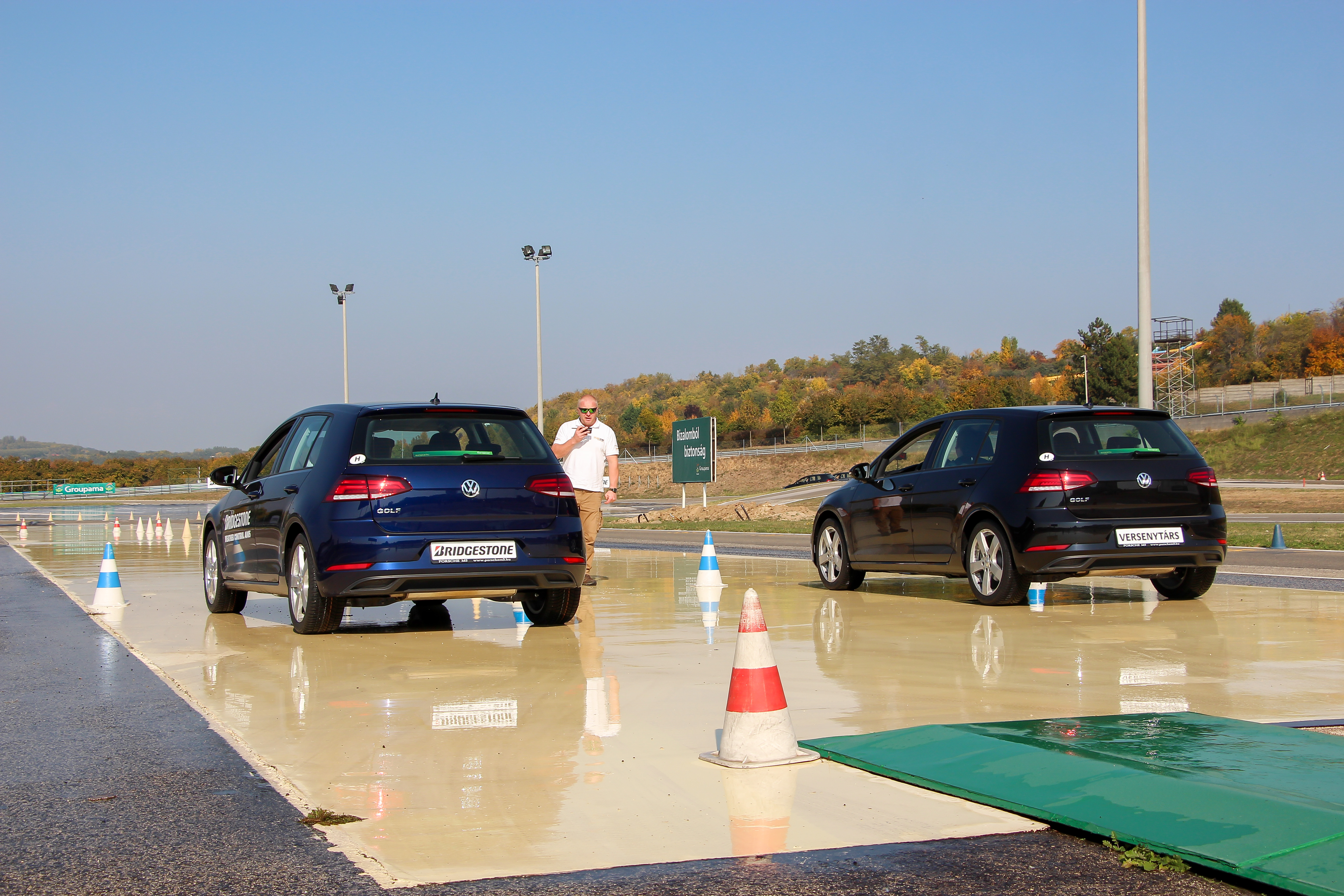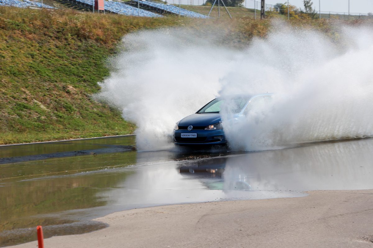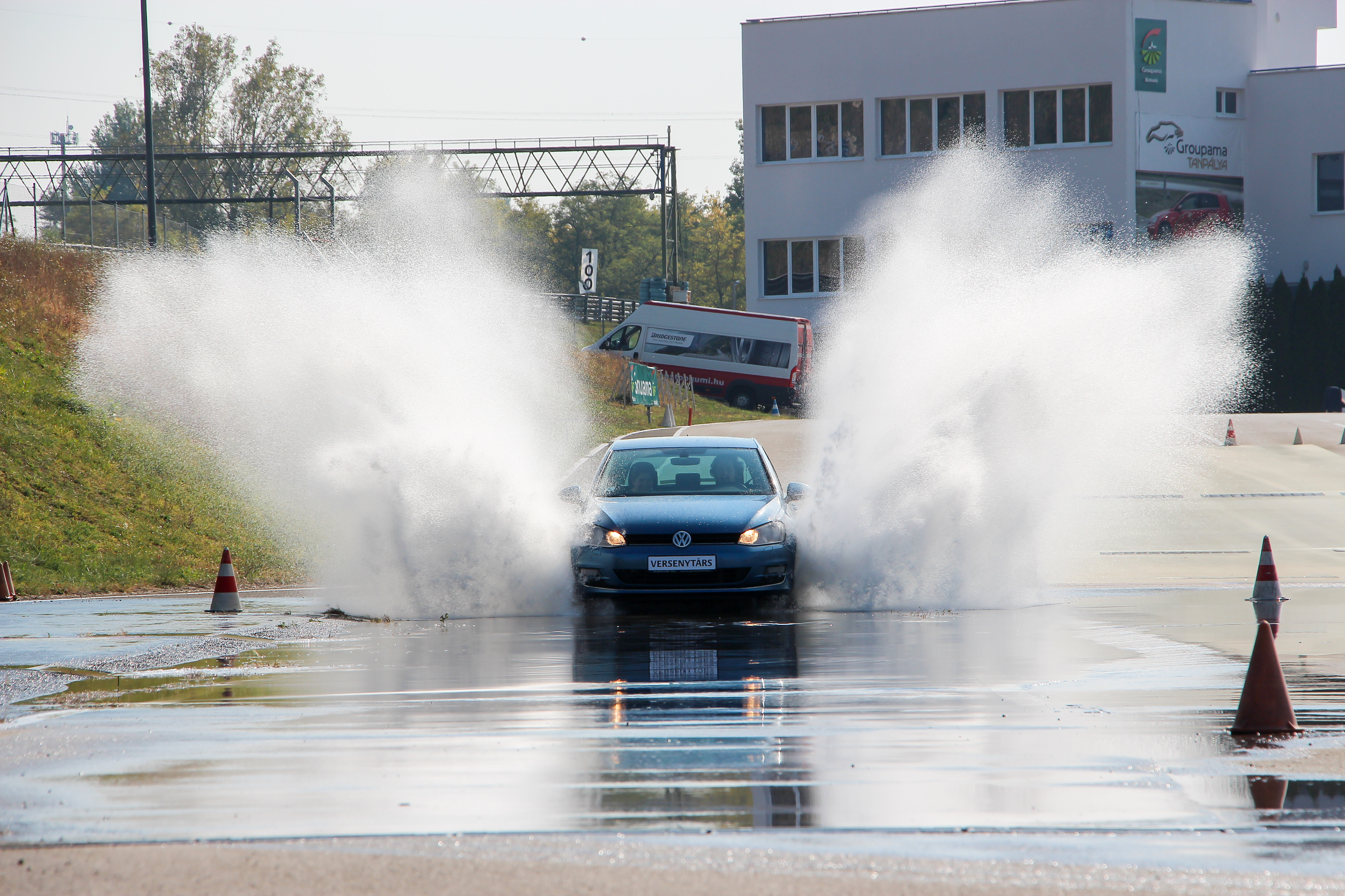 A mogyoródi Tanpályán 70 km/órás tempóval hajtottunk 6-7 centi mély vízbe, naná, hogy felúszott az autó