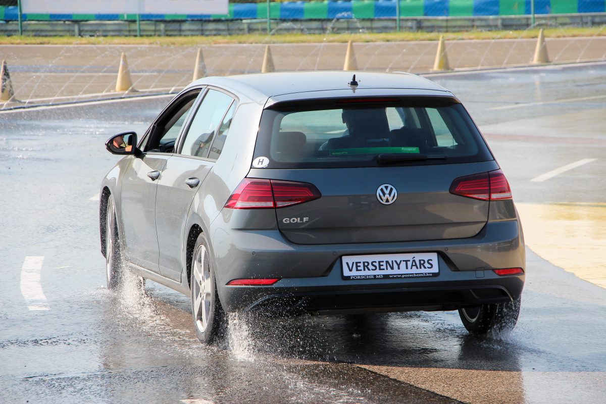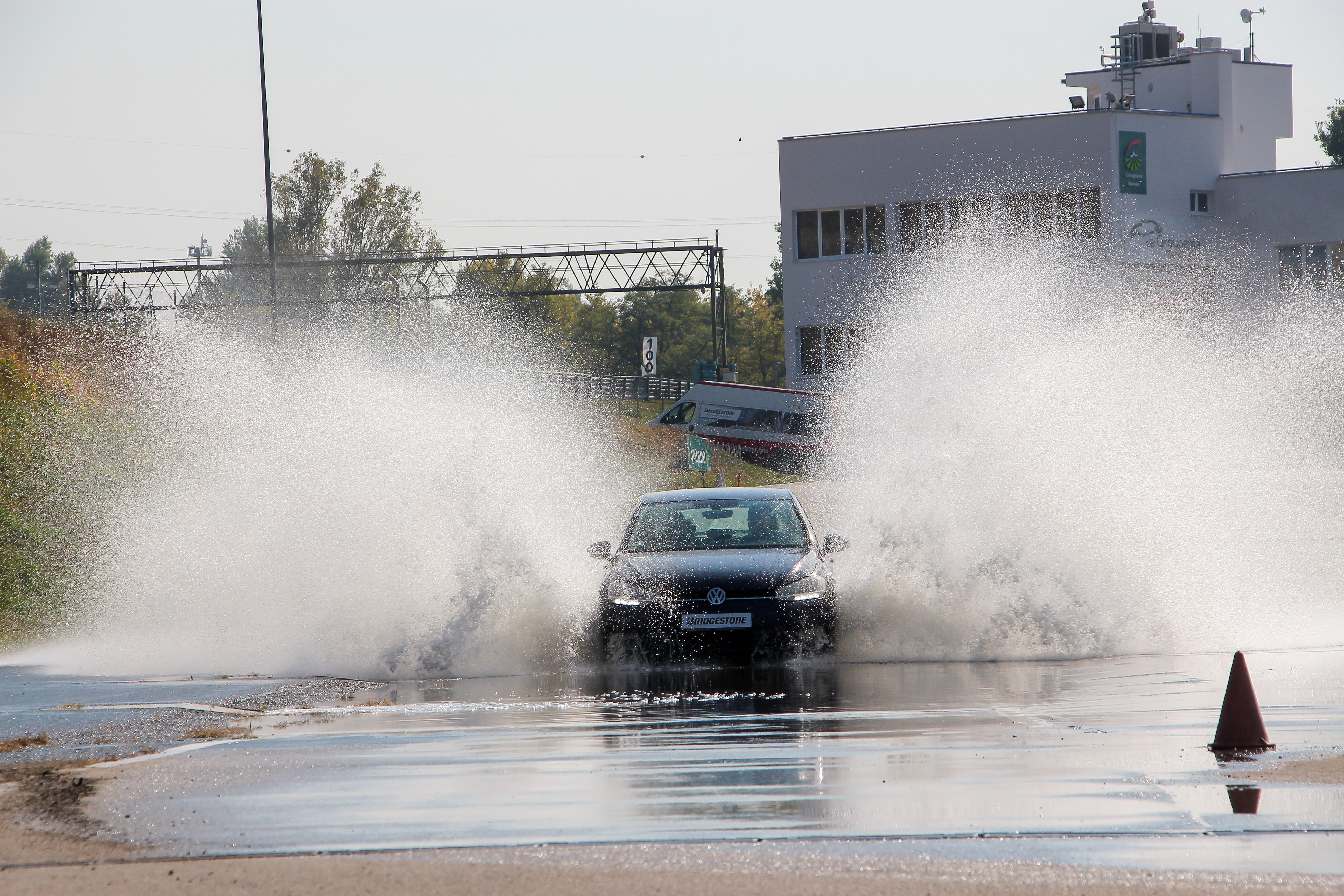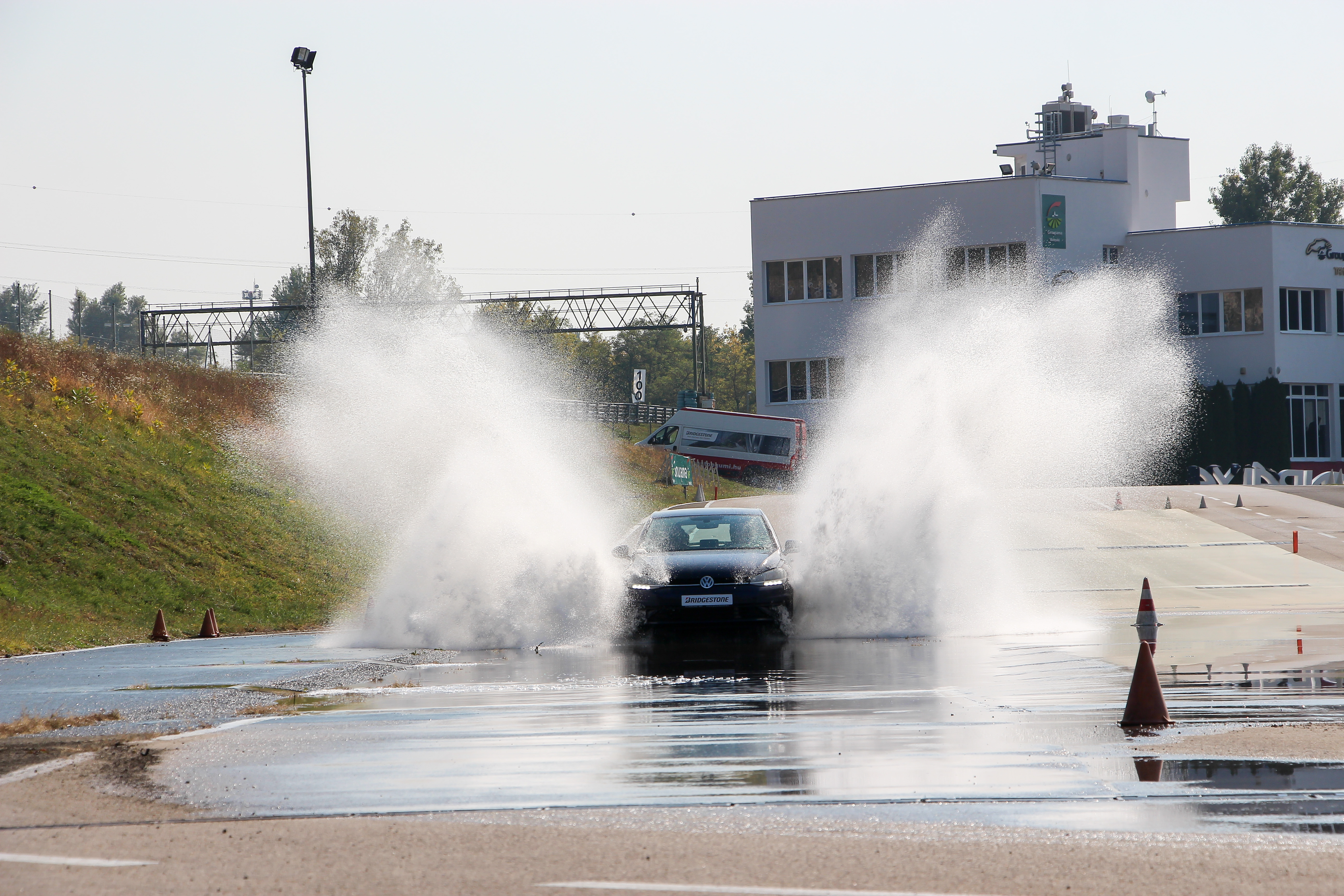 A mogyoródi Tanpályán 70 km/órás tempóval hajtottunk 6-7 centi mély vízbe, naná, hogy felúszott az autó