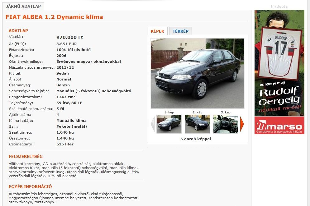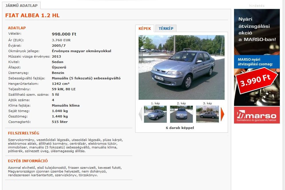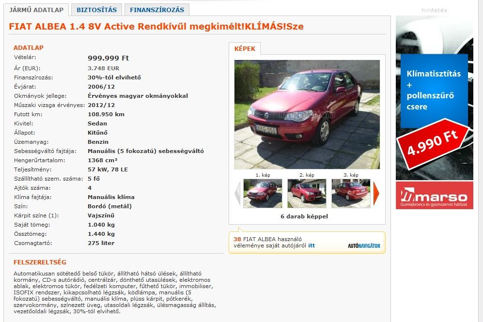 Sajnos titkolt futásteljesítménnyel hirdetik azt a budapesti, 2006-os, Dynamic komfortszintű metálfekete Albeát, amely 970 000 forintért várja új gazdáját. Motorja 1,2 literes, 80 lóerős – ez jellemző erőforrás ehhez a modellhez. Ugyancsak fővárosi és 1,2-es benzines az a metálkék kocsi, amely egy évvel idősebb (2005. június), de pár ezressel drágább – az irányár 998 000 forint, ám ennél sem tudható, mennyit futott az elmúlt hat esztendőben. Végezetül egy titkos tipp: 2006-ban a Fiat korszerűsítette a típust, így lehetőség szerint ilyet keressünk. Igazából szebb nem lett az Albea, de ahogy mondtuk, ez semmilyen szempontból nem az a kategória, ahol álmainkat megvalósíthatjuk. A megváltozott frontrészről - a nagyobb fényszórókról és hűtőmaszkról -, az új műszerfalról könnyen beazonosítható a típus, és az árban nem igazán jelentkezik az ugrás, mi gyakorlatilag egymillió forintért találtunk egy bordó metál, 2006. decemberi modellt, 109 ezer kilométerrel, a régi, de megbízható 1,4 literes, 8 szelepes benzinmotorral.