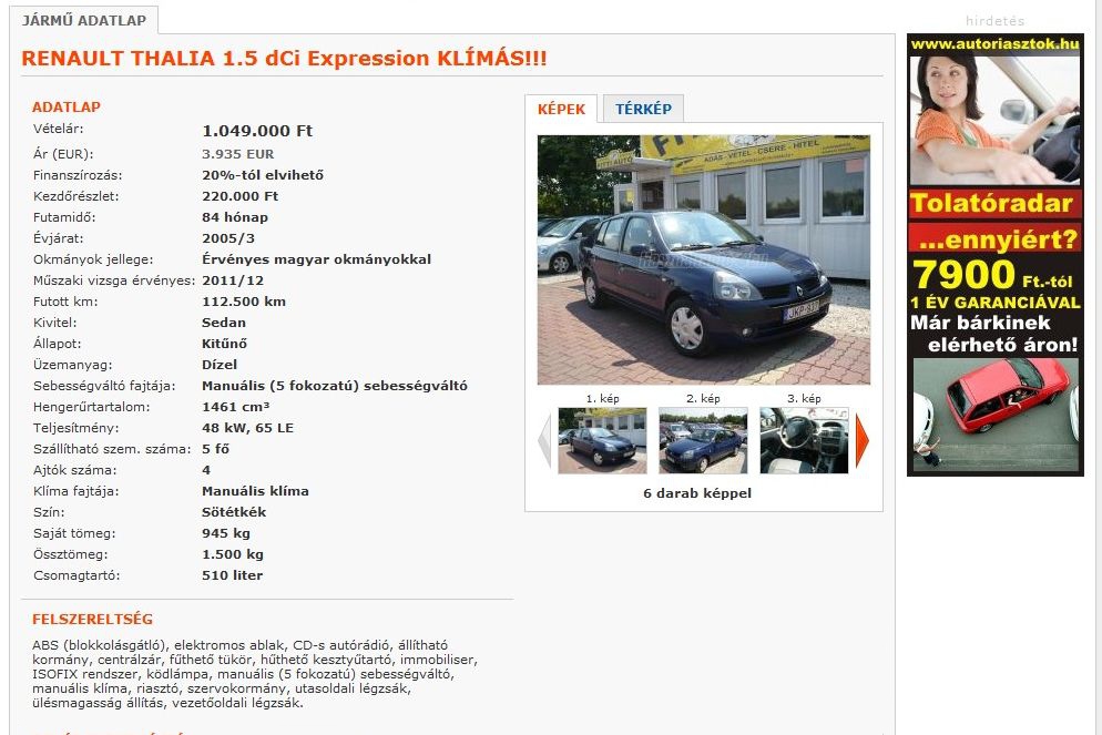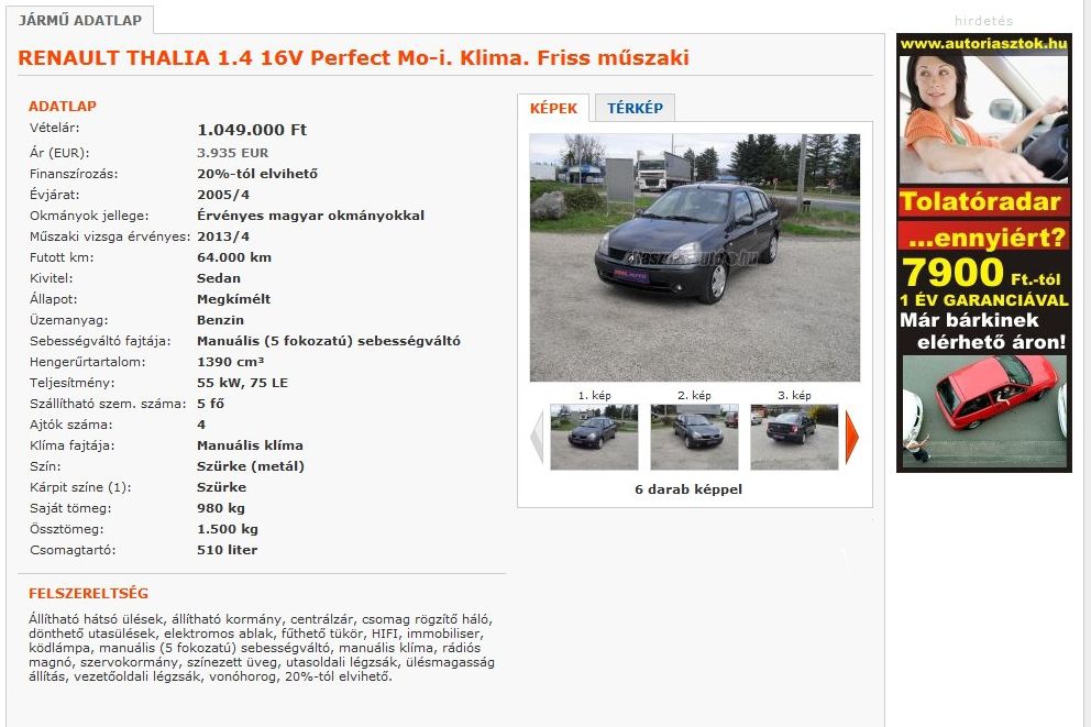 Nincs dömping az 1,2-es benzinesből, Kecskeméten bukkantunk rá egy ABS-szel felszerelt, sötétkék Perfect kivitelre, 2006. februári forgalomba helyezéssel, 106 ezer kilométerrel, 990 000 forintos áron. Zalaegerszegen első gazdás, ugyancsak Perfect ellátmányos, de már 1,4-es motoros Thalia várja új tulajdonosát - megkíméltnek hirdetve, 64 ezer kilométeres futással és vonóhoroggal, 1 049 000 forintért. A pontosan ugyanennyibe kerülő (1,049 millió Ft) dízel 1.5 dCi Expression budapesti kereskedésben található, a 2005. márciusi példány egyszer már gazdát cserélt, futásteljesítménye 112 ezer kilométer. A gázolajos motor fogyasztása szerény, de a turbóra sok a panasz, 120-140 ezres használat után, ha kíméletlenül használták, komolyabb gondok adódhatnak, és a javítás nem olcsó mulatság – ezzel kalkuláljunk, ha gázolajost szeretnénk.