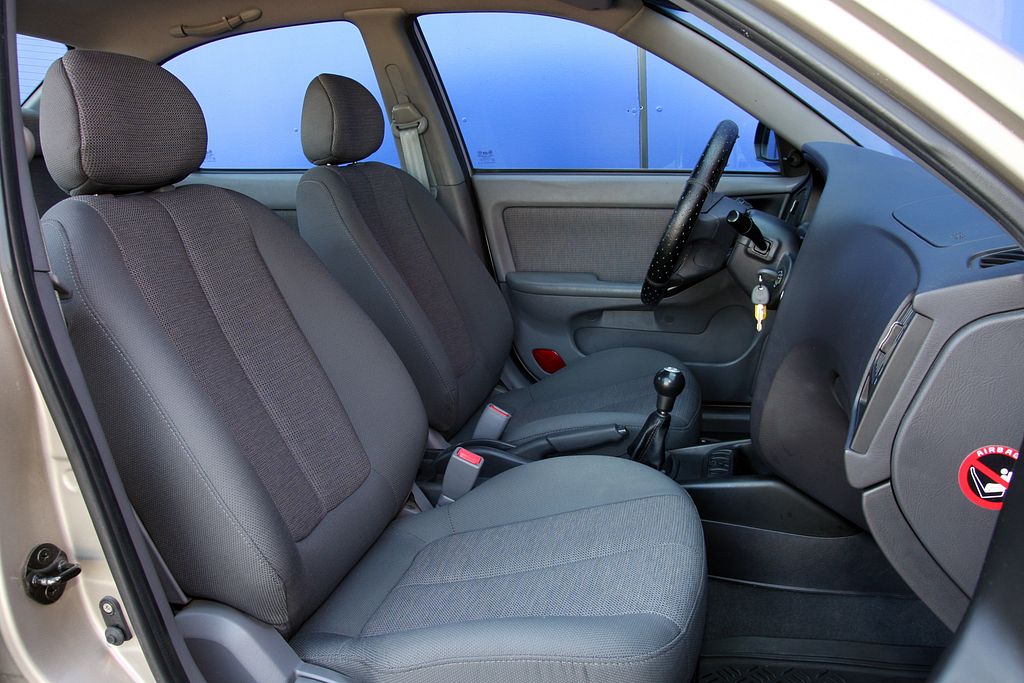 Az utastérben sem a „céges autó”, sem a 166 ezer kilométeres nyúzás tükrében nincs különösebb nyoma a használatnak. Az ülések kényelmesek, a kárpitozás foszlás- és szakadásmentes, egyedül a vezetőajtó felső burkolatán hagyott enyhe kopásnyomot a könyöklés. Kellemes meglepetés, hogy a műanyagok zöme nem durván kopogós és kemény, menet közben nincsenek bántó zörejek. Az üléstámla állítása nem tekerős, hanem körülményesebb, karos. Rakodóhelyek tekintetében nem vizsgázik rosszul az Elantra, az ajtózseb nem nagy, de van palacktartója, a két első ülés között gondoltak a pohártartóra, és a kesztyűtartóban elfér az A4 méretű könyv – a