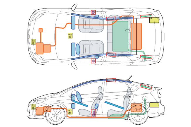 Ezek az adatlapok valóban minden részletre kiterjedően, mégis jól átlátható ábrával jelölik, hogy az adott autóban hol található az akkumulátor, hová kerültek légzsákok, azok gyújtószerkezete, az övfeszítő, hol az üzemanyagtank, a hibridekben a nagyfeszültségű kábel. Valóban jó tudni ezeket, a hazai szakemberek mégsem tartják életszerűnek, hogy egy összetört autóban keresgéljék annak leírását. Ők „csak” a gyakorlatra, a tapasztalatra és a részint belső kiadványokból megszerzett tudásukra hagyatkoznak mentés közben. Mint mondják, elsőre ijesztő lehet egy nagyfeszültségű kábelekkel átszőtt hibrid, de a gyártók ügyelnek arra, hogy ezek egyrészt narancssárga színükről könnyedén azonosíthatók legyenek, másrészt kellően védett helyen, a padlólemez közepénél fussanak, így minimális eséllyel kelljen csak közelükbe férkőzni – itthon még nem is volt rá példa. Ha ezekhez mégis hozzá kellene nyúlni, még súlyosabb veszélyt jelenthetne az akkumulátorok maró savja. Az esetek zömében azonban a legkomolyabb probléma az áramtalanítás. [kepallojobb=454421]Közvetlenül a rendszer-akkumulátorok mellett kell keresni a hibridek áramtalanító kallantyúját[/kepallojobb] A hibrid akkumulátorának helye és áramtalanító kapcsolójának elhelyezkedése sok esetben talány, bár rendszer e témában is található. A szabadidő-autóknál rendszerint a hátsó ülés alatt, a többi hibridben a csomagtér padlójában található a rendszer akkumulátora. Ebből egy narancssárga biztosító-kallantyút kell kirántani az áramtalanításhoz. Sok modellben ez a kárpitok lepattintásával elérhető, de akadnak olyanok ahol a burkolat lebontásához szükséges az akkusarukhoz szabvány 10-es villáskulcs. Míg egy hagyományos autónál az akkumulátor-saruk levétele után 1,5 perccel már nem kell számítani semmilyen elektromos aktivitásra sem, a hibrideknél akár 5 perc is lehet a teljes „áramkifutás”. Mivel egyik sem rövid idő, a balesetekkor el nem sült első légzsákokat speciális leszorító eszközökkel biztosíthatják, hogy mentés közben ne okozhassanak sérülést.
