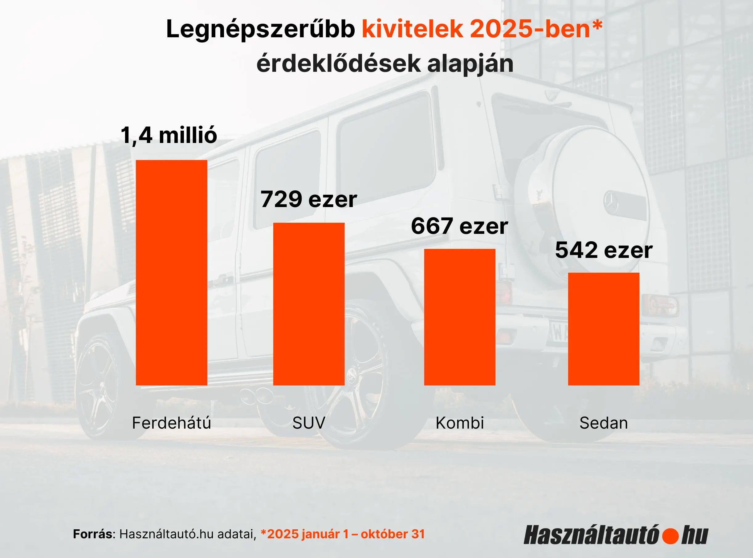 A ferdehátú karosszériával készült autók továbbra is változatlanul a legnépszerűbb kategóriát jelentik a használtautó-piacon: 2025-ben eddig gyakorlatilag ugyanannyi érdeklődés volt irántuk, mint az előző év azonos időszakában. Az adatok szerint 2024-ben 1,394 millió, míg 2025-ben 1,398 millió érdeklődés érkezett erre a típusra, ami mindössze 0,3%-os növekedést jelent. A stagnáló kereslet mellett azonban az árak egyértelmű emelkedést mutatnak: az átlagár 2,44 millió forintról 2,60 millió forintra nőtt, ami 6,5%-os drágulást jelent. Az átlagéletkor 14,65-ről 14,85 évre emelkedett.