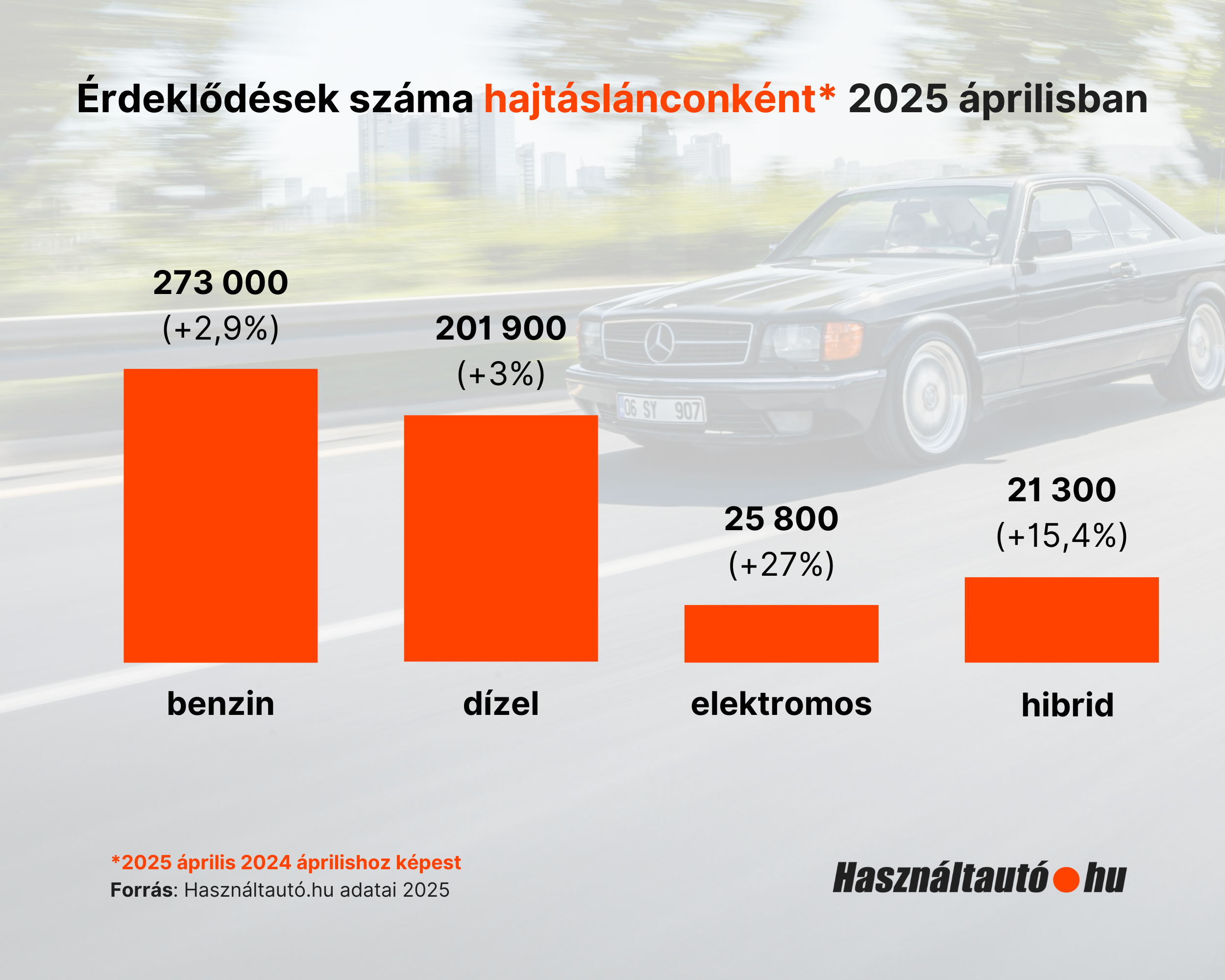 2024 áprilisához képest 27 százalékkal több lekérdezés érkezett a Használtautó.hu felületén az elektromos autókra – derül ki a portál friss közleményéből. Emellett a hibridek iránt is többen érdeklődtek 15,4 százalékkal. A benzinesek (+2,9%) és a dízelmotoros modellek (+3%) kereslete is nőtt, viszont nem ekkora mértékben. Mindent egybevetve az oldalon 5 százalékkal többen nézelődtek a használt autók között, mint a tavalyi év azonos időszakában.