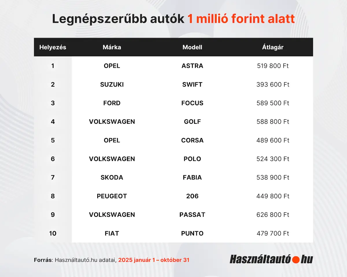 Izgalmas részleteket mutatnak meg a Használtautó.hu január és október közötti adatai a magyar használtautó-piac árkategóriáiról. Az egymillió forint alatti kínálatot egyértelműen a praktikus, fenntartható típusok uralják. A toplista élén az Opel Astra (78 600 érdeklődés) áll, amelyet a Suzuki Swift (74 800) és a Ford Focus (47 200) követ. Ezeket a modelleket az alacsony fenntartási költség, a kiváló alkatrészellátás és a tartós technika tartja a népszerűségi lista élén a legolcsóbb szegmensben. Az autók átlagára ebben a kategóriában 400-600 ezer forint között alakul, miközben az átlagos életkor meghaladja a 20 évet, és a futásteljesítmény jellemzően 200-270 ezer kilométer körül mozog.