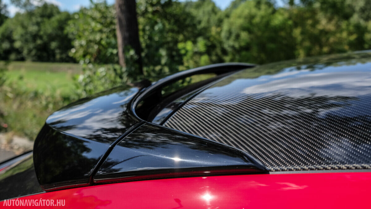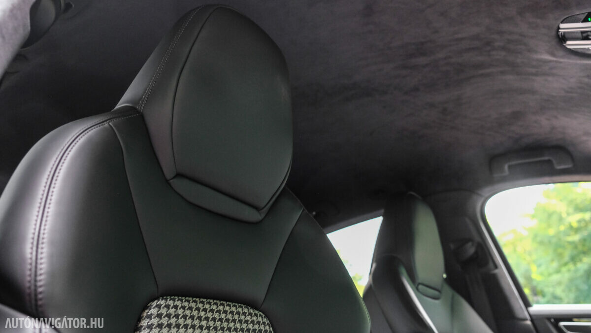 Néha érezni a súlyát, de csak nagyon ritkán, egy-egy túl rövidre vett féktávon, vagy a remek hazai utak hibáin. De azokon is úgy lép át a GTS, hogy egy zörej nem jut el a fülünkhöz. A futómű tökéletesen kiszintezi, miközben hibátlanul az úton tartja és feszesen, ez tuti, hogy valami boszorkányság. Az Alcantara kormány nagyon keveset fordul, tökéletes visszajelzéssel. Mindeközben olyan ülésekben ülünk, amik tökéletesen tartják a testet és itt még az sem zavar, hogy magasan vagyunk, valahogy minden pont jó. Az ülések huzata egyébként középen szövet, ritka ízléses retro mintával, ez egyébként feláras a bőr helyett, de a könnyítő csomagban benne van, ahogy az is, hogy ez a kivitel csak négyüléses, hátul középen egy értelmetlen műanyag tálcával. Egyébként hátul meglepően korrekt a helykínálat, keresztbe tett lábakkal is tudnak utazni felnőttek, a fejtér még nekem is bőségesen elég volt, ami nem a magas tető, sokkal inkább az optimálisan alacsonyra épített ülések érdeme.