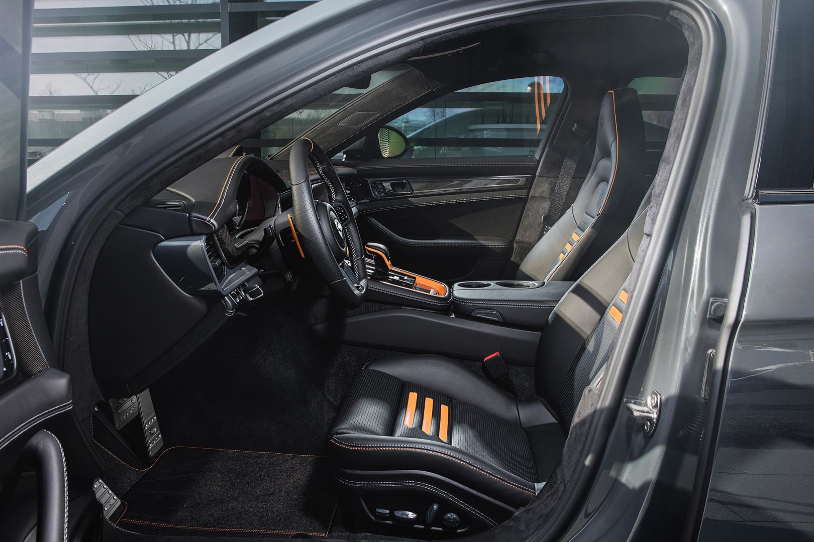 Az első lökhárítót a GT3-hoz hasonlóra szabták, a motorháztető pedig szénszálas, némi súlycsökkentés gyanánt, persze ezen a szinten már igazán mindegy egy-két dekagramm. A Panamera minden szinten gyors, az új hibridverzió ráadásul 680 lóerős, és 3,4 másodperc alatt gyorsul 100-ra. Visszatérve a kithez, a belsőt is érinti az átalakítás a tulaj ízlése szerint, a demóautó belét narancssárga kiegészítőkkel dobták fel, felborítva ezzel a beltér elegáns és kimért összhangját. A csúcs viszont a minden szinten gombnyomásra vagy automatikusan nyíló hátsó légterelőre épített vasalódeszka. Nyitott állapotban igazán jól mutathat a kétszintes légterelő, eléggé Need for Speed. Persze van még karbon is, méghozzá a kipufogóvégeken, amiket egy óriási diffuzor köt össze. Az árát nem árulták el, de a Techart nem dolgozik olcsón. Ha már Panamera-tuning, akkor ott a Race Chip motortuningja, annak valamilyen szinten értelme is van, de legalább a külsőt nem feltétlenül rontja el.