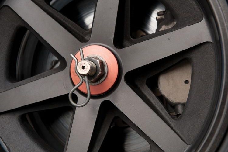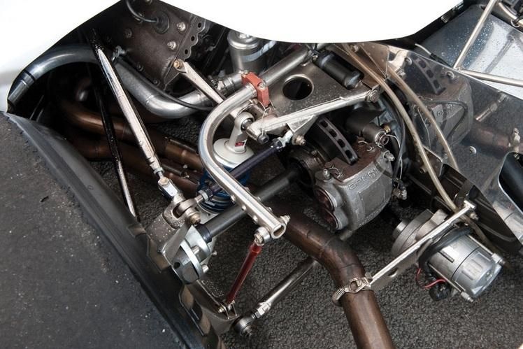 A Hesketh 308 kokpitja, hátul a V8-as Cosworth DFV motor és a kerékrögzítők biztosítótűje - régies hangulatot árasztanak