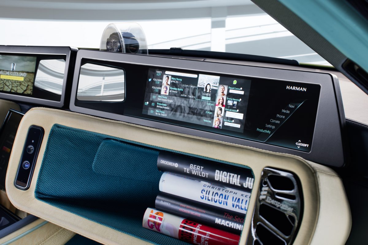 Önvezető módban a műszerfalba húzódik a kormány, így több hely szabadul fel. Talán jobb is ezt a funkciót használni, látva a kormány dizájnját. Bár az a könyvtartó az anyósülés előtt még mindig kegyetlen