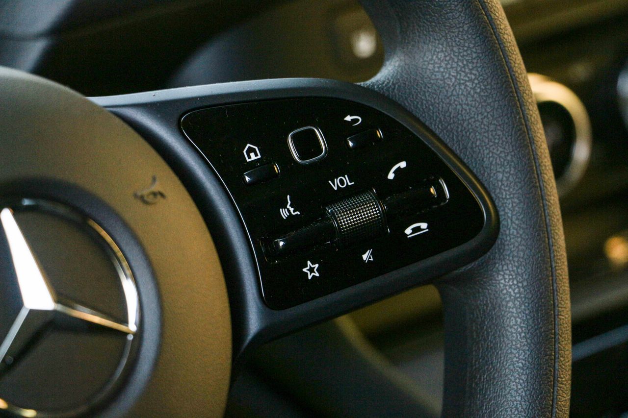 Az utastérben törekedett a Mercedes a minél elegánsabb megoldásokra. Ilyen a bőrbevonatú kormány, de a belső tér más pontjain sem találkozni olcsó hatású műanyagokkal. A kormányra biggyesztett gombok jól kézre állnak, még a menetpróba rövid ideje alatt is hamar meg lehetett szokni. A váltókar szintén remek helyre került, ahogy a műszerfalon lévő fizikai gombok is, viszont a 7 colos multimédiás kijelzőnél nagyobbat érdemelne egy haszongépjármű, viszont a menü logikusan felépített, remekül kezelhető.