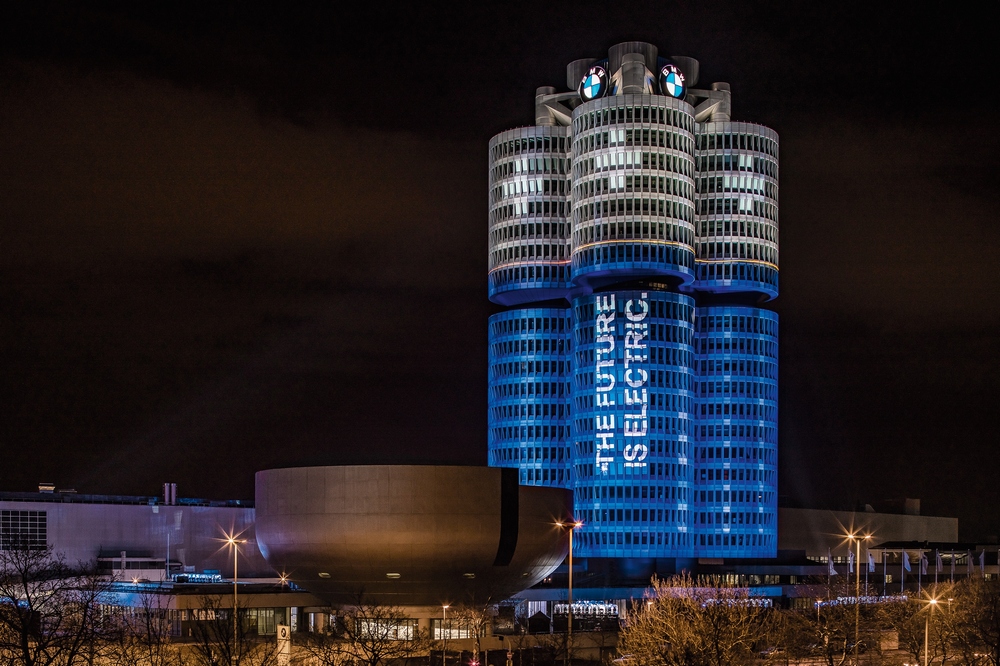 A BMW müncheni székháza egy napra átváltozott. A négyhengeres épületnek is becézett toronyház egészen más értelmezésben díszelgett a 100 000. eladott konnektoros BMW tiszteletére.