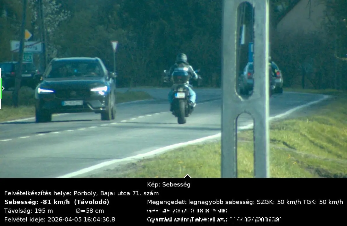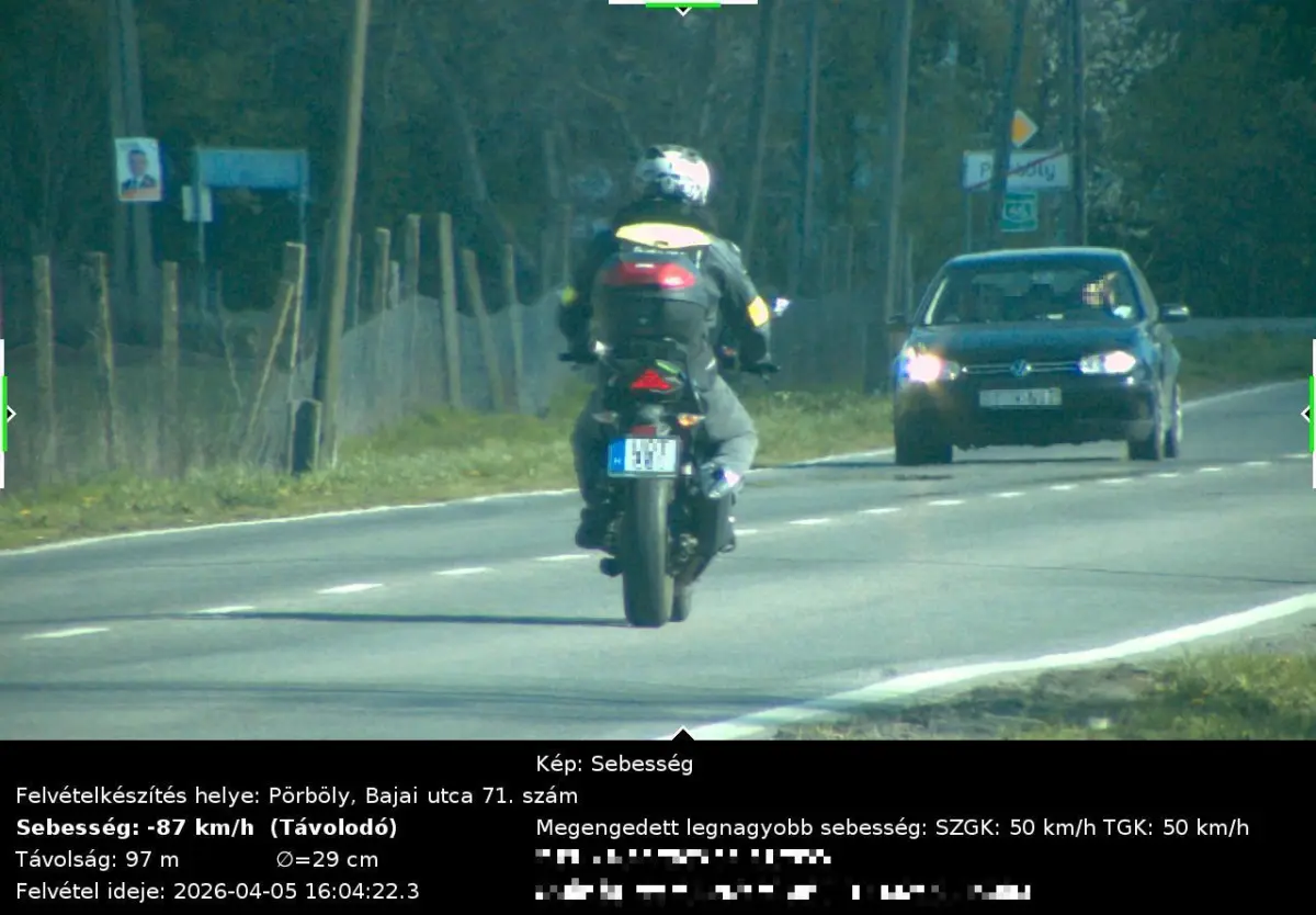 A felvételeket a hosszú hétvége ideje alatt, vasárnap készítették a Tolna vármegyei rendőrök Pörbölynél. A traffipax felvételeken jól kivehető, amint az egyik motoros 81, míg a másik 87 km/órával húzott el a mérőműszer előtt. Miután megállították őket, kiderült, egy apa-fia párosról van szó, bár azt nem közölte a rendőrség a bejegyzésében, melyikőjük hajtott gyorsabban. Mivel a két motoros sebessége a nemrég bevezetett "sávos" rendszerben két különböző kategóriába esik, így egyikőjük kereken 100 ezer, míg a másik 70 ezer forintos bírságot kapott, ugyanakkor a büntetőpontok szempontjából nem tettek különbséget az egyenruhások, egyaránt 4-4-et írtak be a gyorshajtók jogosítványába.