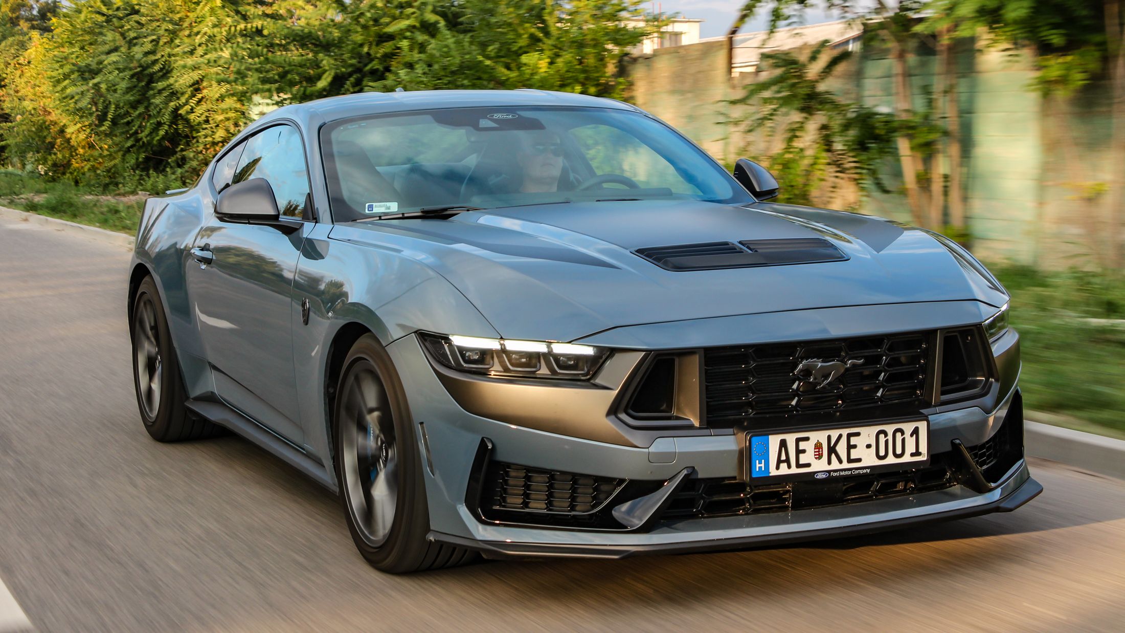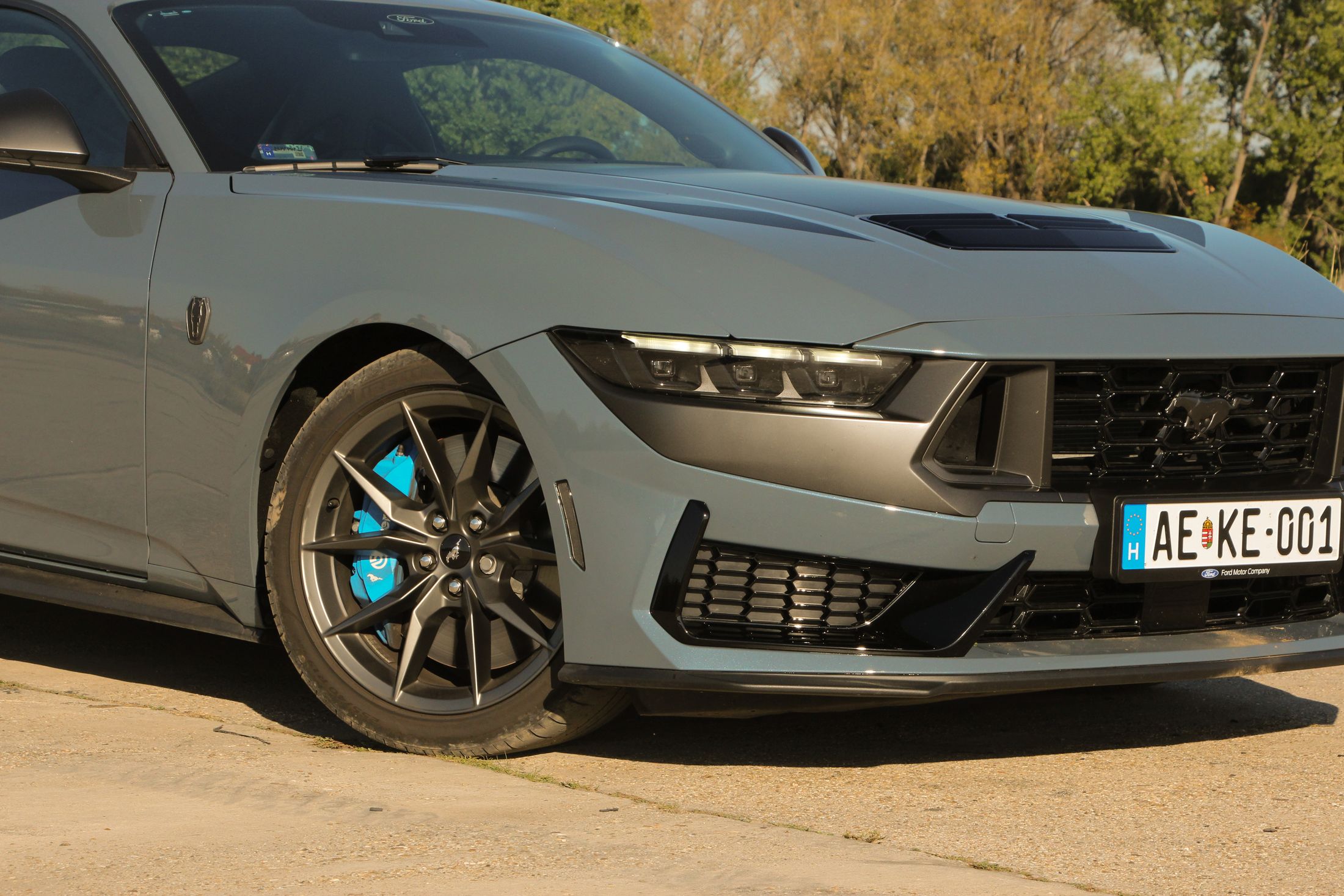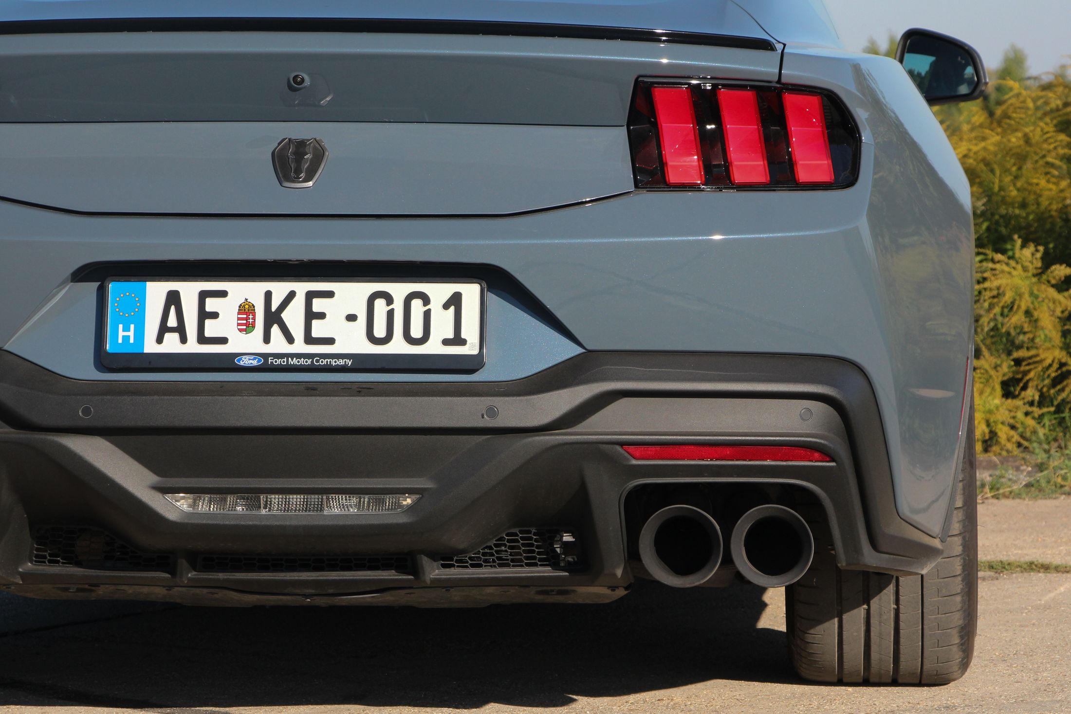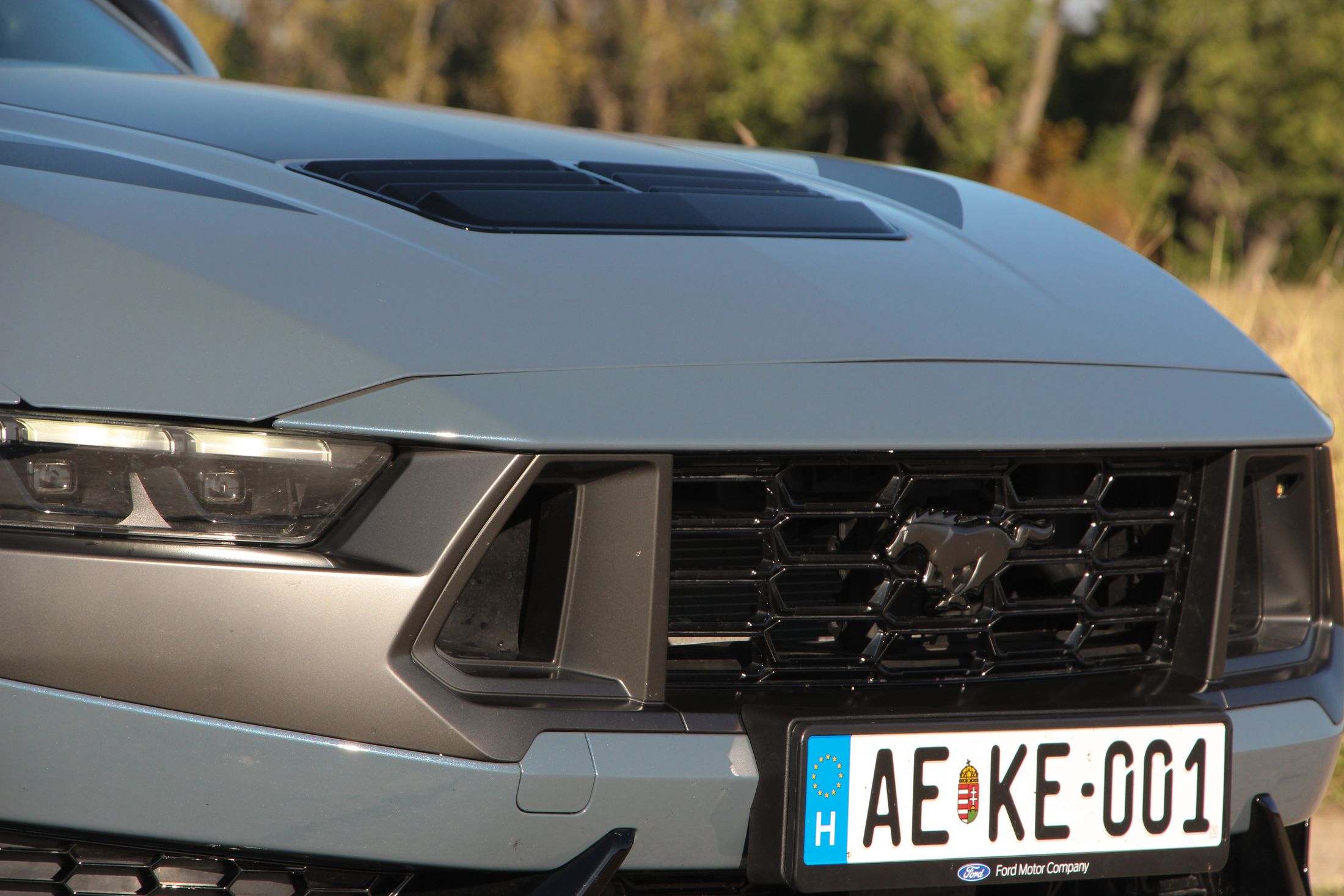 Ha engem kérdeztek az autó orráról, akkor azt kell mondjam, hogy szerintem is visszafogottabb, mintha egy kis eleganciát próbáltak volna belecsempészni az összképbe, ám a morcos tekintetéből így sem veszített. Hatványozottan igaz ez a Dark Horse változatra, amely sötét díszbetéteket kapott és más a hűtőmaszkja a GT-hez képest, illetve a lökhárítója és az abba integrált légbeömlők is eltérőek. Emellett megkülönböztető matricázást is kapott a motorháztetőn, természetesen Dark Horse felirattal.