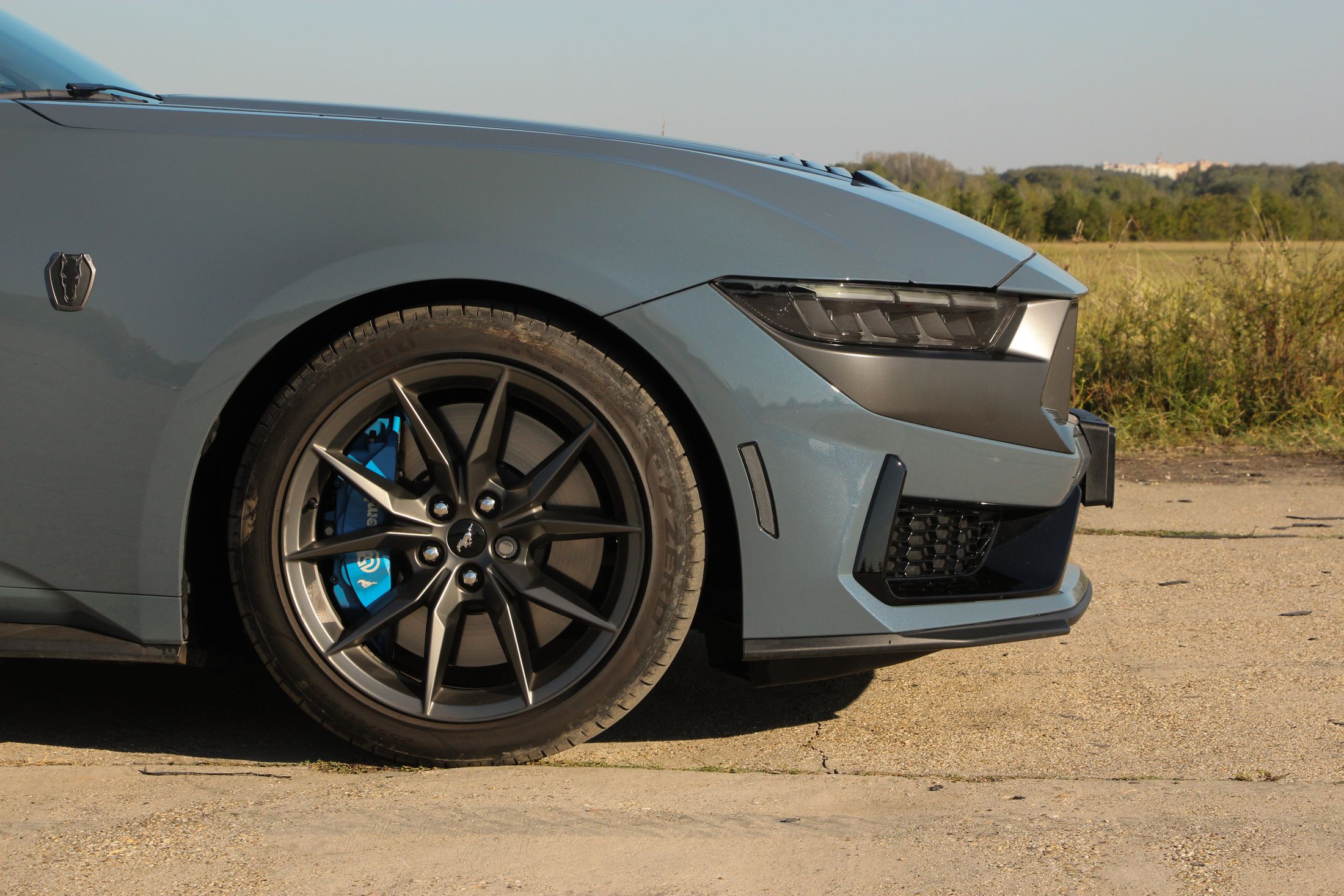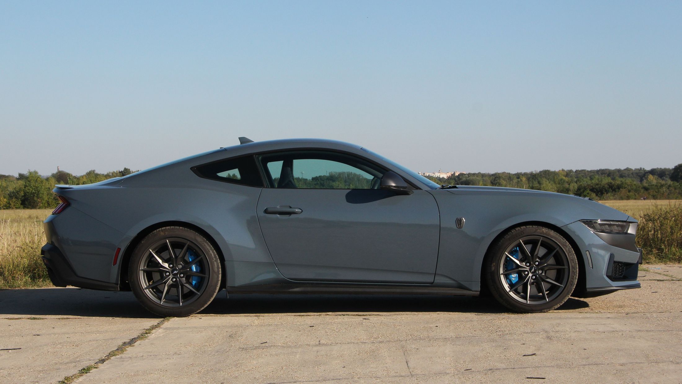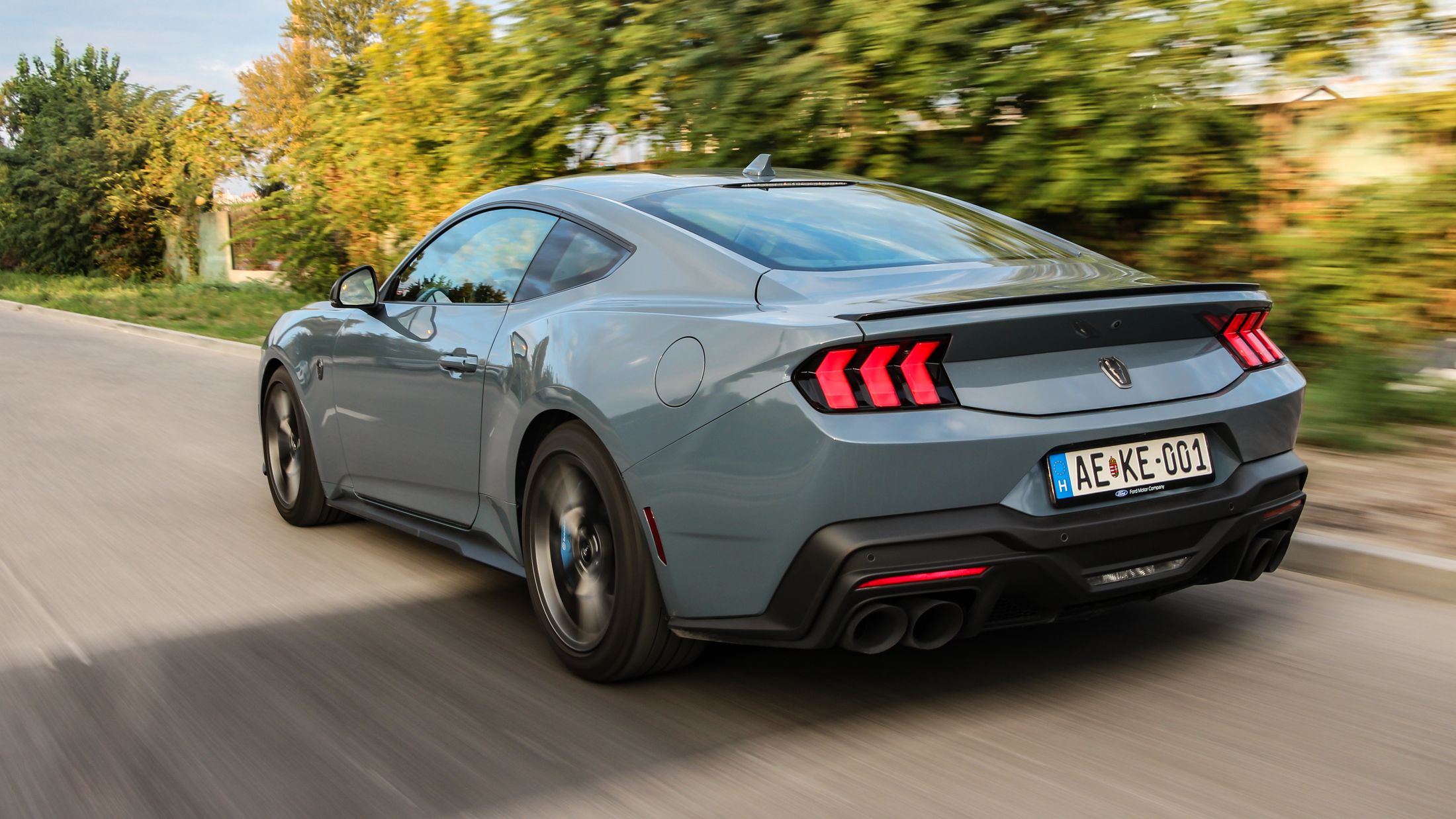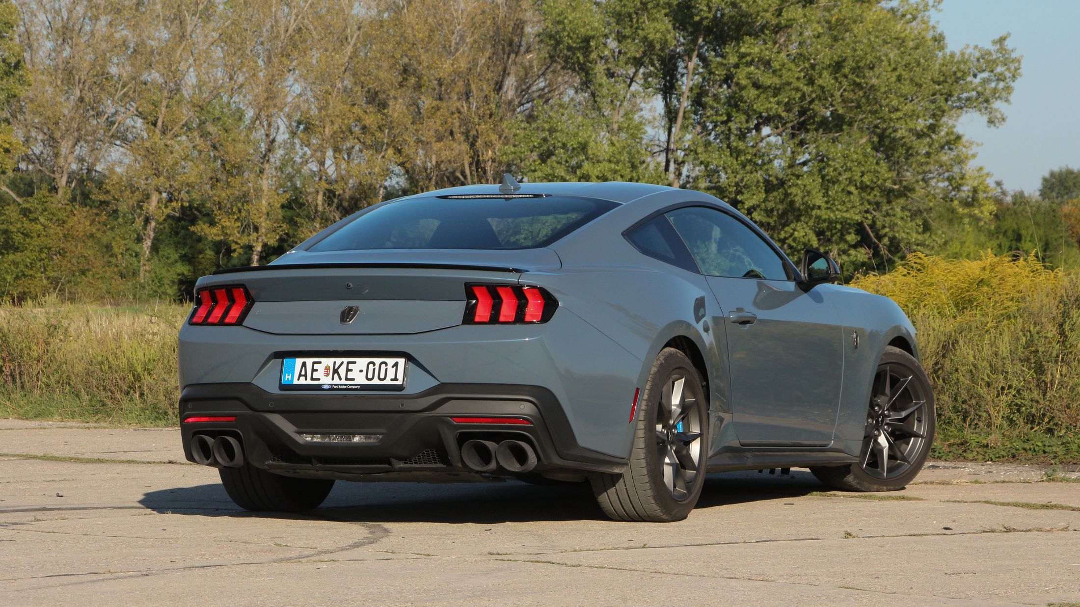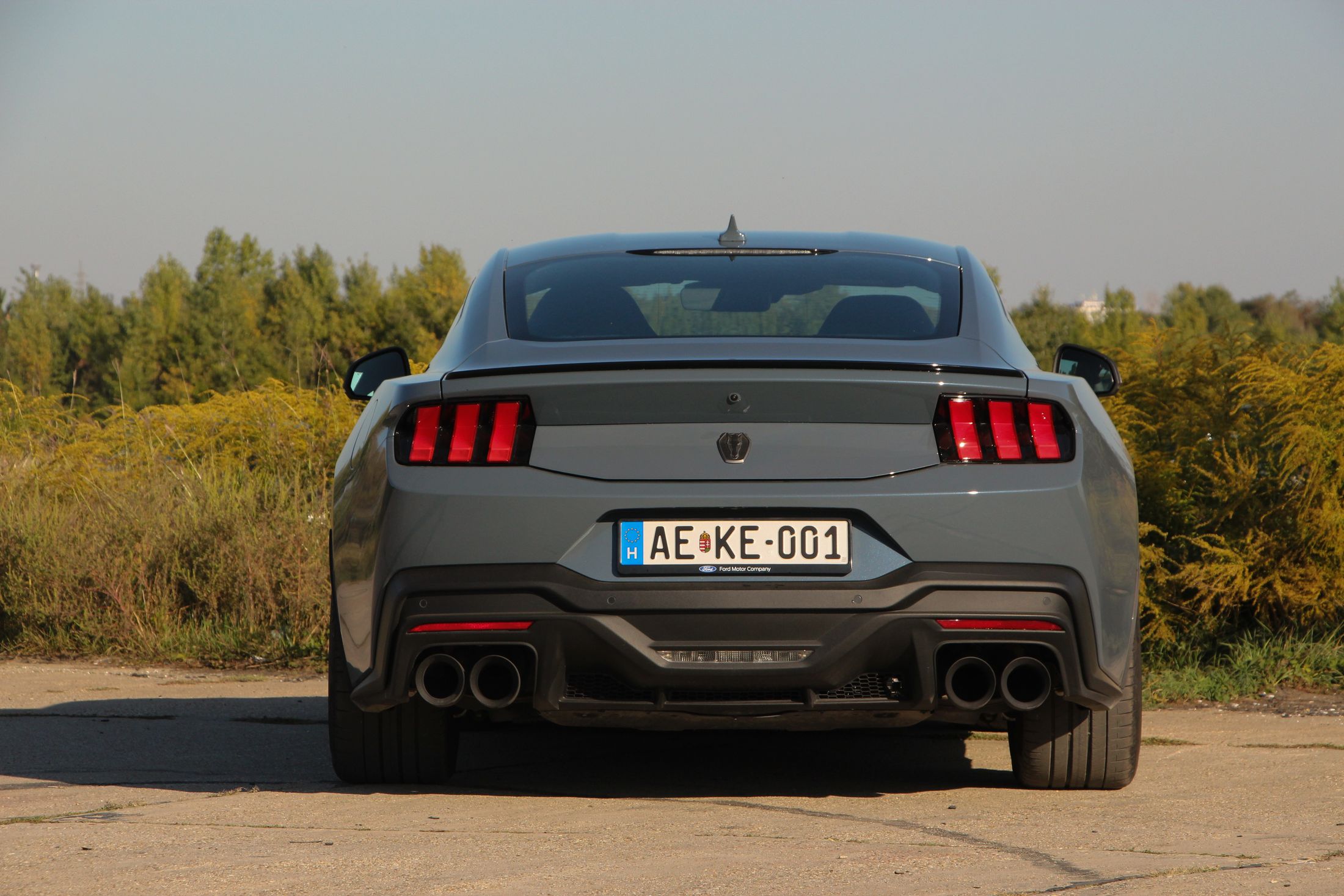 Ha engem kérdeztek az autó orráról, akkor azt kell mondjam, hogy szerintem is visszafogottabb, mintha egy kis eleganciát próbáltak volna belecsempészni az összképbe, ám a morcos tekintetéből így sem veszített. Hatványozottan igaz ez a Dark Horse változatra, amely sötét díszbetéteket kapott és más a hűtőmaszkja a GT-hez képest, illetve a lökhárítója és az abba integrált légbeömlők is eltérőek. Emellett megkülönböztető matricázást is kapott a motorháztetőn, természetesen Dark Horse felirattal.