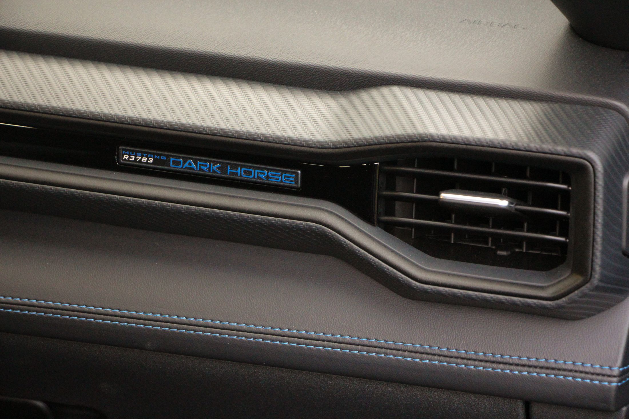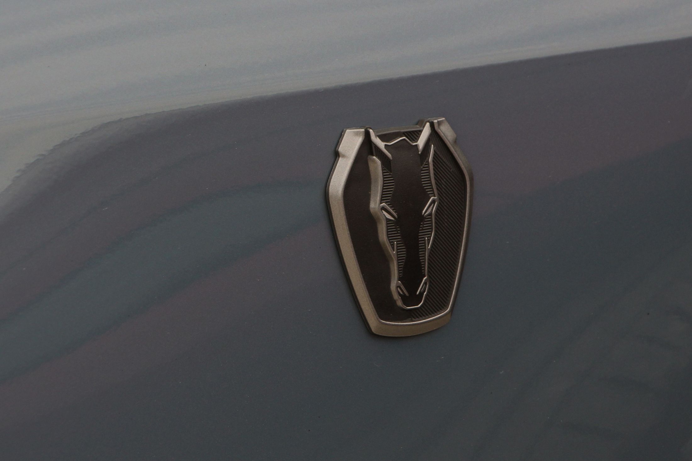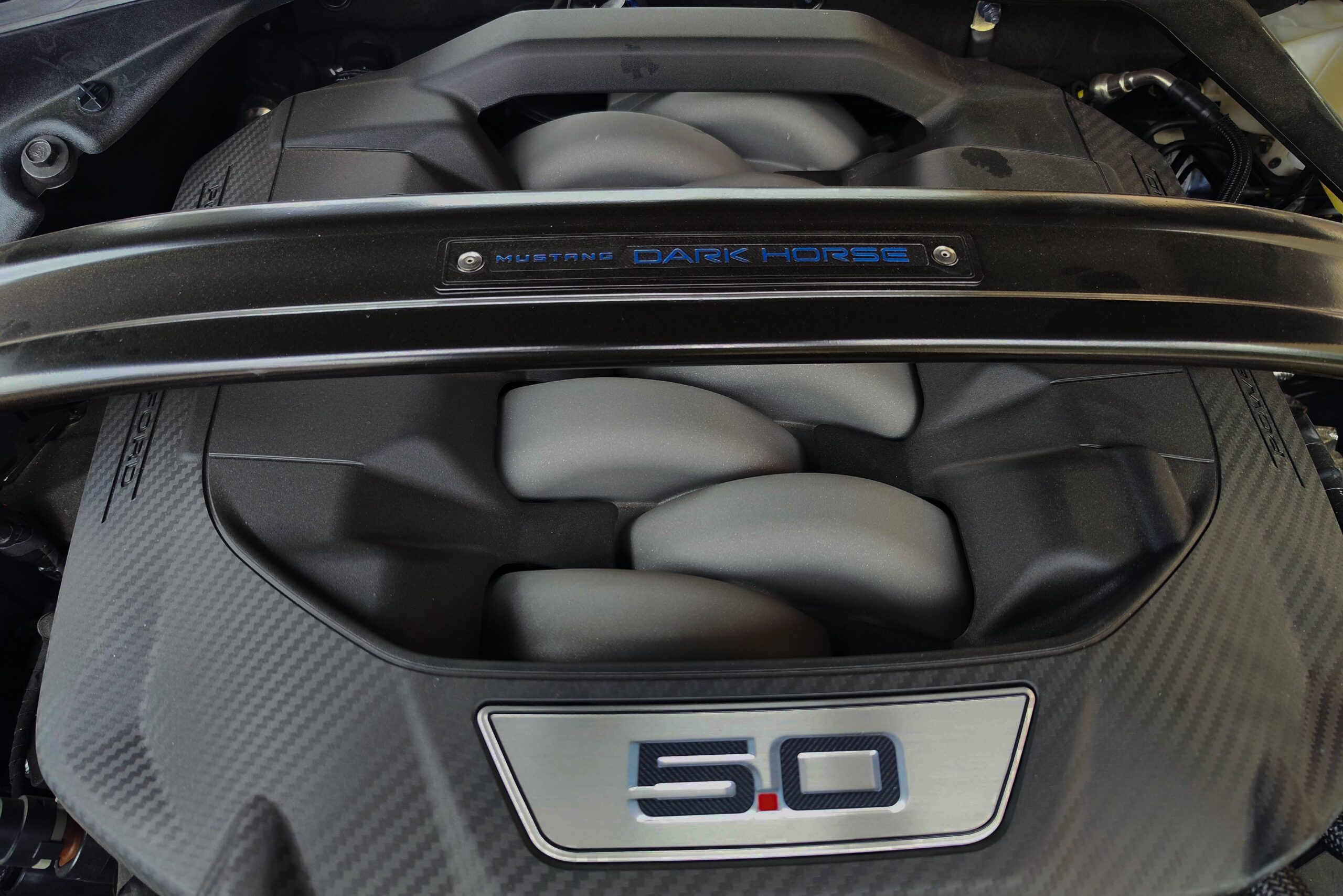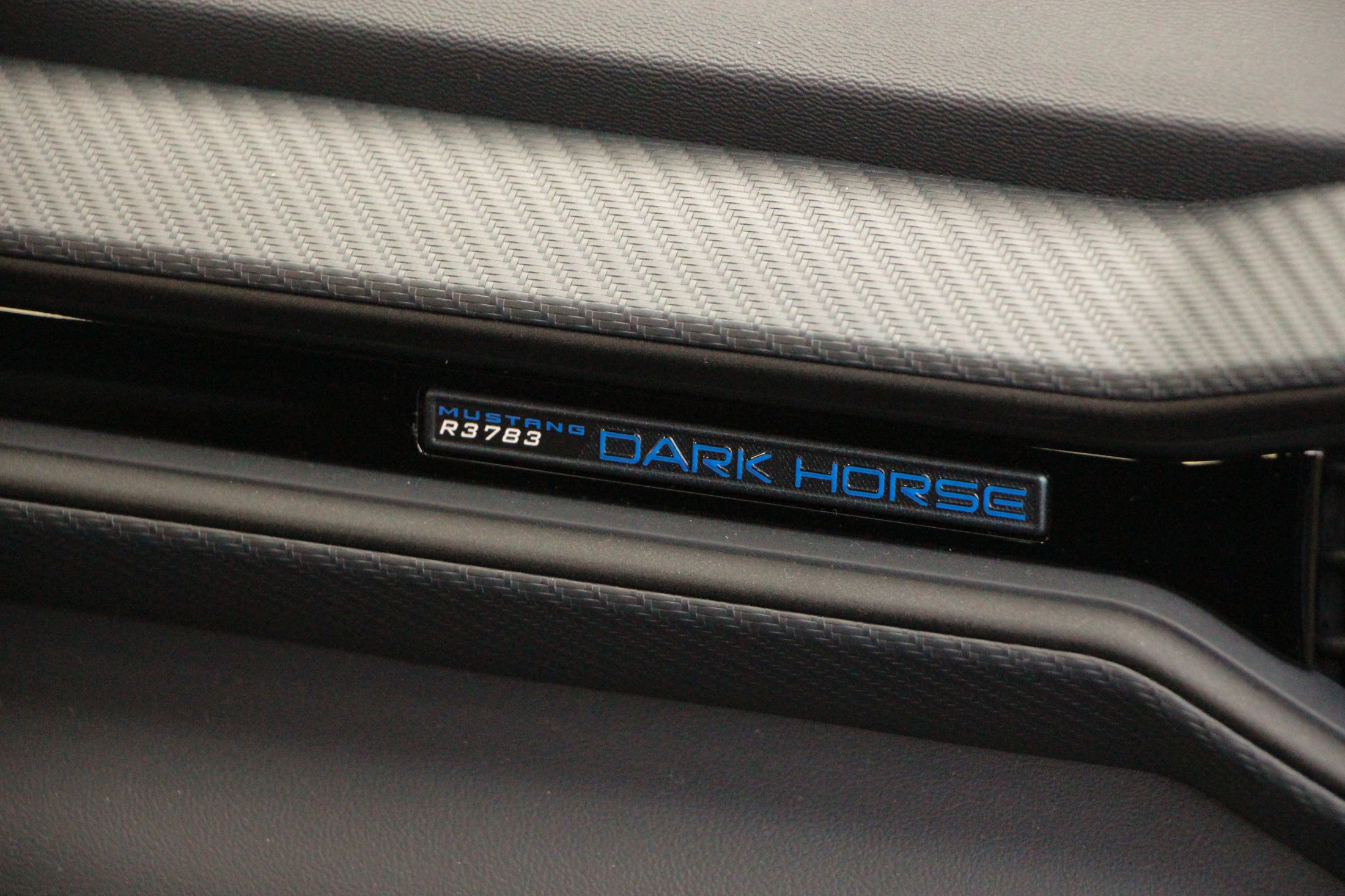 Említésre méltó még a Dark Horse egyedi lófej emblémája, ami egy sakkfigurára emlékeztet. Nem véletlenül, hiszen a kezdetek kezdetén, amikor a Mustang emblémáján agyaltak a Ford szakemberei, szóba jött a sakkfigura motívum is. Végül nem amellett döntöttek, de most láthatjuk milyen lett volna ha… Persze az orrán ott virít a vágtató vadlovacska is.