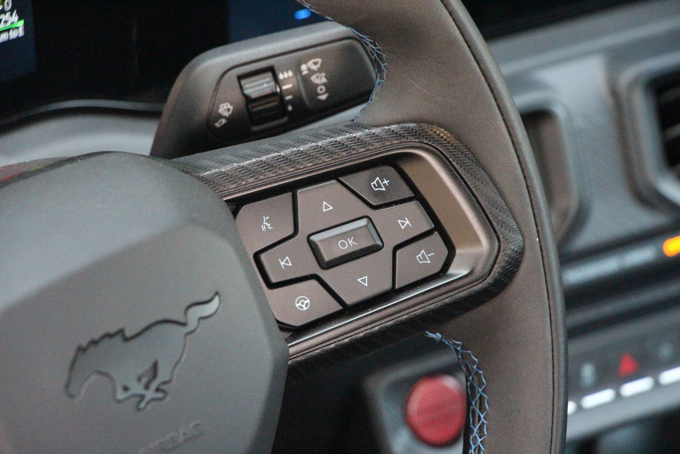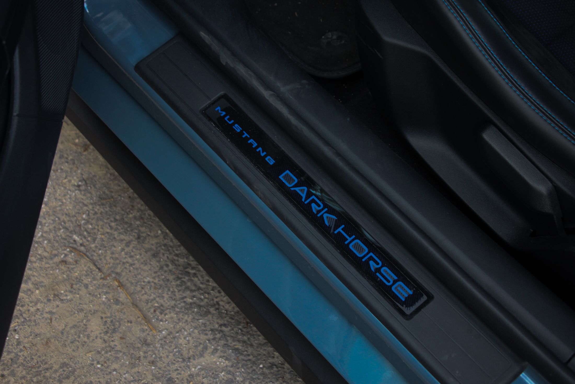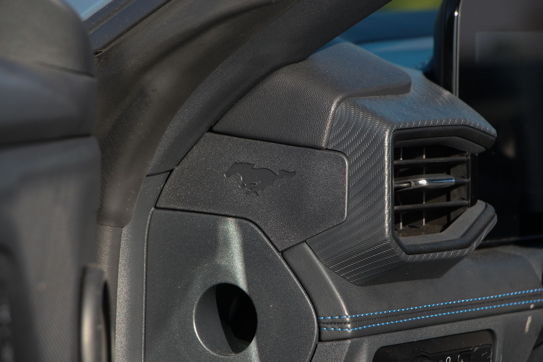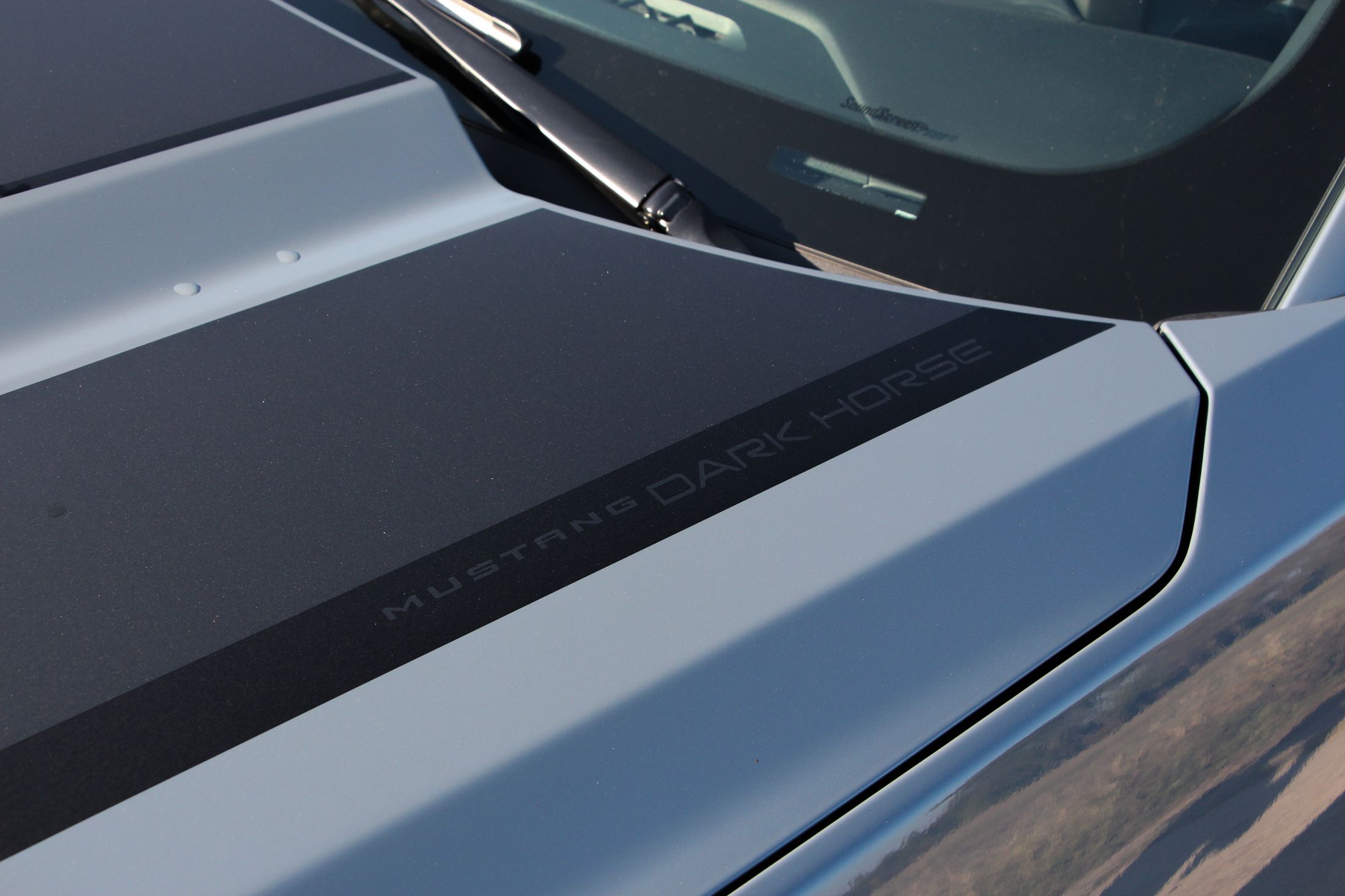 Említésre méltó még a Dark Horse egyedi lófej emblémája, ami egy sakkfigurára emlékeztet. Nem véletlenül, hiszen a kezdetek kezdetén, amikor a Mustang emblémáján agyaltak a Ford szakemberei, szóba jött a sakkfigura motívum is. Végül nem amellett döntöttek, de most láthatjuk milyen lett volna ha… Persze az orrán ott virít a vágtató vadlovacska is.