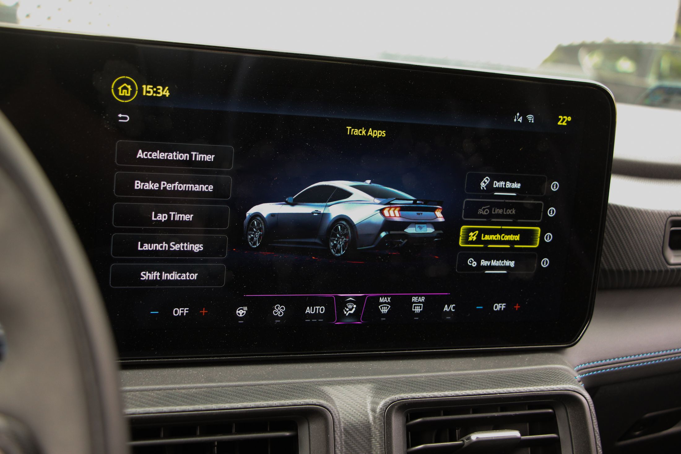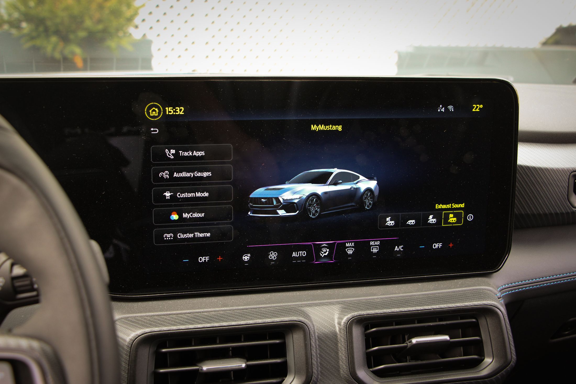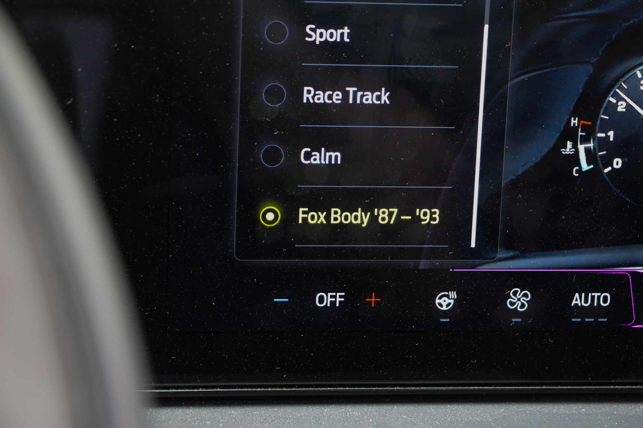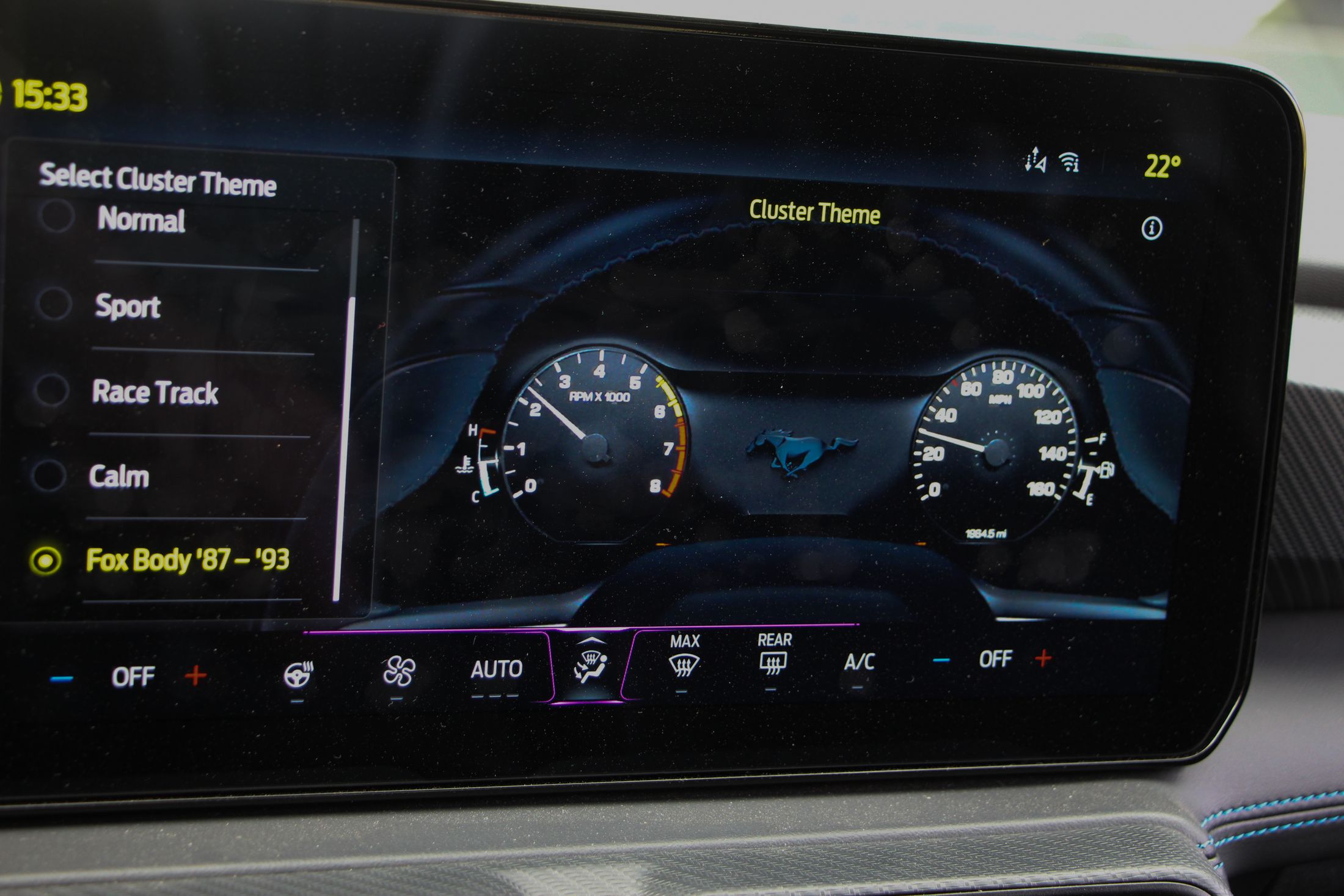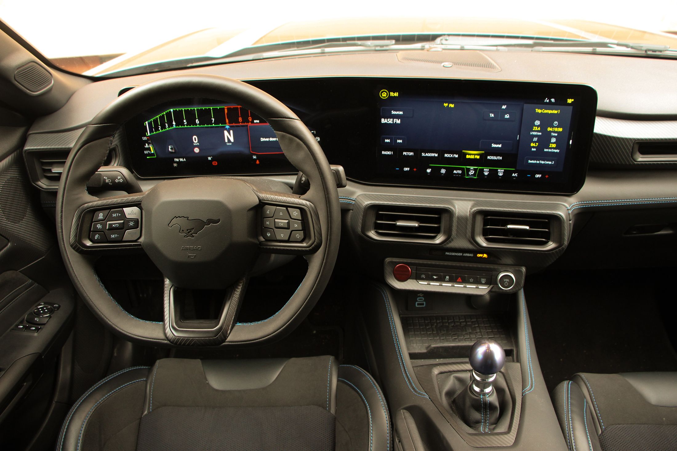 Ha kritikát kell megfogalmazni a Mustanggal kapcsolatban, akkor azt bent fogom megtenni. Ám ez is leginkább ízlés kérdése dolog. A digitális kijelzőkkel még csak-csak megbarátkozok. Jó nagyok, a vezető előtt 12,4 colos, a középkonzolon pedig 13,2 colos. A Sync4 még mindig nem tud magyarul, de ettől függetlenül egyszerű benne barangolni, könnyen megtanulható. Amiért gyorsan megbocsátottam a digitalizációt, az annak a lehetősége, hogy más modellek műszeregysége is megjeleníthető. Minden üzemmód saját megjelenítést kap, de ott volt a lehetőség pl. egy ’87-es Fox Mustang kijelzőit nézni. Ha ez a jövőben bővíthető lesz, akkor minden elismerésem.