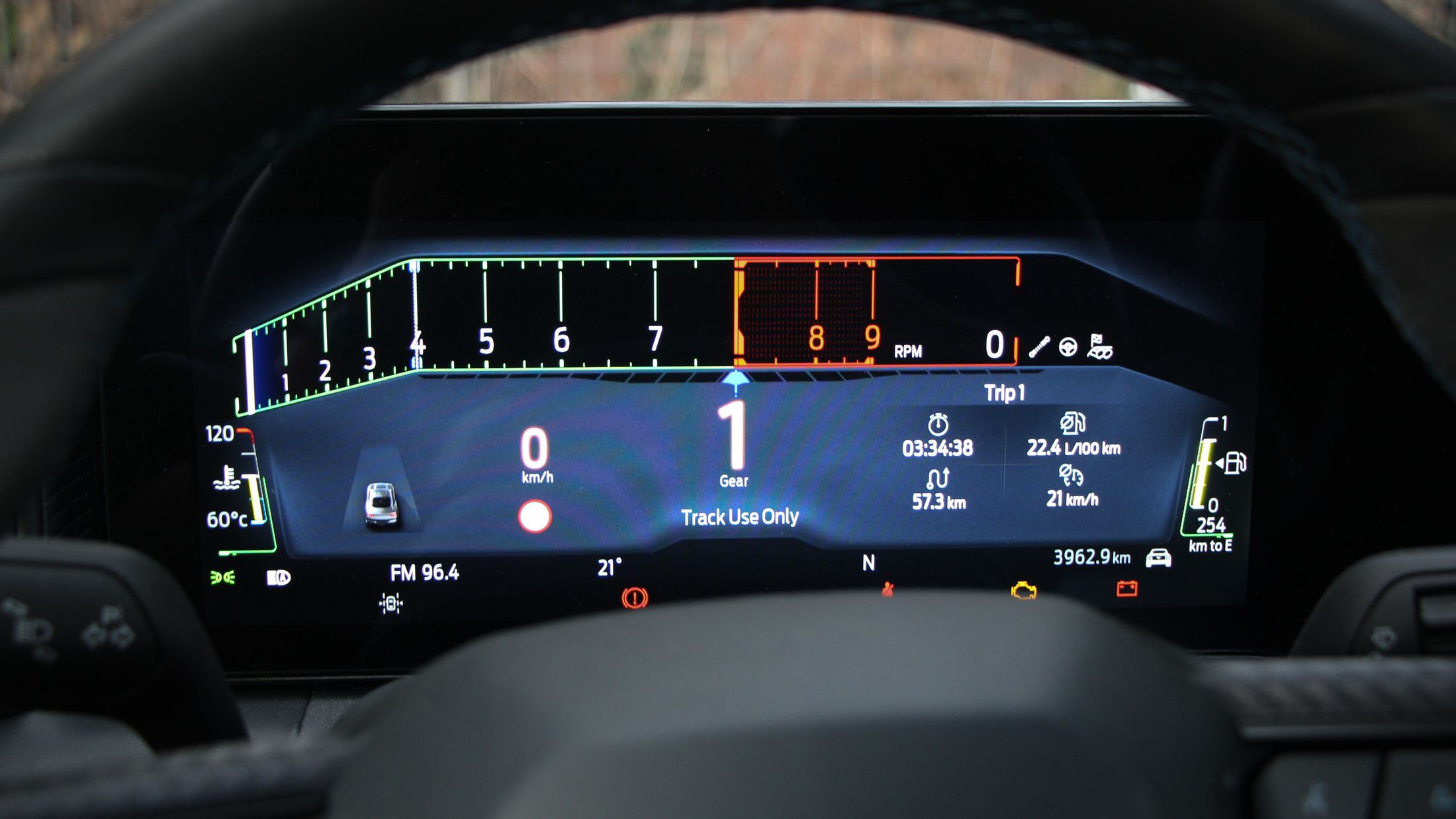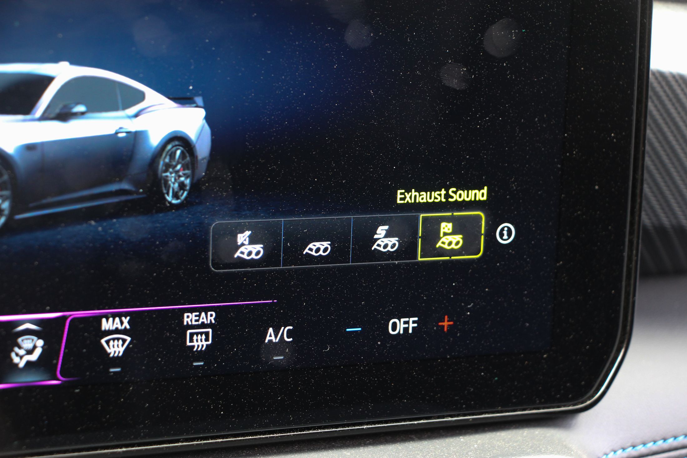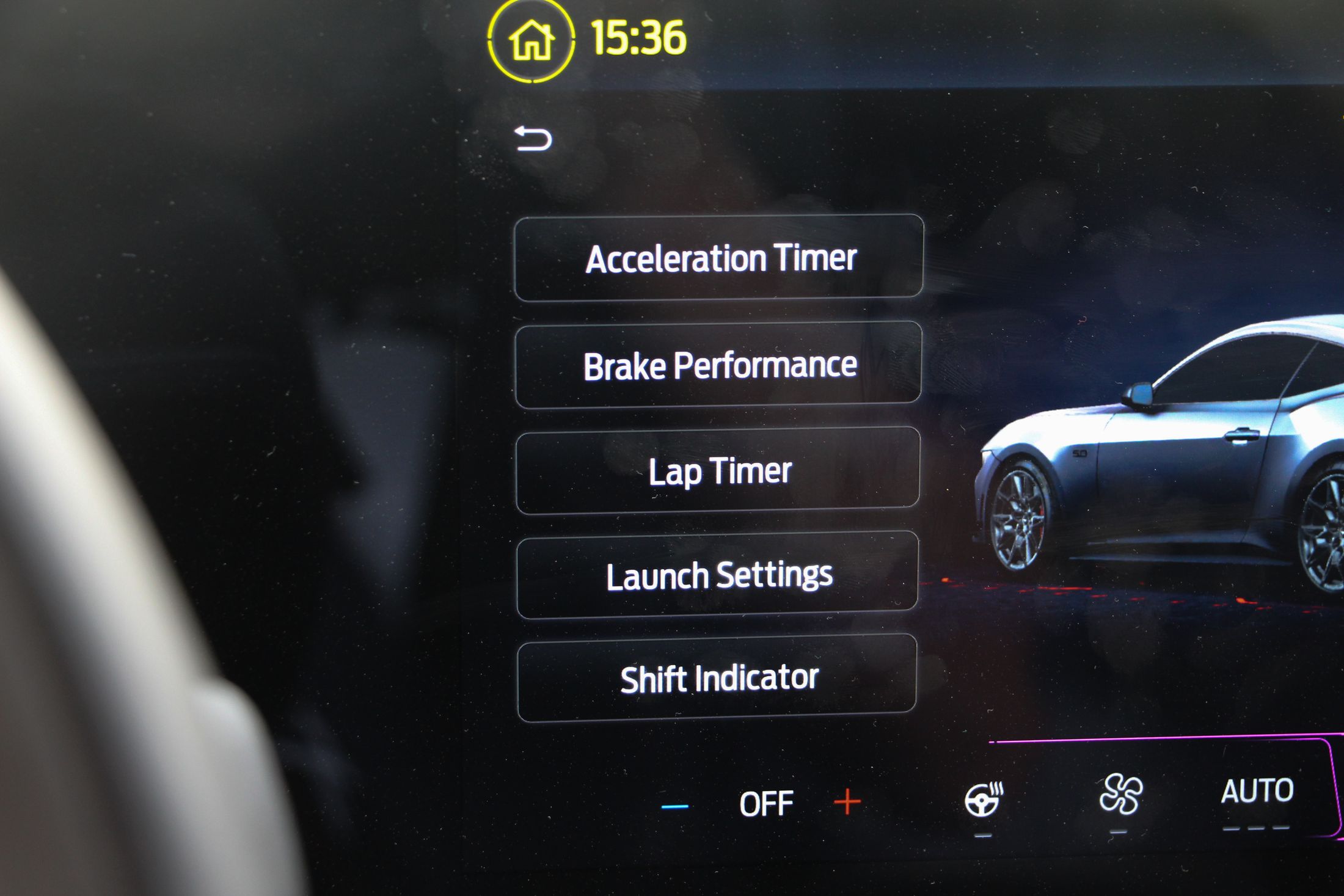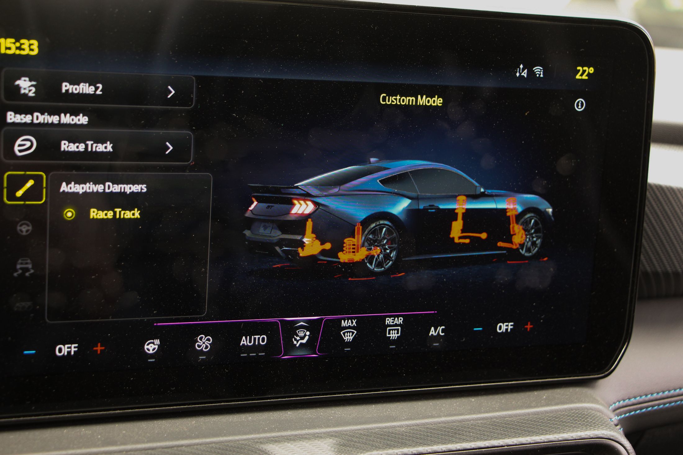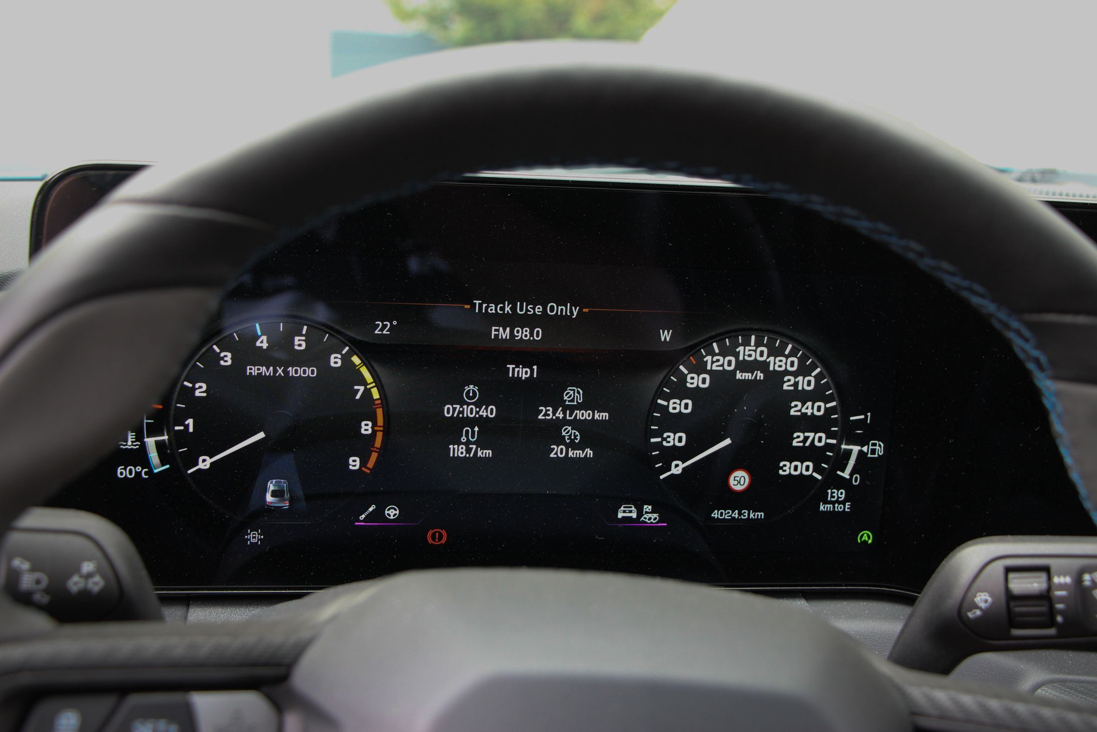 Ha kritikát kell megfogalmazni a Mustanggal kapcsolatban, akkor azt bent fogom megtenni. Ám ez is leginkább ízlés kérdése dolog. A digitális kijelzőkkel még csak-csak megbarátkozok. Jó nagyok, a vezető előtt 12,4 colos, a középkonzolon pedig 13,2 colos. A Sync4 még mindig nem tud magyarul, de ettől függetlenül egyszerű benne barangolni, könnyen megtanulható. Amiért gyorsan megbocsátottam a digitalizációt, az annak a lehetősége, hogy más modellek műszeregysége is megjeleníthető. Minden üzemmód saját megjelenítést kap, de ott volt a lehetőség pl. egy ’87-es Fox Mustang kijelzőit nézni. Ha ez a jövőben bővíthető lesz, akkor minden elismerésem.