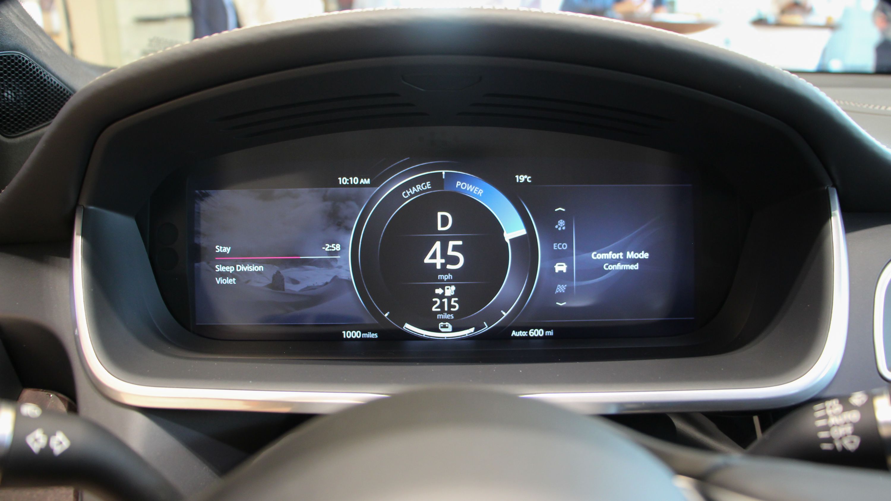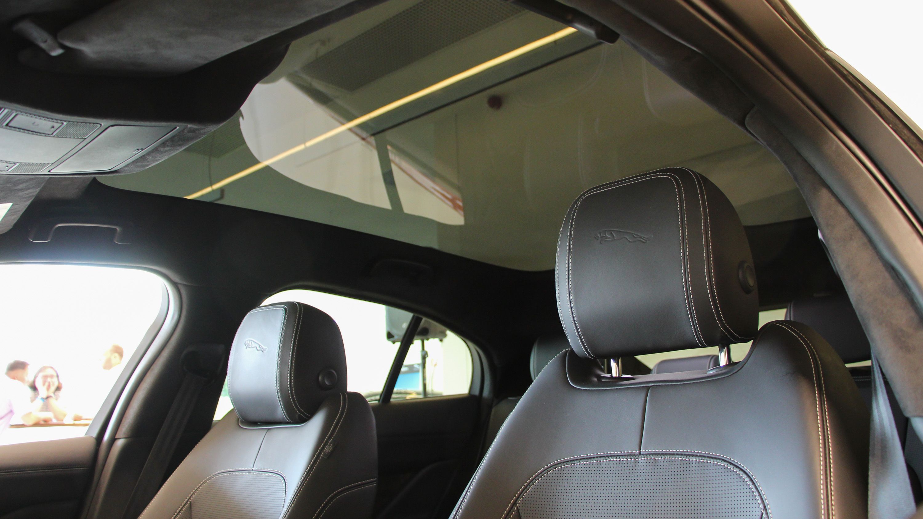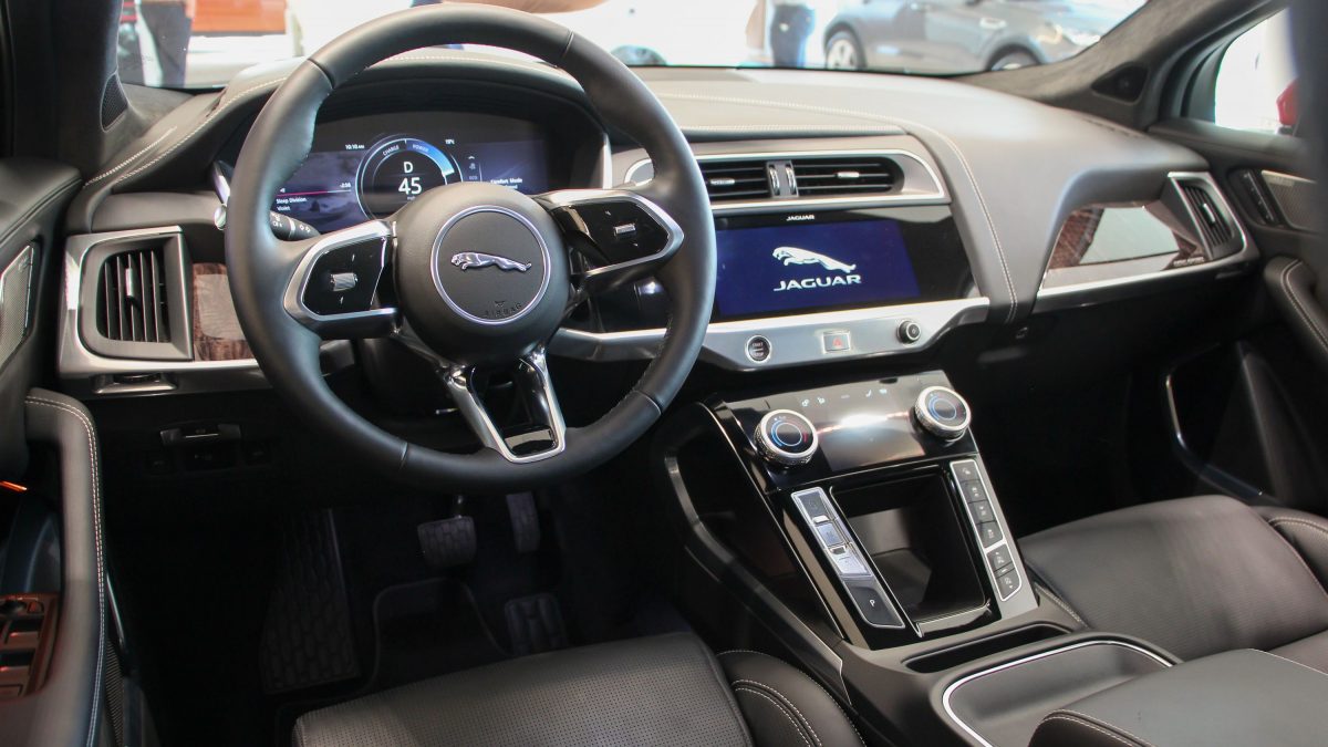 Tipikus Jaguar beltér, de már teljes egészében digitális műszerblokkal, váltókar helyett irányváltó gombokkal, meg persze jókora érintőpanellel és érintésérzékeny gombokkal is. Van hangvezérlés, sőt, beépített asszisztens is, az Amazon Alexa rendszerével