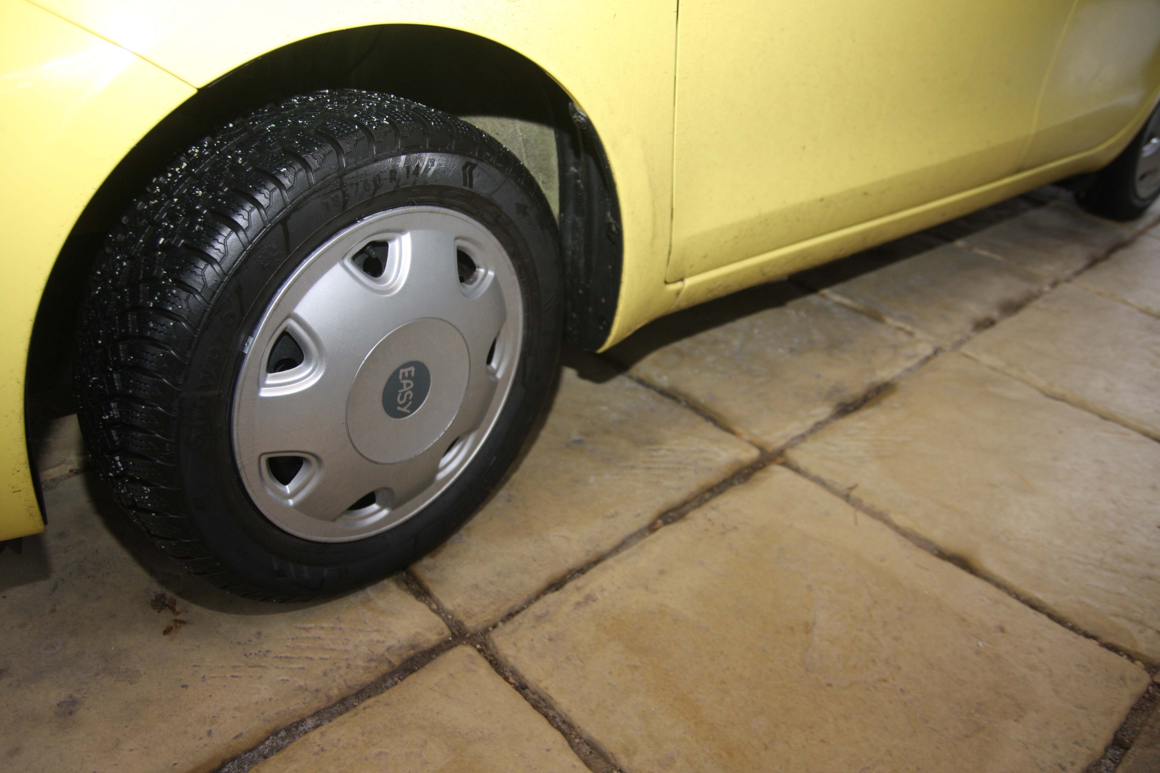 Míg nyári abroncsai gyári felniken gyári méretűek, telente eddig Wagon R-virslikerekeken futott a Yaris. Most a virslik helyett előre kolbászokat kapott - így se, úgy se az igazi