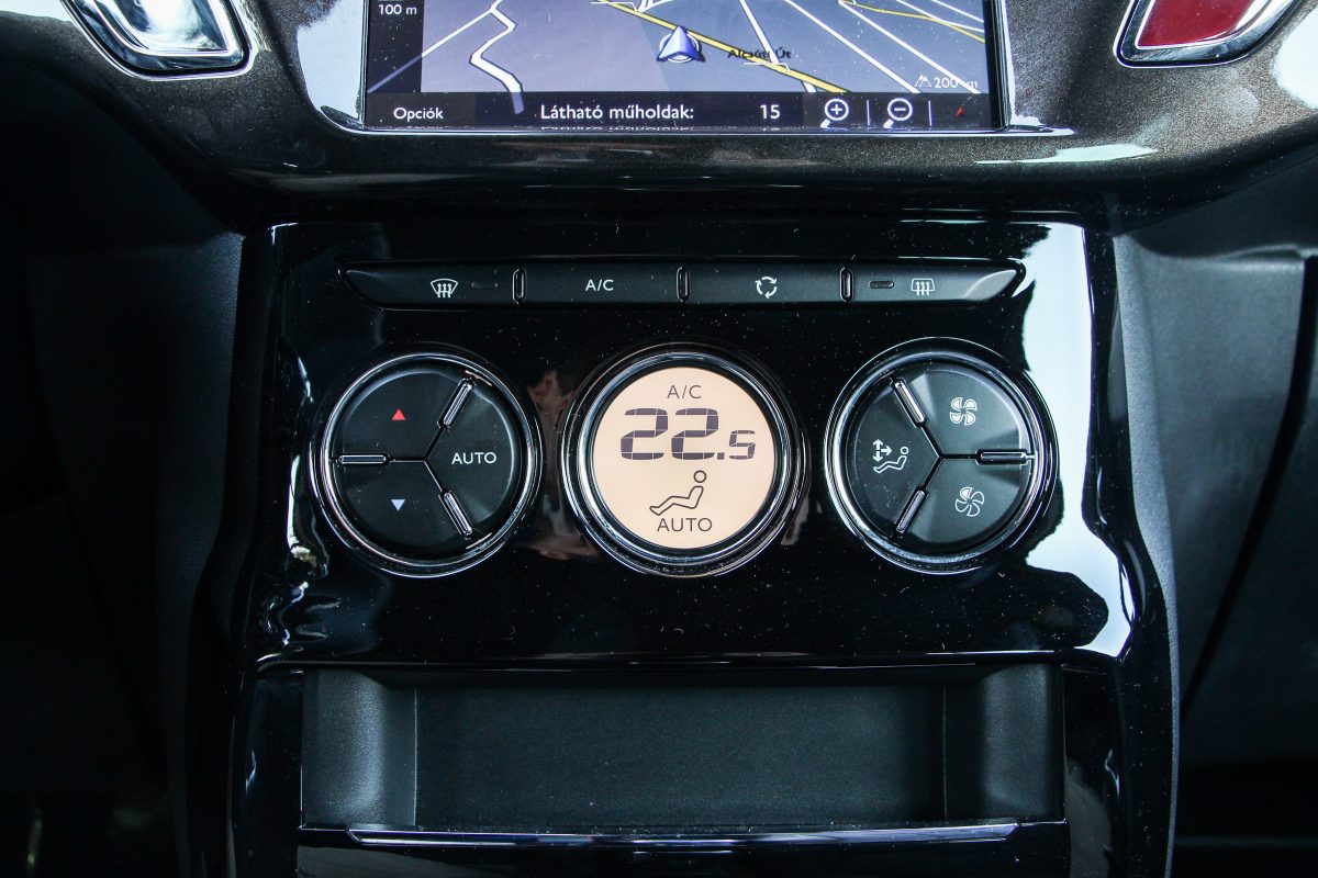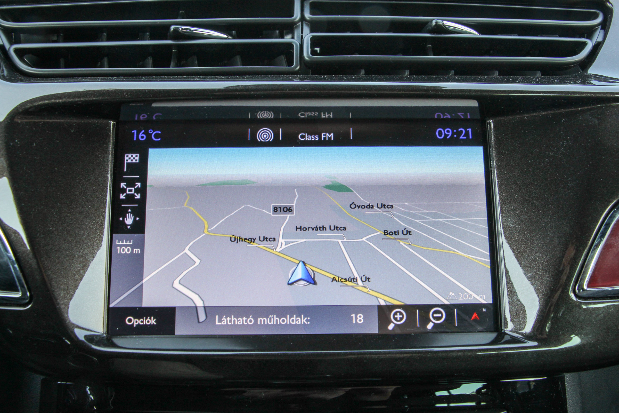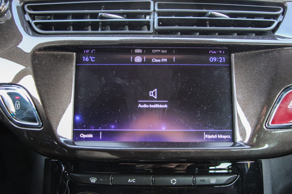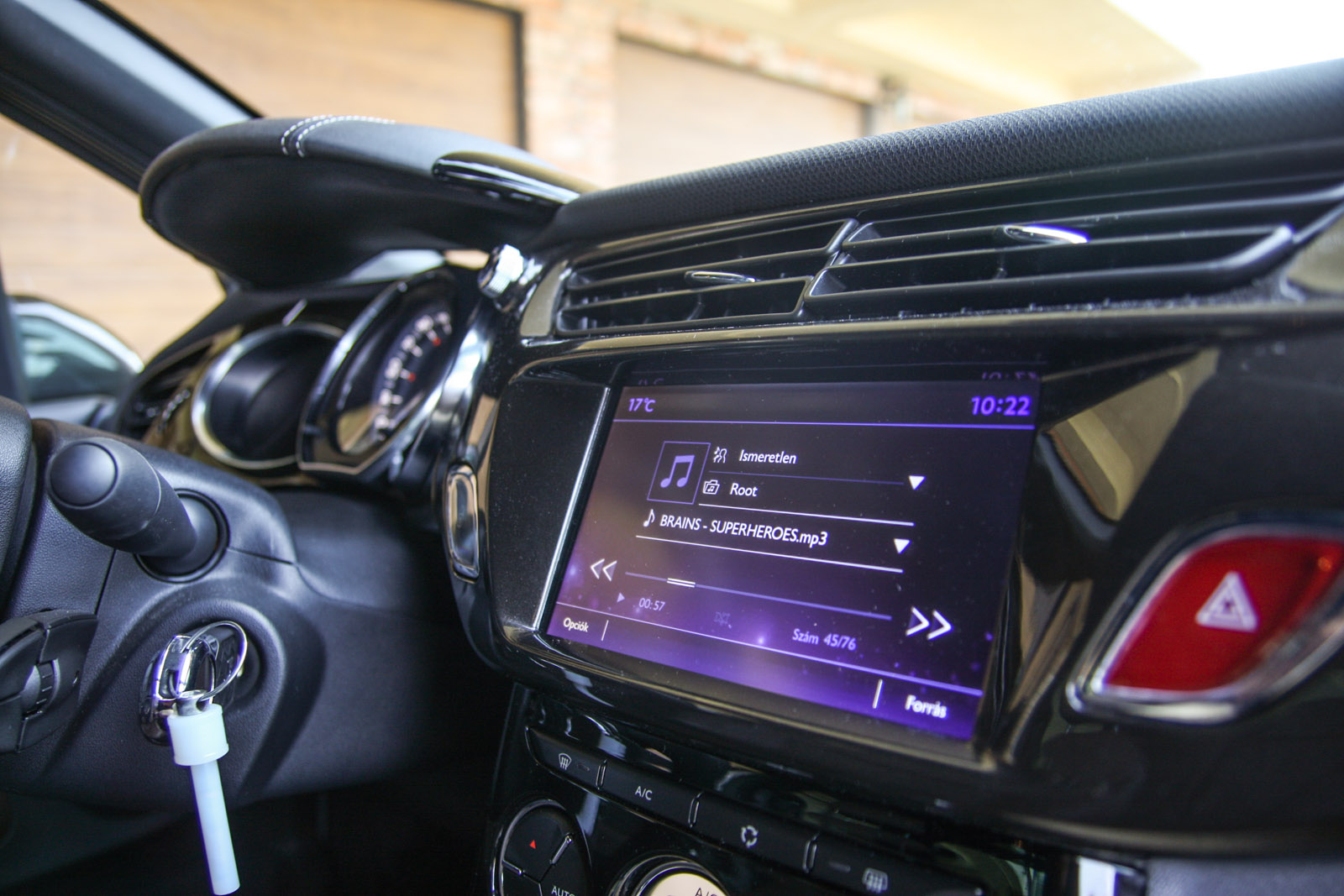 Jobb, de sajnos nem tökéletes. Aztán ott vannak a kezelőszervek, végre érintőkijelzővel szerelik a DS 3-at is, ez hatalmas ugrás az előd kényelmetlen, egészen mélyre helyezett kezelőgombjaihoz képest. Sokkal jobb így használni, viszont a rendszer nem áll a helyzet magaslatán. Egyrészt lassan indul, jellemzően indítás után mire behozná a tolatókamera képét, már túl vagyunk két tolatáson is, valamint ez a része többször le is fagyott, míg nálam volt. Valamint az egész logikája nehéz, a beállítások menüpont alatt kizárólag a hangzást tudjuk állítani, és a menetadatokat is itt tudjuk lekérdezni a kormány mögötti kapcsolóval, nem a műszerek között írja azokat ki. Ja, és van egy dedikált DS gomb is a váltó előtt, ami nyomkodható, de nem csinál semmit.