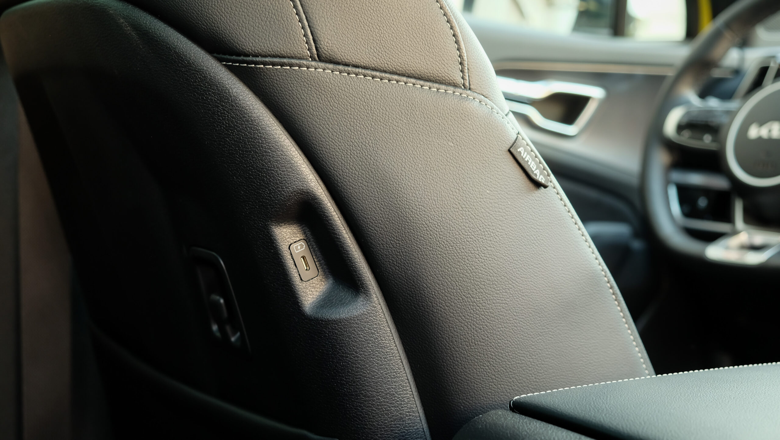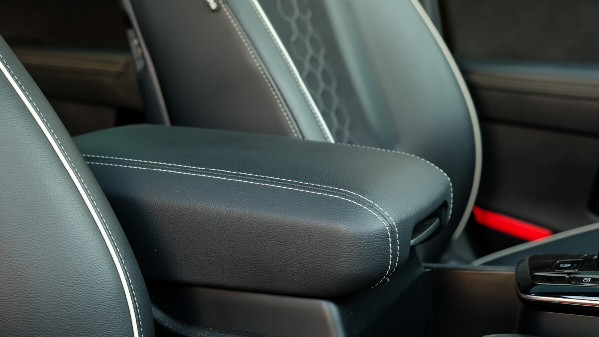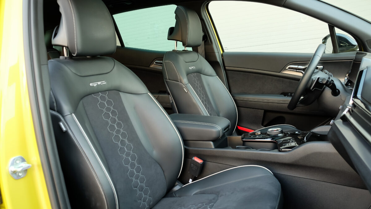 A kínálat csúcsán álló GT-Line nagyon jó tartású üléseket ad, ezek közepe hasított bőrszerű suede, széle műbőr borítást kap, felárért az ülőlapra kerül műbőr, már szellőztetéssel, a szélekre pedig suede kárpit. Ülésfűtés nem csak az első, hanem a szélső hátsó helyekre is jut, a kormánykerék is fűthető. Az ülések több mint gusztusosak fehér varrásukkal, a fontosabb persze a kényelmük, ami hátul is megvan. A támlák dőlése hátul is szabályozható, ráadásul 40:20:40 osztással. Utóbbiból kiolvasható: a középső ülőhely érezhetően szerényebb méretű, mint a két szélső. Lábtere annak ellenére alig szerényebb, hogy dupla légbeömlő, az első támlák merev hátuljába építve 1-1 szatyorakasztó és USB-C csatlakozó is jutott hátra. Akasztóból még kettőt kapunk: az első fejtámlák hátulja is egy hatalmas fogast formáz.