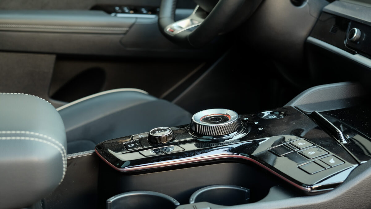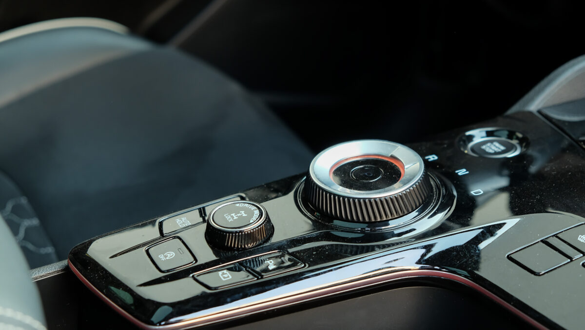 A műszerfal dizájnja ügyesen növeli az amúgy sem szerény szélesség érzetét. A körkapcsolós váltó előválasztó nem a leggyorsabb a duplakuplungos automatával. A menetmódválasztó a műszerblokk dizájnját is hangolja, közepét megnyomva az elektronikus vezérlésű összkerékhajtás egyenlő nyomatékosztásra kapcsolható