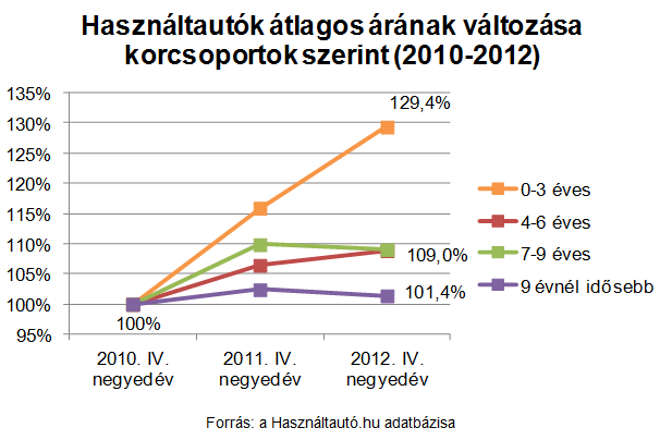A fiatal használt autók kínálata tehát szerény, ami pedig mégis elérhető, az drága. A kínálat szűkülése ugyanis ebben a szegmensben igen jelentős áremelkedést eredményezett: miközben az idősebb személykocsik esetében az elmúlt két évben mérsékelt árnövekedés vagy inkább a stagnálás volt a jellemző, a 0-3 éves, eladásra kínált autók átlagára a Használtautó.hu portálon közel 30 százalékkal emelkedett. Ezalatt az új autók ára alig változott.