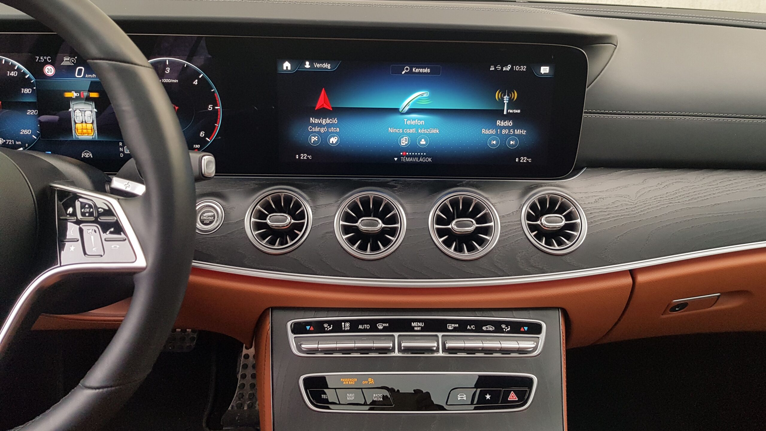 Bent sem kell csalódni, magával ragadó a hangulat, a színek, az anyagok, minden. Nincs a kardánalagútig lenyúló érintőképernyő, illetve fekhellyé alakítható jobb hátsó ülés, ám ezeken kívül egy S-osztályban éreztem magam. Nagyon magas a nívó, de az ergonómiáról sem feledkeztek meg. Könnyű az MBUX rendszer vezérlése, amit természetesen élő szóval is működésre lehet bírni. Rengeteg a menüpont, de logikus az elrendezés, szóval könnyű navigálni az infotainmentben, illetve a digitális műszeregységen. Egyedül a haptikus kormánygombokkal álltam kicsit hadilábon, de ott a tapipad, vagy az érintőképernyő is, ha nem akarná az igazságot az érintésérzékeny felület.