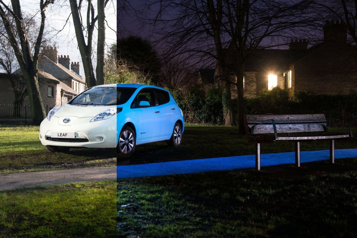 Éjjel és nappal a különleges fényezéssel borított Nissan Leaf, előtte pedig a "STARPATH", azaz az ugyancsak különleges bevonattal kezelt ösvény