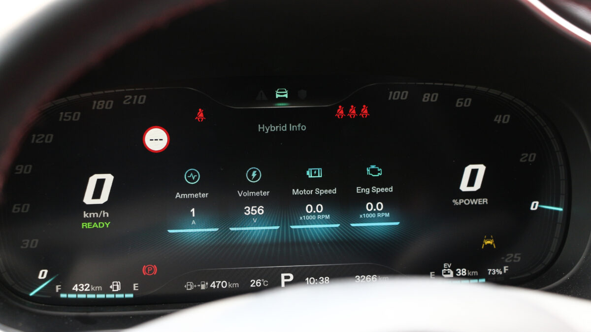 Egyszerre nagyon modern és kellően klasszikus a digitális műszeregység és a központi kijelző dizájnja, előbbi a villanymotor fordulatszámát is írja, nem csak a benzinmotorét