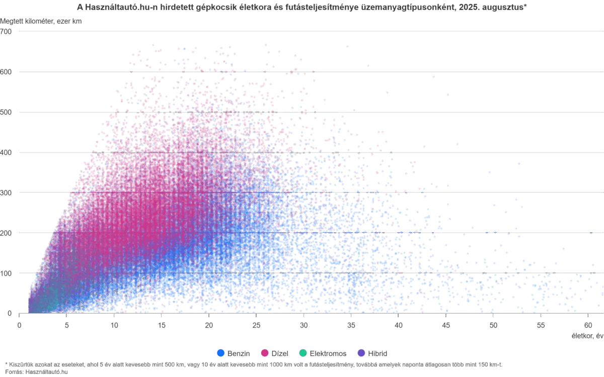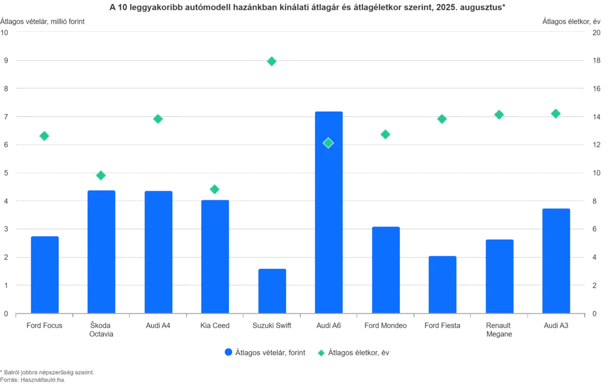 A különböző hajtású autók életkora és használtsága között is van különbség. A benzinesek átlagosan 14,1 évesek, míg a dízelek 12,4 évesek. Utóbbiak viszont jóval többet futottak: a dízel járművek átlagos futásteljesítménye 222 ezer kilométer, a benzineseké pedig 156 ezer kilométer - vagyis több mint 40 százalékos eltérés látszik. Ez a használati szokásokat is tükrözi, hiszen a dízel autókat jellemzően hosszabb utakra használják, ami viszont jóval kevésbé károsítja a jármű motorját és futóművét, mint a városi használat kilométerei. A leggyakrabban hirdetett márkák élén továbbra is a Volkswagen és a BMW állnak, a Ford pedig megelőzte az Opelt a harmadik helyért. Ezeket évek óta stabil kereslet jellemzi, nem véletlen, hogy a sorrend alig változott 2024 augusztusa óta. A 10-es listán a legalacsonyabb átlagéletkora a Kiának (9,3 év), míg a legmagasabb az Opelnek (13,8 év) volt augusztusban. A 2024. augusztusi adatokhoz képest egyedül a Suzuki életkora csökkent 0,3 évvel. A legnagyobb mértékű emelkedés pedig a BMW esetén következett be, amelynek átlagéletkora 0,5 évvel nőtt.