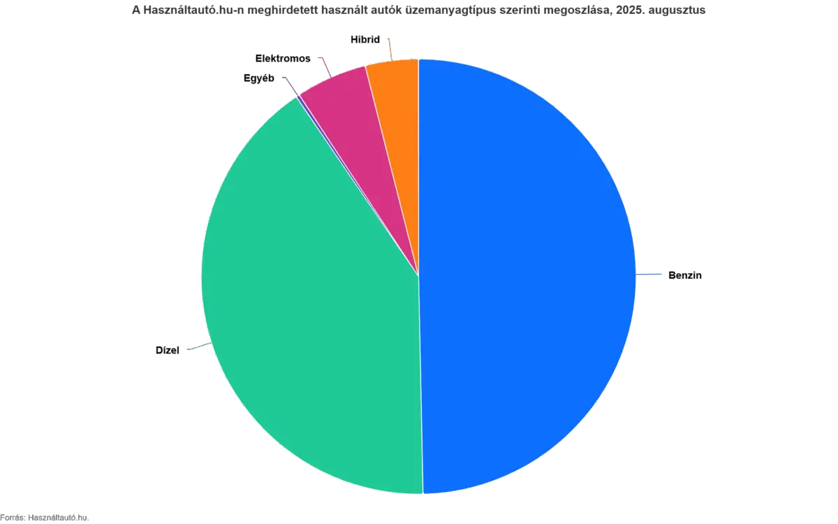 A használt autók piacán hazánkban 2025 augusztusában a meghirdetett járművek 39,3 százalékát 2,5 millió forint alatt, 26,6 százalékát 2,5–5 millió forint között, 21,0 százalékát 5–10 millió forint között és 13,1 százalékát 10 millió forint felett próbálták eladni. 2024 augusztusához viszonyítva a 2,5 millió forint alatti értékben autót kínáló hirdetések aránya 2,8 százalékkal csökkent, míg a 2,5–5 millió forint közöttieké 0,6 százalékkal növekedett. Az előző év azonos időszakához képest az 5–10 millió forint közöttieké 1,8 százalékkal, a 10 millió forint feletti hirdetések aránya pedig 0,4 százalékkal emelkedett. Az összes hirdetést figyelembe véve idén augusztusban a kínálati átlagár 5,5 millió, az előző év azonos időszakában pedig 5,3 millió forint volt. Az adatok nemcsak az árakról, hanem a kínálat szerkezetéről is pontos képet festenek. A hirdetett járművek fele benzines volt, míg 40,8 százalékuk dízelmotorral szerelt. Az alternatív hajtások súlya ugyan még mindig kisebb, de növekvő: elektromos autóból 5,3%, hibridből pedig 3,9% szerepelt a kínálatban. A legnagyobb bővülést az elektromos kategória produkálta: éves szinten 35 százalékkal nőtt a kínálatuk. A benzineseké 2,3 százalékkal, a dízelek száma 4 százalékkal, míg a hibrideké 1,7 százalékkal csökkent.