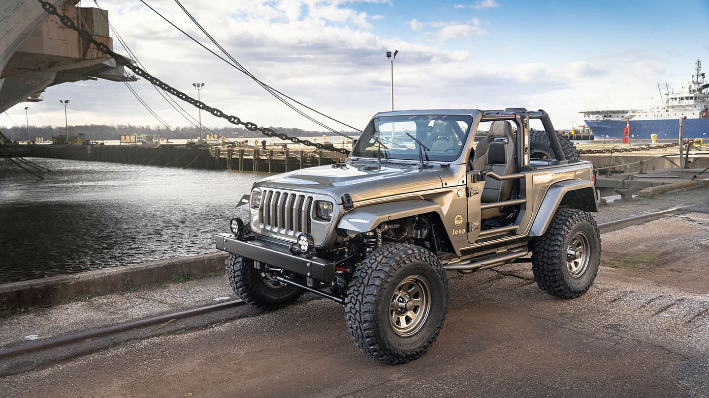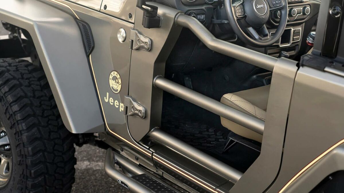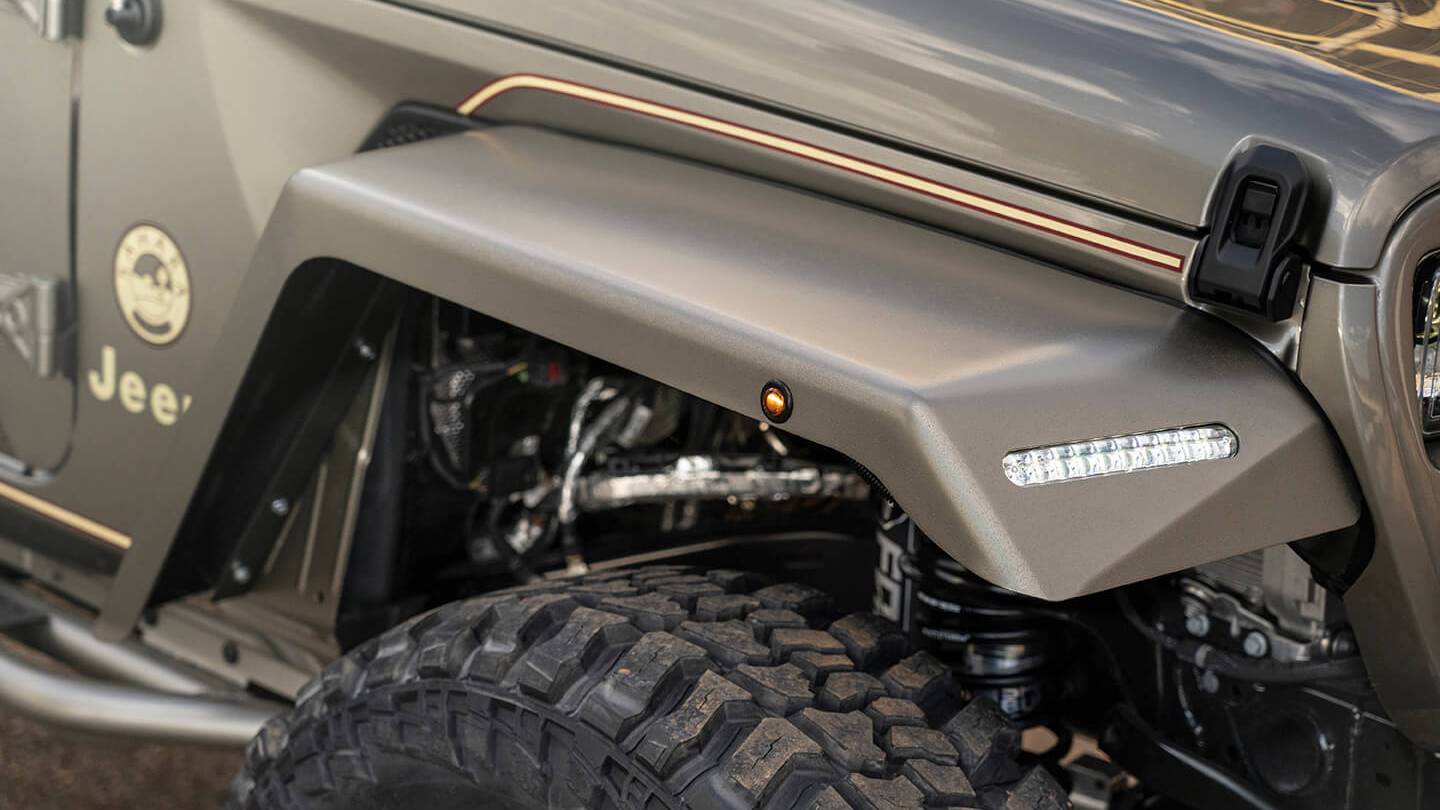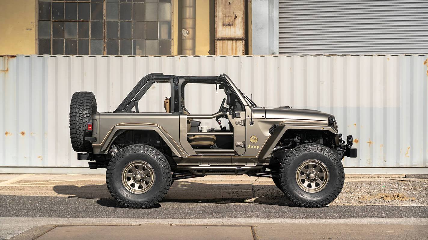 A karosszériához a legtöbb ponton hozzányúltak valamelyest, a legnagyobb változás persze elöl történt. A hatalmas acél lökhárítót egy filigrán, retro darabra cserélték, a kerek fényszórók helyére pedig az 1989-es Wrangler YJ Sahara lámpafészkeit építették, a lámpatestek pedig modern, ledes darabok. Az egyedi Wranglert az alapító, Ted Wentz II. egykori autójáról mintázták, a '89-eshez hasonló lökhárítókat, hűtőmaszkot és lámpákat építettek hozzá. Leszerelték az ajtókat és a tetőt, ennek helyére csak egy egyszerű ponyvát feszítettek ki az ülések fölé.