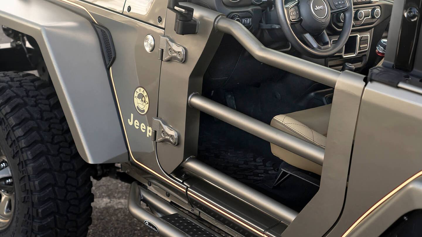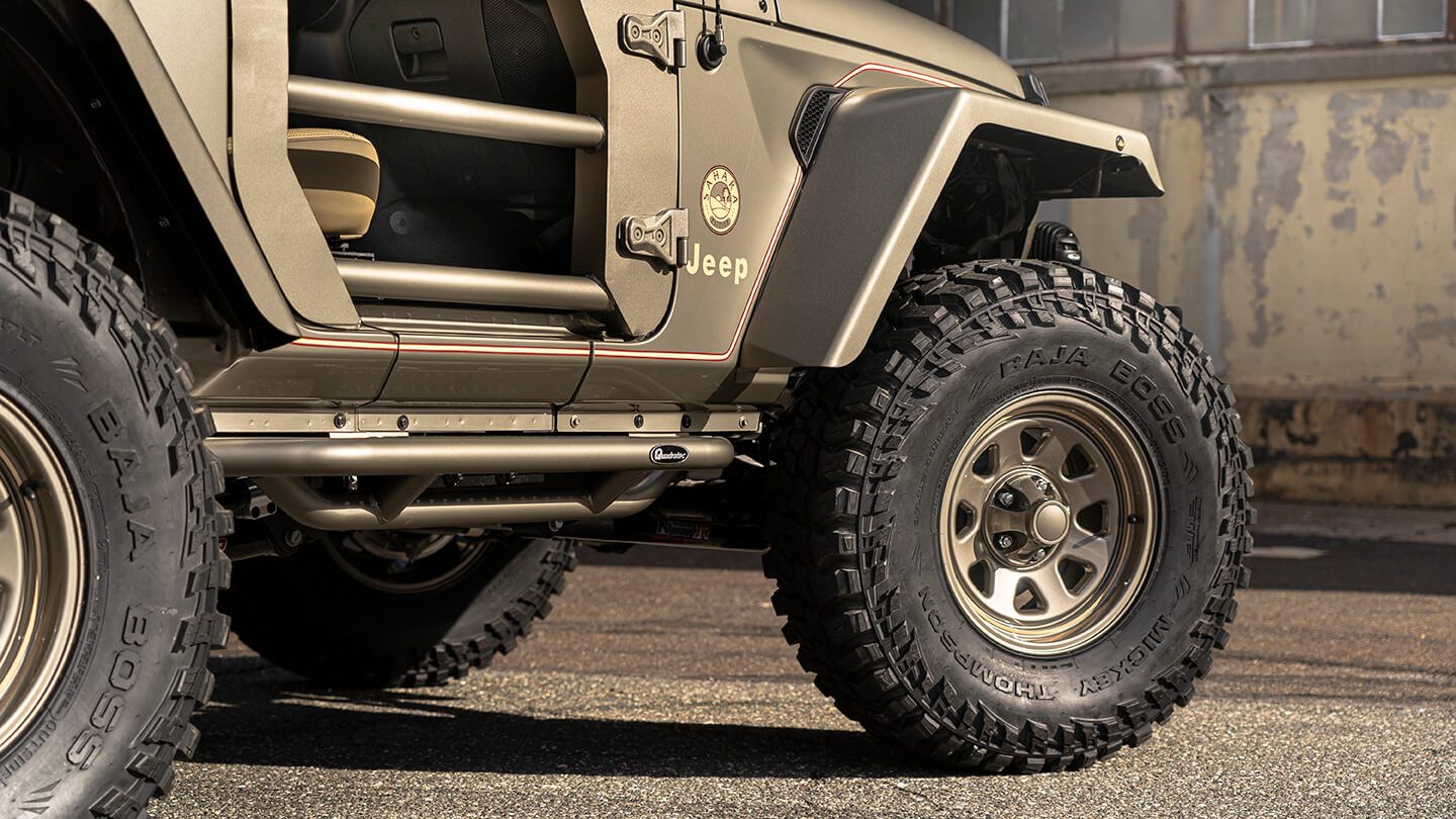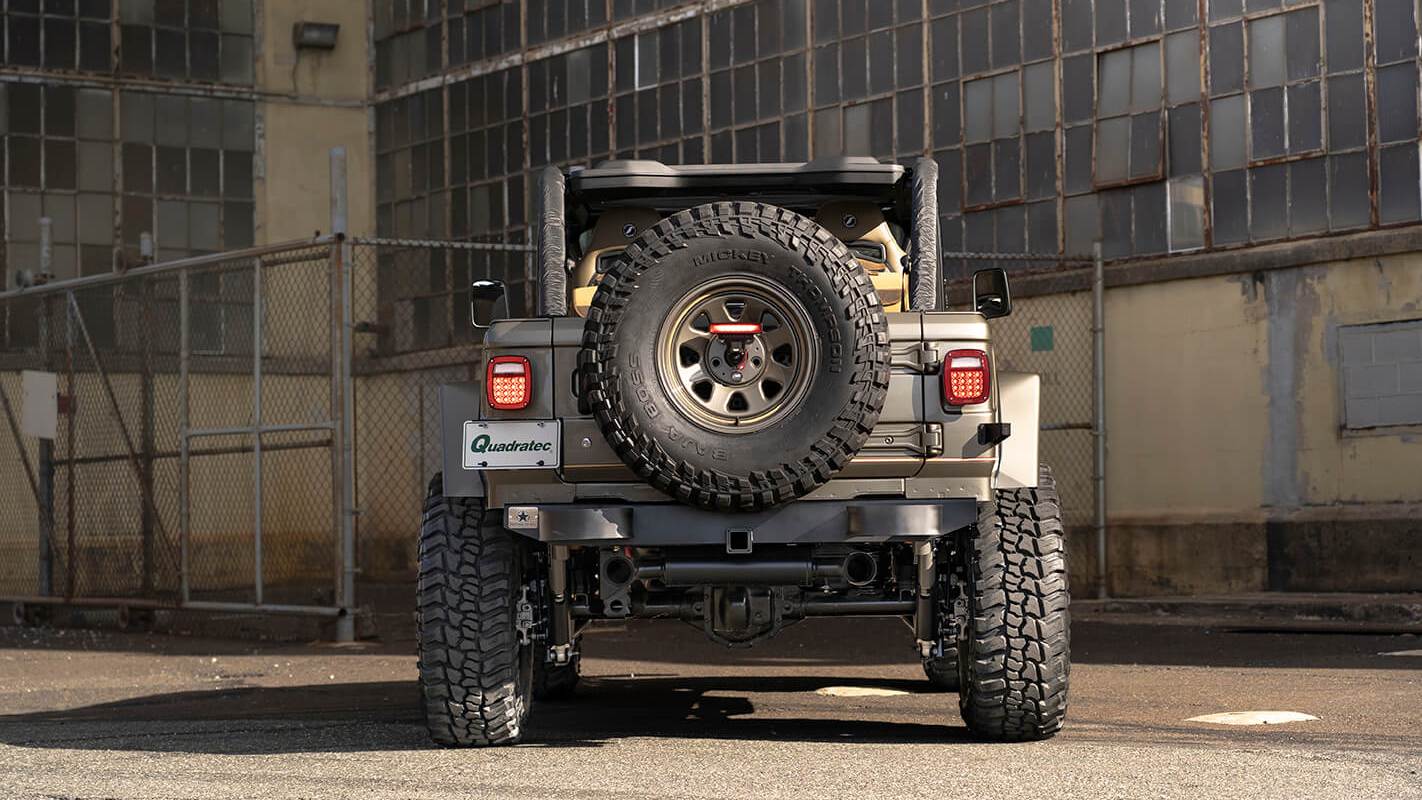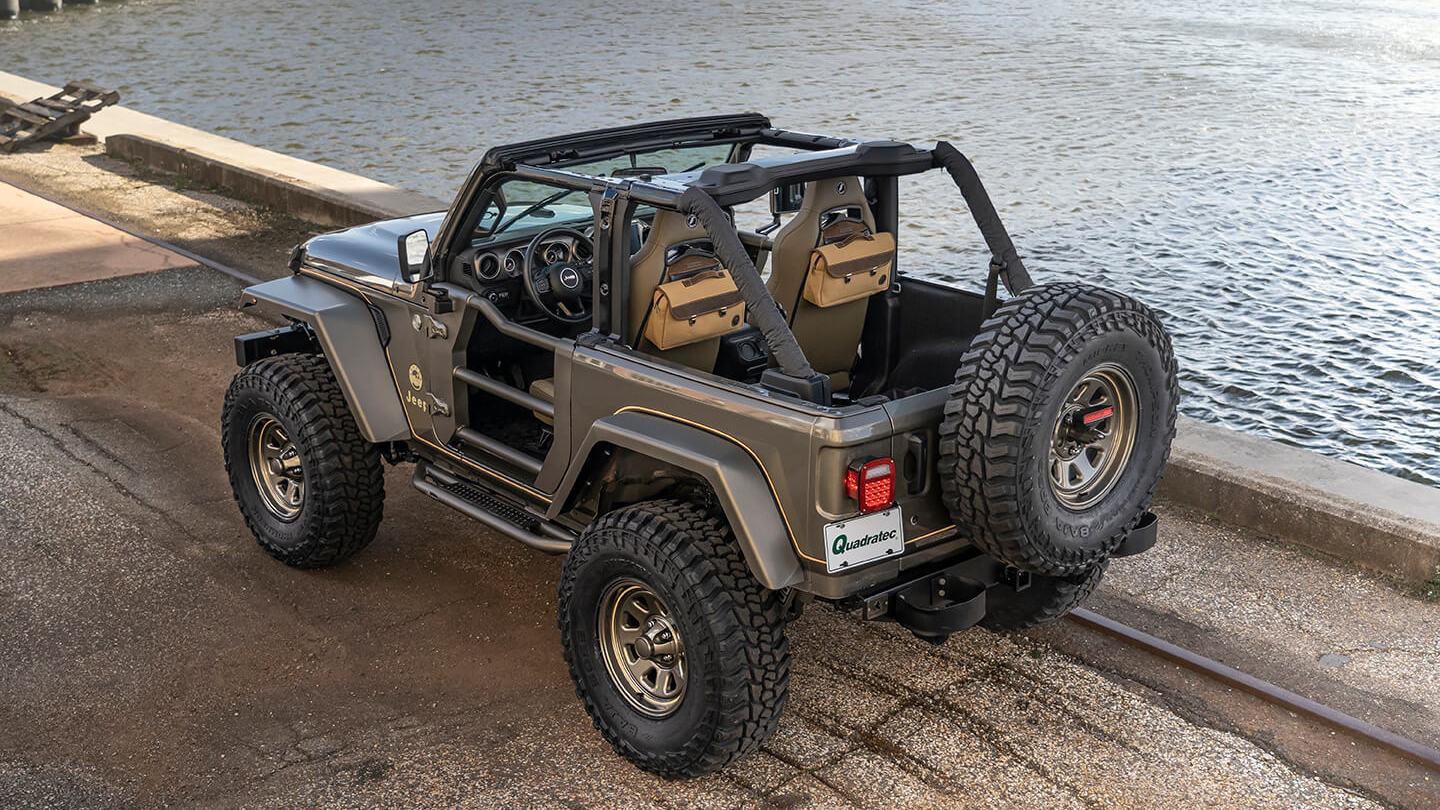 Kicserélték az összes lengőkart a Teraflex RT4 átalakító-kitjére, lengéscsillapítókat pedig a Falcontól rendeltek, ezek majdnem 9 cetit emeltek az autó hasmagasságán. 37 colos Mickey Thompson Baja Boss terepabroncsokat kapott retro megjelenésű felniken, melyet a Quadratec gyártat egyedi tervezés alapján. Egyedi sárvédőket és csövekből készült ajtókat szereltek rá, üléseit sportülésekre cserélték, hátukra pedig olyan táskákat terveztek, amik a '89-es Wranglerhez is rendelhetőek voltak. A Quadratec jelenlegi igazgatója, Ted Wentz III. annyit fűzött hozzá az autóhoz, hogy