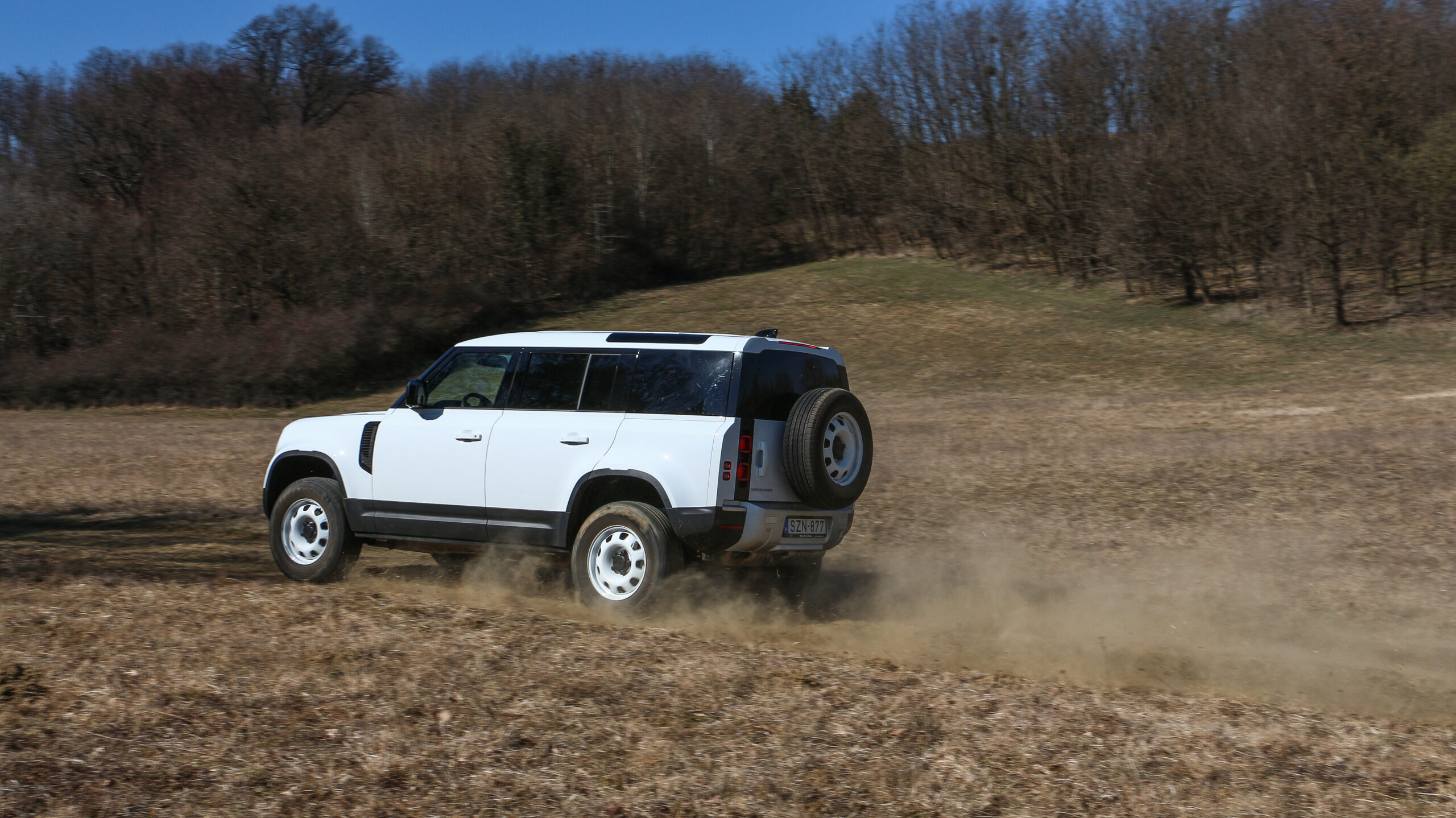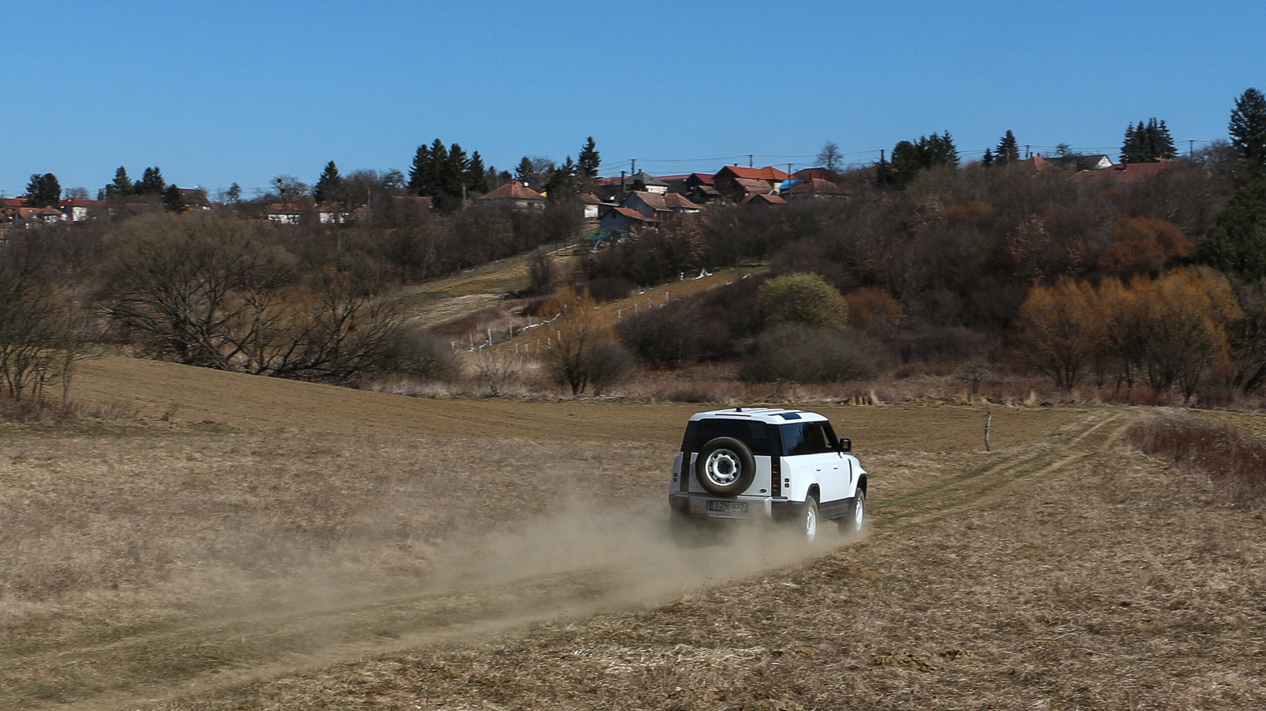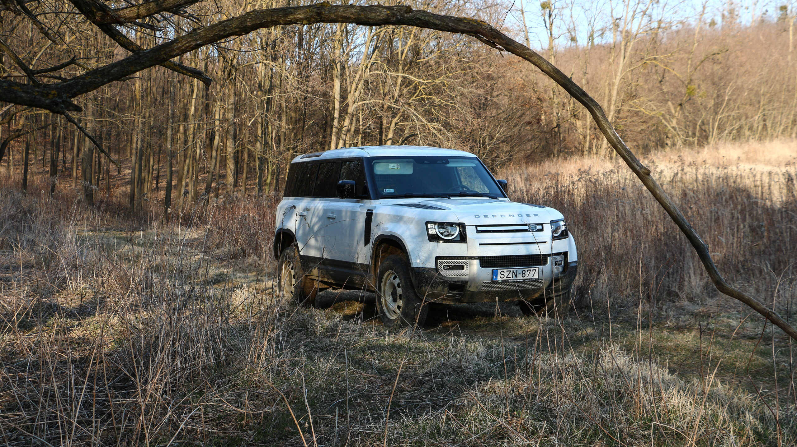 Sajnos a látogatásunkat megelőző hetek minimális csapadéka miatt sarat a kalandozásaink során nem találtunk, ezért következő délután ismét a nyakunkba vettük a dombságot, ám most a környező települések helyett az erdők mélyére indultunk. Elakadni szinte lehetetlen a Defenderrel, első terepszöge a legmagasabb futóműállásban ugyanis 37,5°, a két tengely közt 27,8 fokkal számolhatunk, hátul pedig 40 fokos az elhagyási szög. A megindulásokat ráadásul nagyon finoman csinálja: ha kell, akkor ügyesen kúszik ki a megfelelő beállítások segítségével bármiből. A másik megoldás, hogy rátiporsz a gázra terepmódban, és majdcsak megoldja az elektronika: ezzel a módszerrel is 100 százalékos volt a sikerrátája az autónak. Ez persze közel sem meglepő a 3,0 literes, sorhatos turbódízel erőforrás 250 lóereje és 600 newtonméteres csúcsnyomatéka láttán, állítólag a személyautó változatban kapható négyhengeres dízellel mindez egyáltalán nem ilyen egyértelmű.