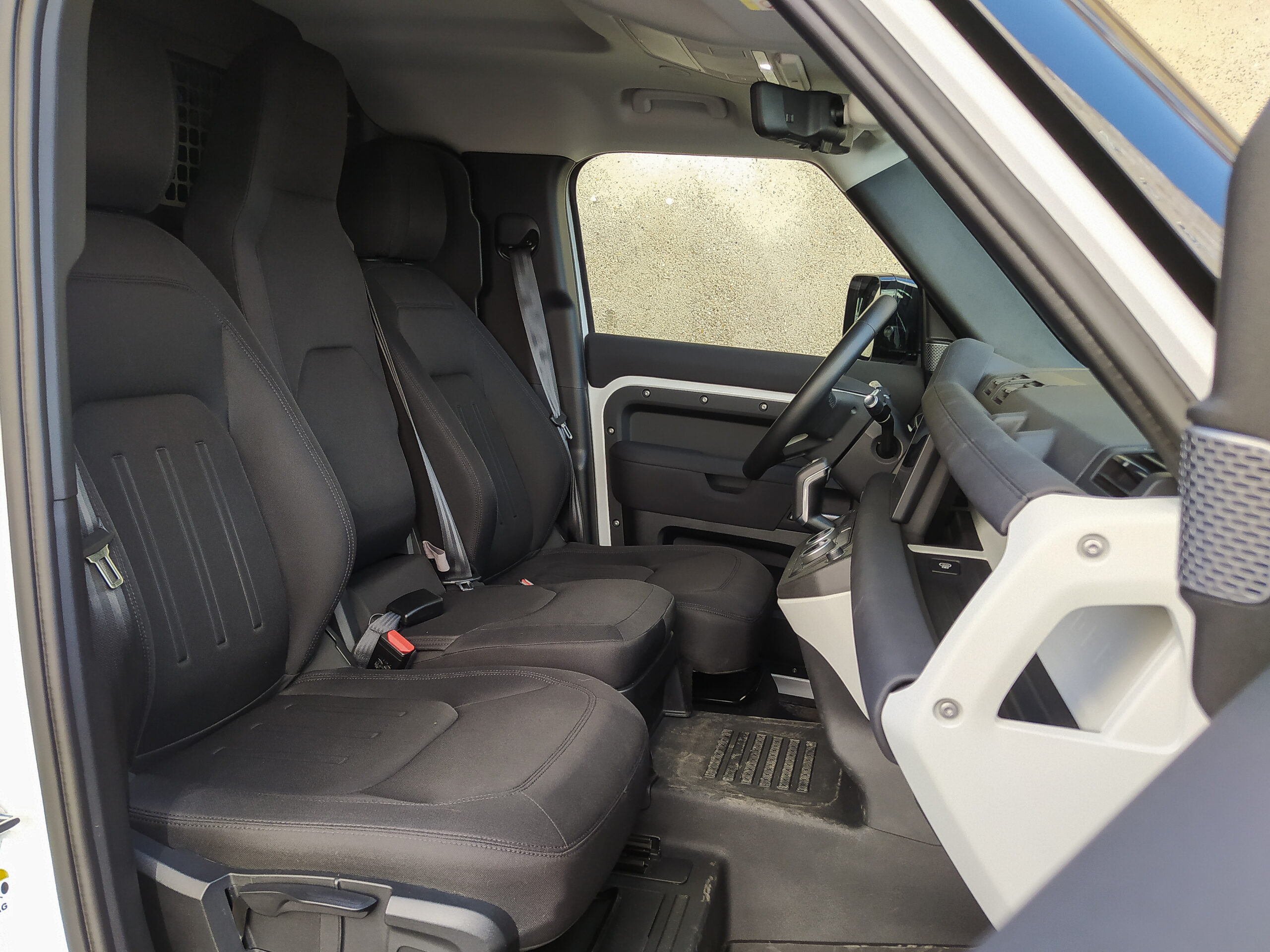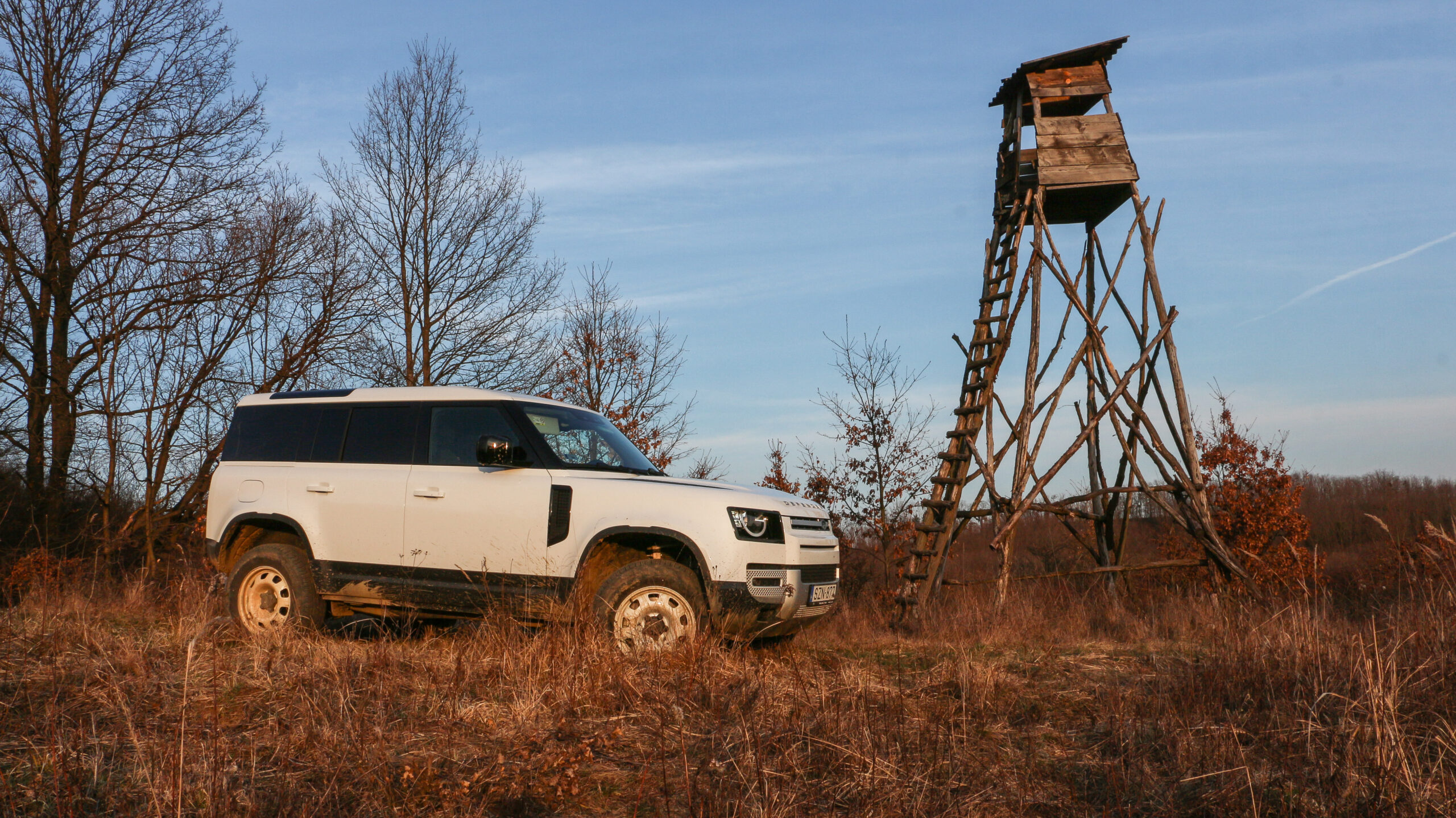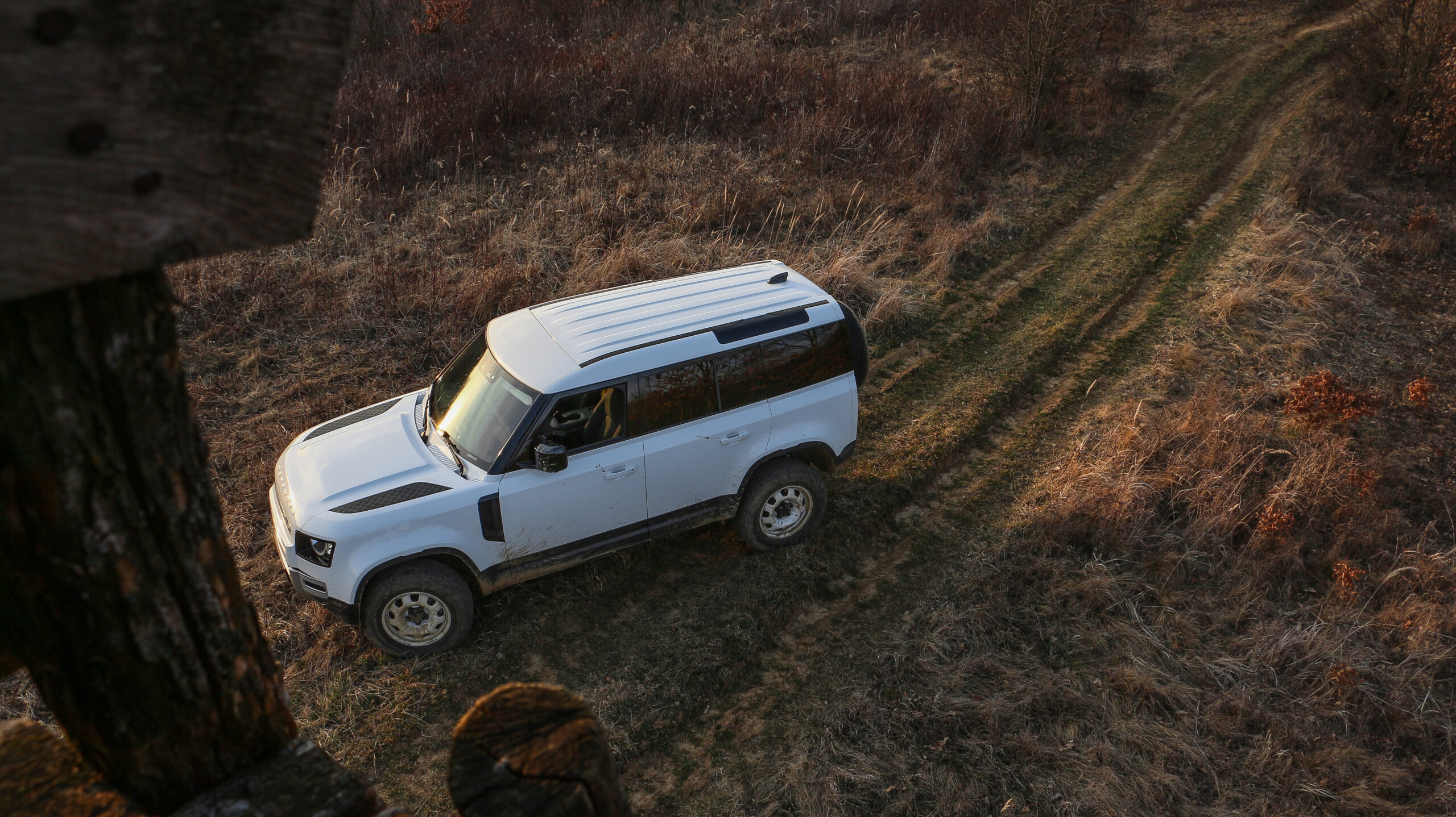 Sajnos a látogatásunkat megelőző hetek minimális csapadéka miatt sarat a kalandozásaink során nem találtunk, ezért következő délután ismét a nyakunkba vettük a dombságot, ám most a környező települések helyett az erdők mélyére indultunk. Elakadni szinte lehetetlen a Defenderrel, első terepszöge a legmagasabb futóműállásban ugyanis 37,5°, a két tengely közt 27,8 fokkal számolhatunk, hátul pedig 40 fokos az elhagyási szög. A megindulásokat ráadásul nagyon finoman csinálja: ha kell, akkor ügyesen kúszik ki a megfelelő beállítások segítségével bármiből. A másik megoldás, hogy rátiporsz a gázra terepmódban, és majdcsak megoldja az elektronika: ezzel a módszerrel is 100 százalékos volt a sikerrátája az autónak. Ez persze közel sem meglepő a 3,0 literes, sorhatos turbódízel erőforrás 250 lóereje és 600 newtonméteres csúcsnyomatéka láttán, állítólag a személyautó változatban kapható négyhengeres dízellel mindez egyáltalán nem ilyen egyértelmű.