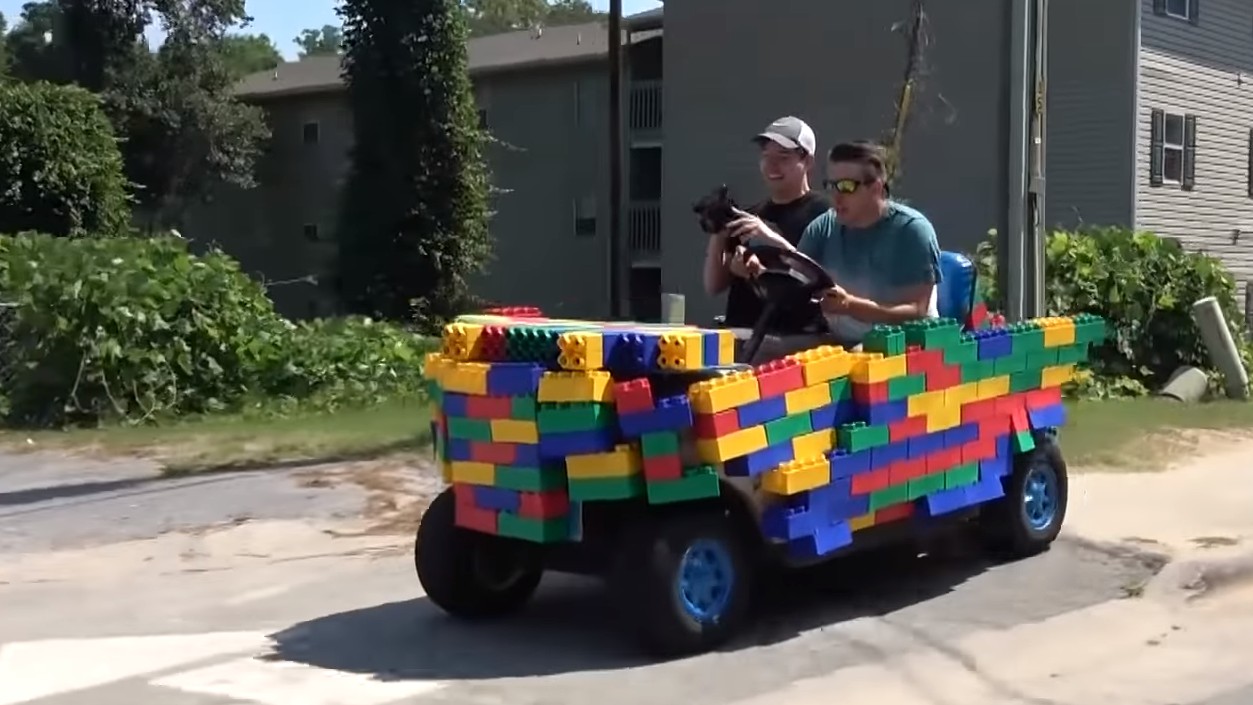 Két golfkocsi lesz a Lego kockák alatt lecsupaszítva, bár ahol megállítják őket, próbálják beadni, hogy minden a nagy Lego kockákból épült, ám nyilván nem. Készültek két biztosítóautóval, meg jó pár kamerával és útnak indultak, szerencsére elég lassan ahhoz, hogy nagy baj ne történhessen. Azért Amerikában sem szabad mindent, ott is kellenek lámpák, irányjelzők, tükrök egy járműre, hogy közlekedhessen, ki is kapták őket a forgalomból. Ám a mókát ismerő rendőrök bármiféle büntetés nélkül engedték el a srácokat, na persze a kocsikat nem engedték vissza az utcára. Utazásuk során betértek pár helyre és próbáltak csalni is, hogy hamarabb odaérhessenek, ám Mario Kart stílusban voltak nehezítések is, megéri végignézni!