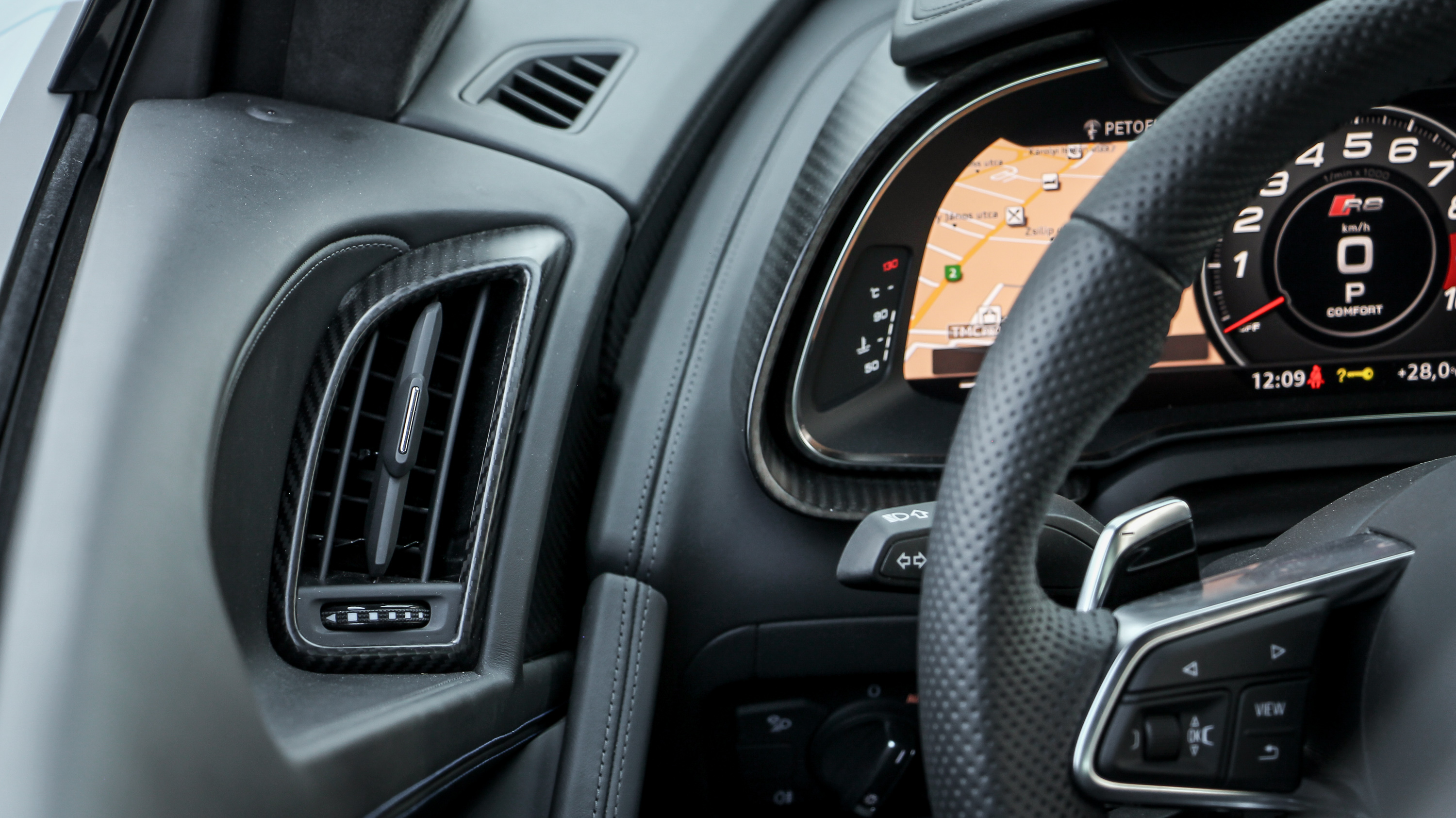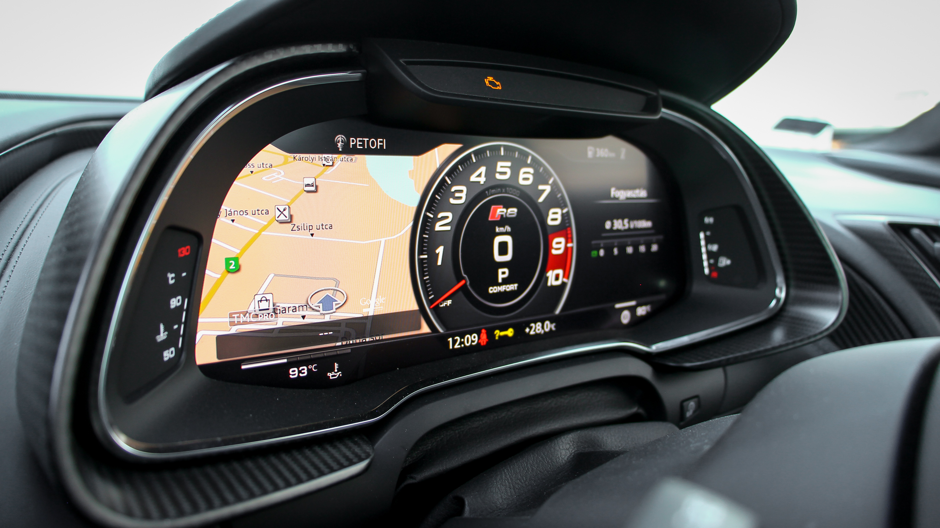 Hidegindításkor érdemes a kutyát odébb tessékelni, a gyerekekre fülvédőt adni, a szomszédokat meg meghívni egy sörre előző nap, mert ha reggel váratlanul arra ébrednek, hogy az R8 beindul, abban nem lesz köszönet.Tűéles képével igazán jól használható a virtual cockpit, minden infót megkapunk rajta, a legtöbbet egyszerre is
