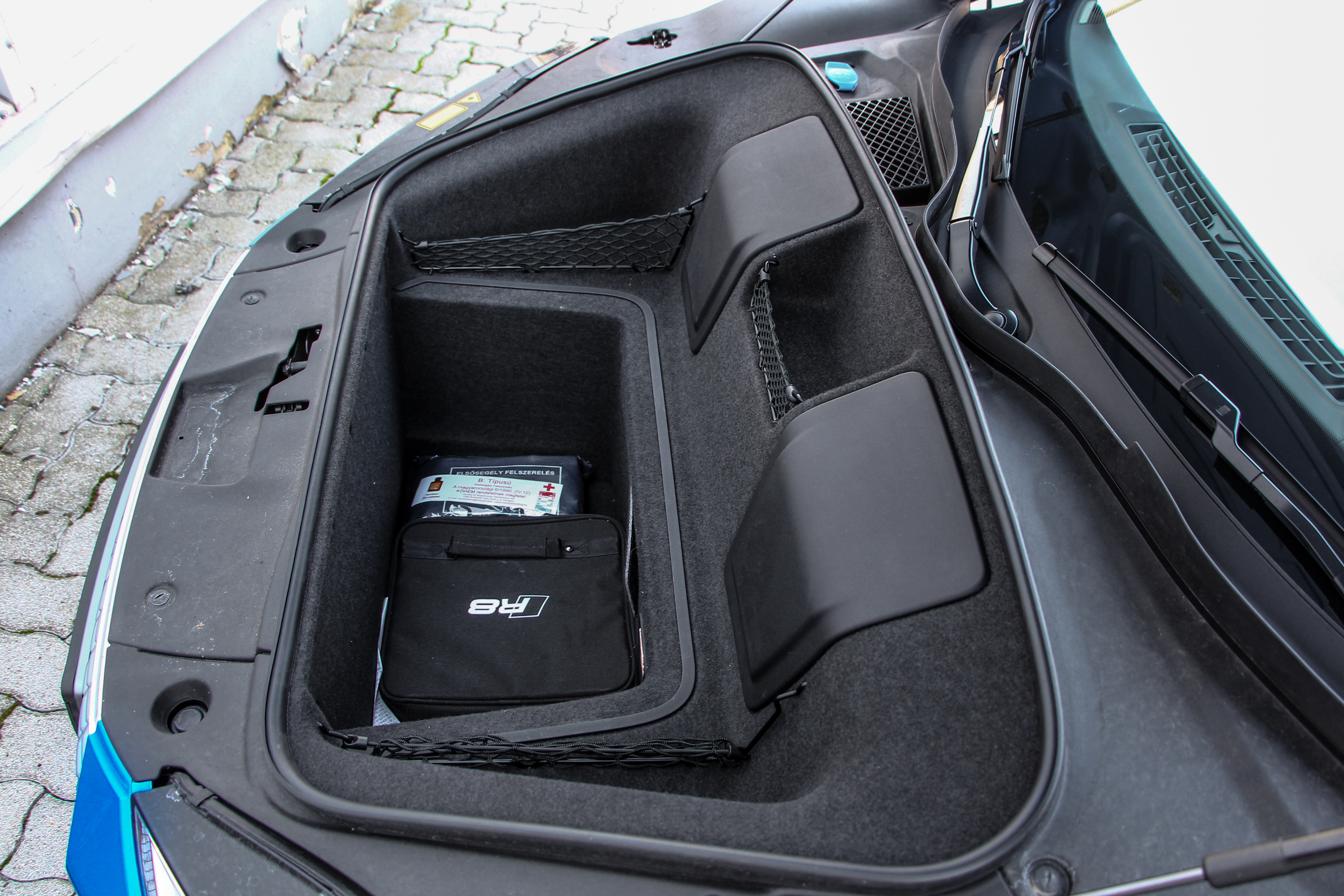 Hat centi híján két méter széles, de csak 1240 milliméter magas, vagyis úgy derékmagasságig ér, hosszra meg alig több mint egy Golf. Nem mindennapiak az arányai, a klasszikus szupersportautós elrendezés szerint nagyon előretolták a kabint, rövid az orra, annál hosszabb a feneke. Ha már kupé, jobban szeretem, ha ez fordítva van, de nyilván tudjuk, hogy ez miért van így az R8-nál, az ülések mögött 5,2 liternyi őrületnek kellett helyet találni.